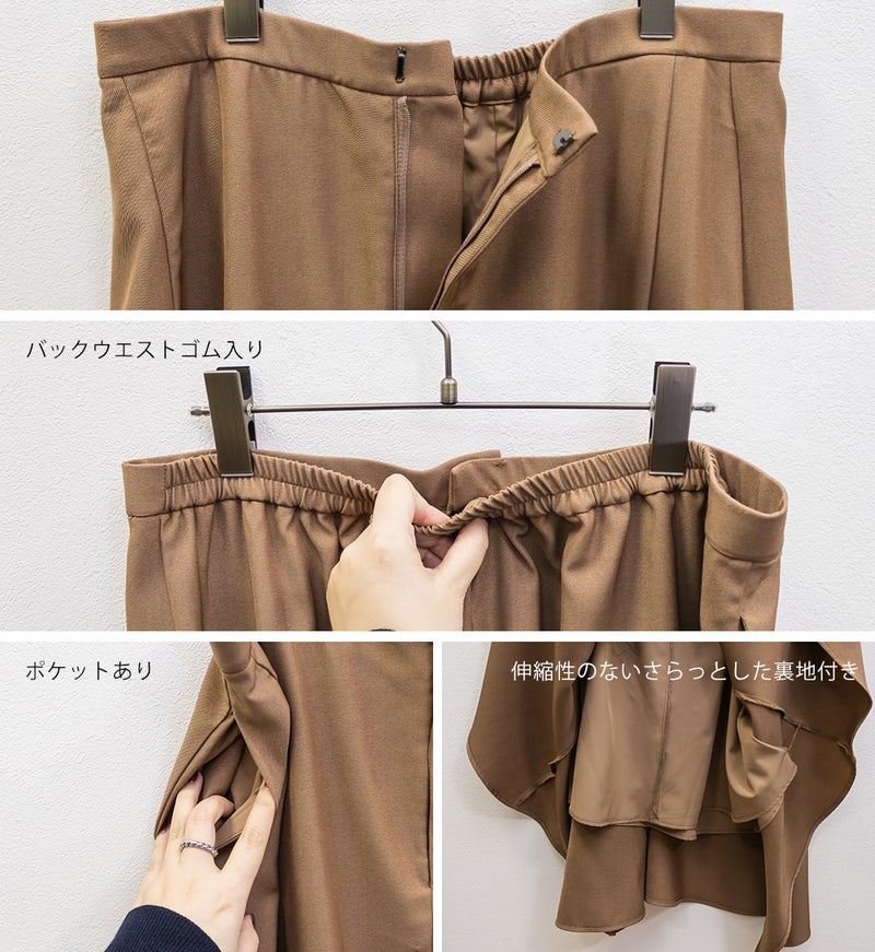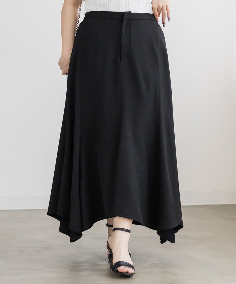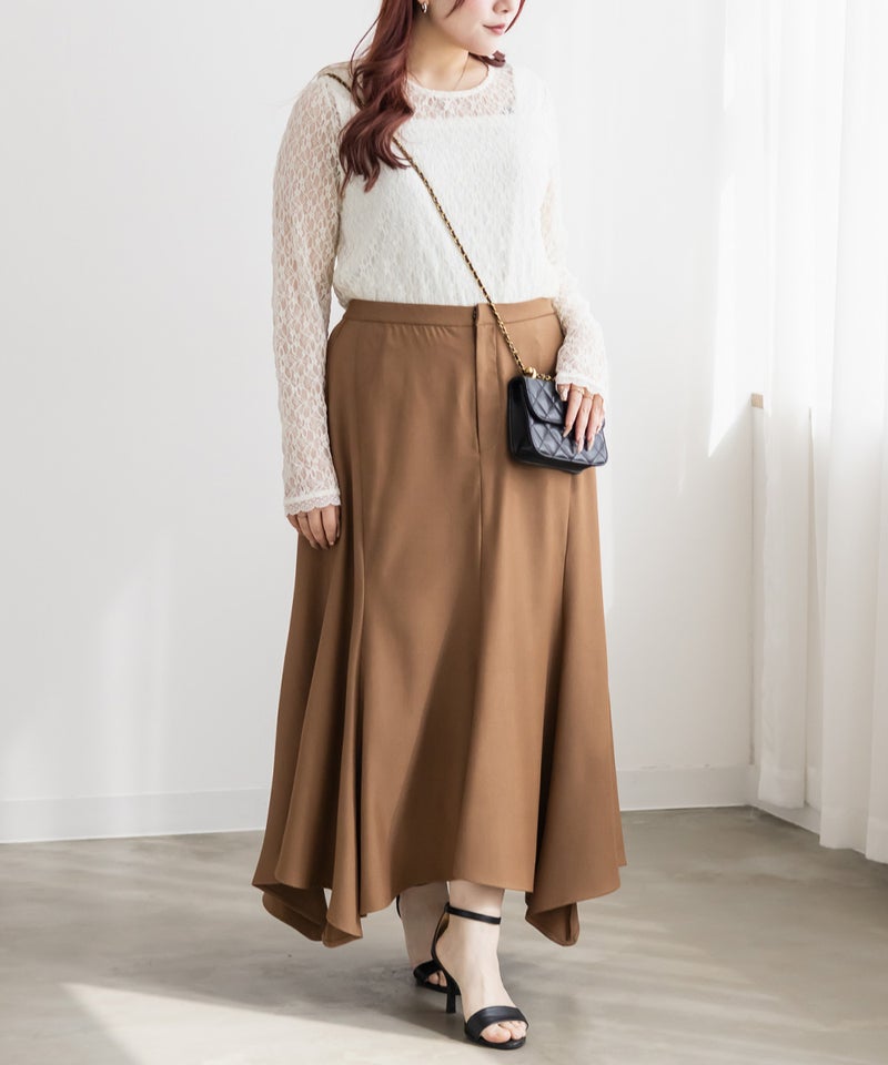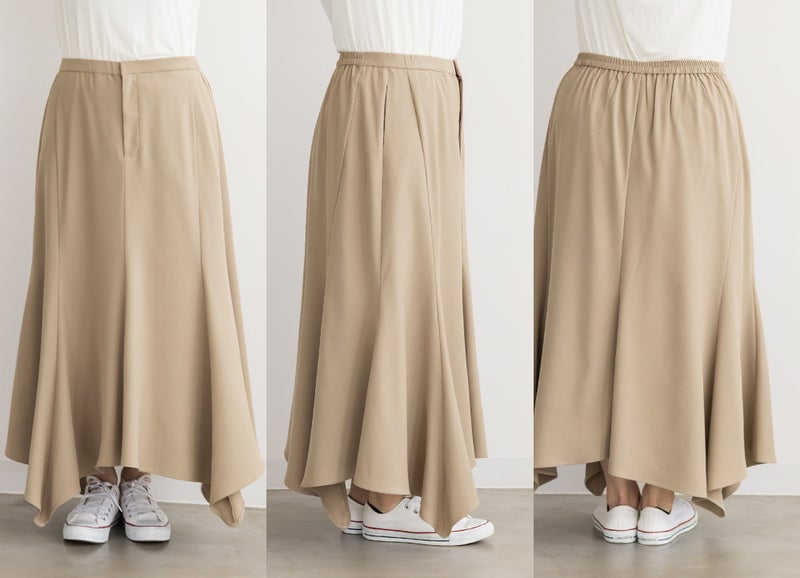 3Lサイズを着用しました。程よくゆとりを持って着られるサイズ感で、窮屈感もなくちょうどよい着心地でした。後ろはゴムになっていて、前もファスナー付きの仕様なので着脱がかなり楽なスカートです!腰回りもしっかりゆとりがあってピタッとせずに着られます◎裾がポイントで真っすぐじゃないのが揺れ動いて女性らしいアイテムです!シンプルながらデザイン性があって、お洒落な雰囲気で着こなせます♪