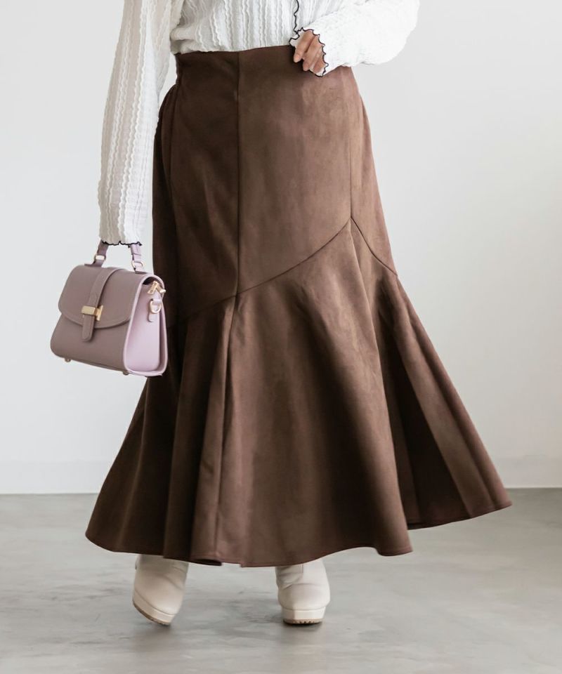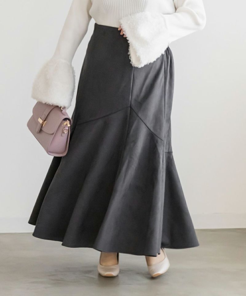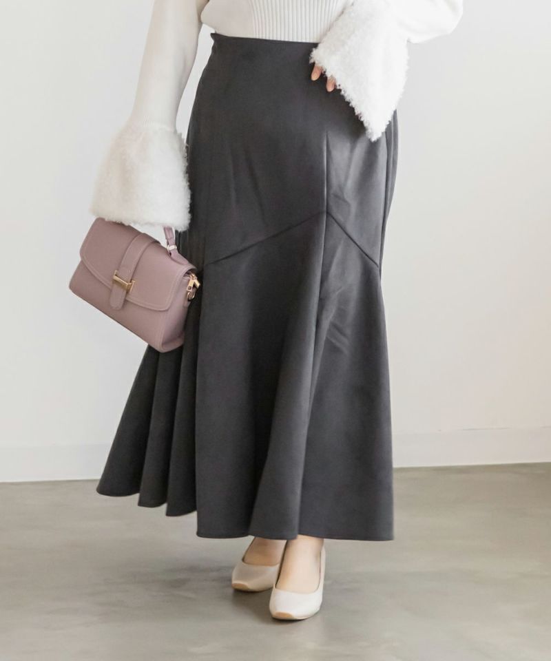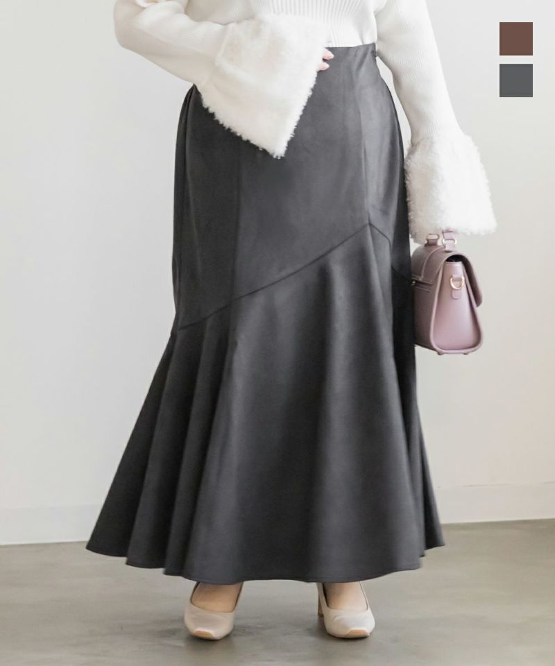 3Lサイズを着用してゆとりのあるサイズでした。後ろはゴムになっていて窮屈感無く着られました!腰回りなど気になる方はヒップ等のサイズ確認をお勧めします◎裾に向かって流れるマーメイドシルエットなので下半身を華奢にみせてくれます。長めのスカート丈で脚長に見える効果も!スエードが今年っぽくてトレンド感も季節感もばっちりです♪シンプルなトップスにも映えるスカートです。