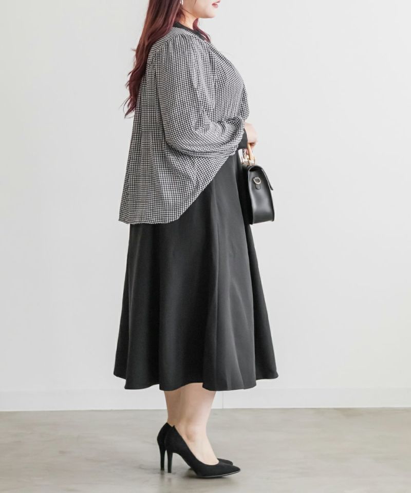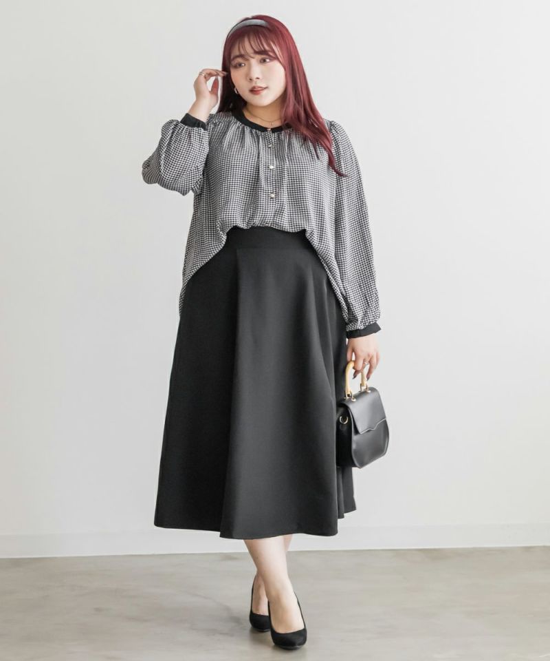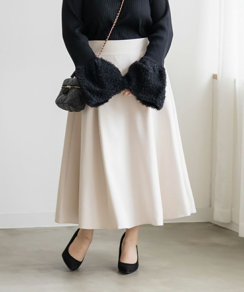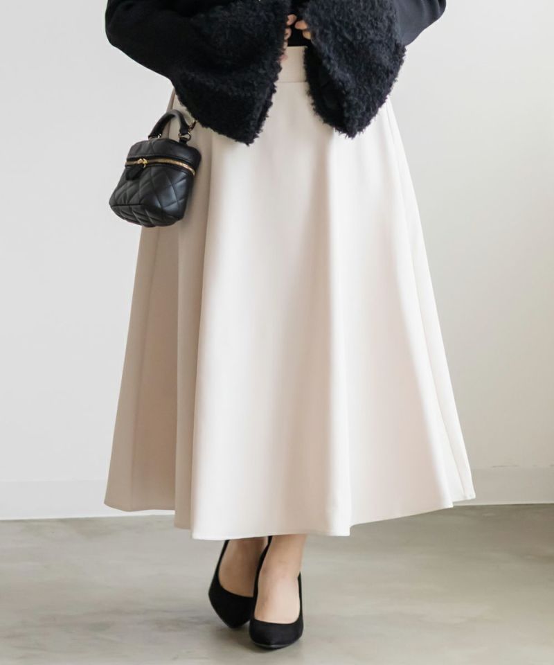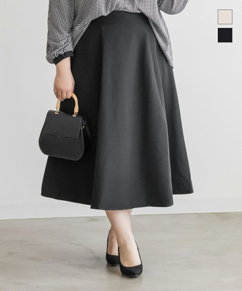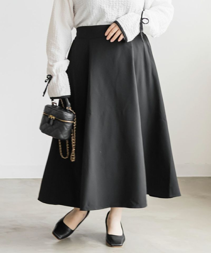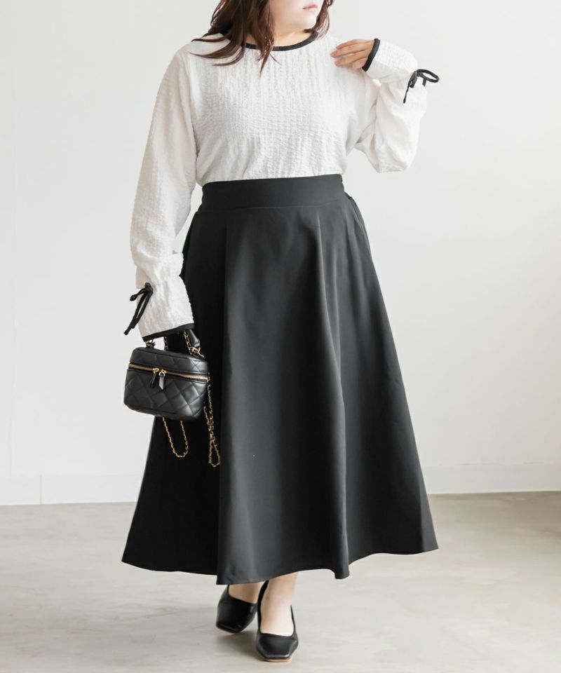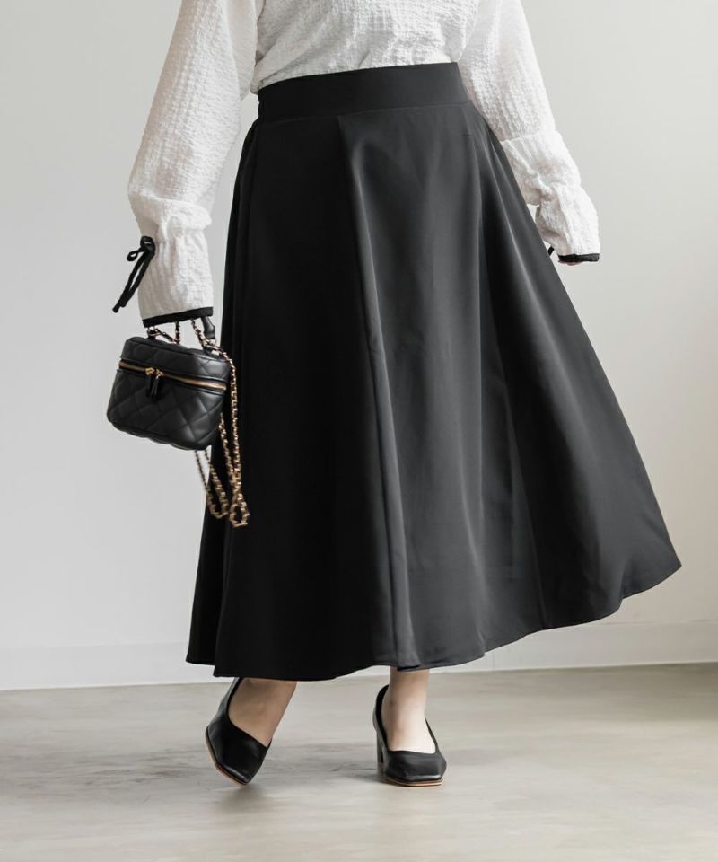 LLサイズを着用して丁度いいサイズ感でした。後ろウエストは巾広めのゴムなので窮屈感のない着心地です◎ギャザーやタックではなくパネル切替になっていているのですっきりとしたシルエットで女性らしい雰囲気で着られました。さらりとした落ち感がある生地でオールシーズン大活躍します!たっぷりとしたフレアシルエットが歩くたびにゆれてかわいいです!着丈も長すぎず、きれいめな印象があるのでデートなどにはもちろん、お仕事などフォーマルなシーンにもお使いいただけます♪
