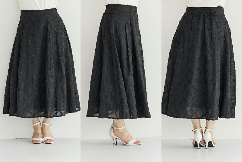 3Lサイズを着てみて丁度いいサイズでした!ウエストがキュッとして見えるハイウエストのデザインで着やせ効果が抜群なスカートです!ヒップや太ももなどが気になる方でも、裾に向かって綺麗に広がるシルエットのおかげでボディラインを拾わずスタイルアップして見えます。上品で大人っぽいシルエットと何より生地がとってもかわいいです♪凹凸があるのでシワも気になりにくいのが嬉しいです!甘すぎず、コーデに取り入れやすいので、上品な雰囲気にもガーリーにもなれます◎デイリーにもお出かけにも使える主役スカートです!