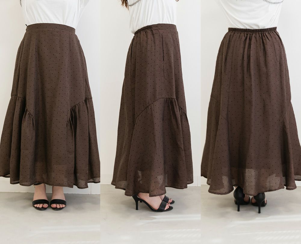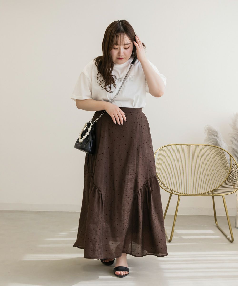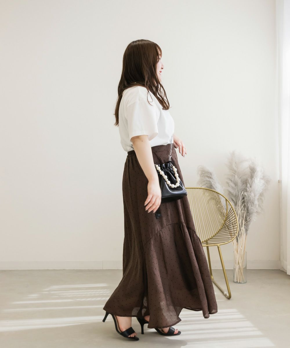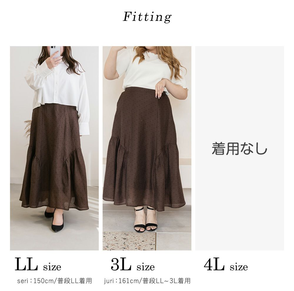 LLを着てちょうどいいサイズでした。後ろゴムになっていて着心地らくちんで、トレンドのシアーな質感を演出したドット柄スカート。サイドギャザーをたっぷり入れたシルエットが、エレガントな揺れ感を演出。