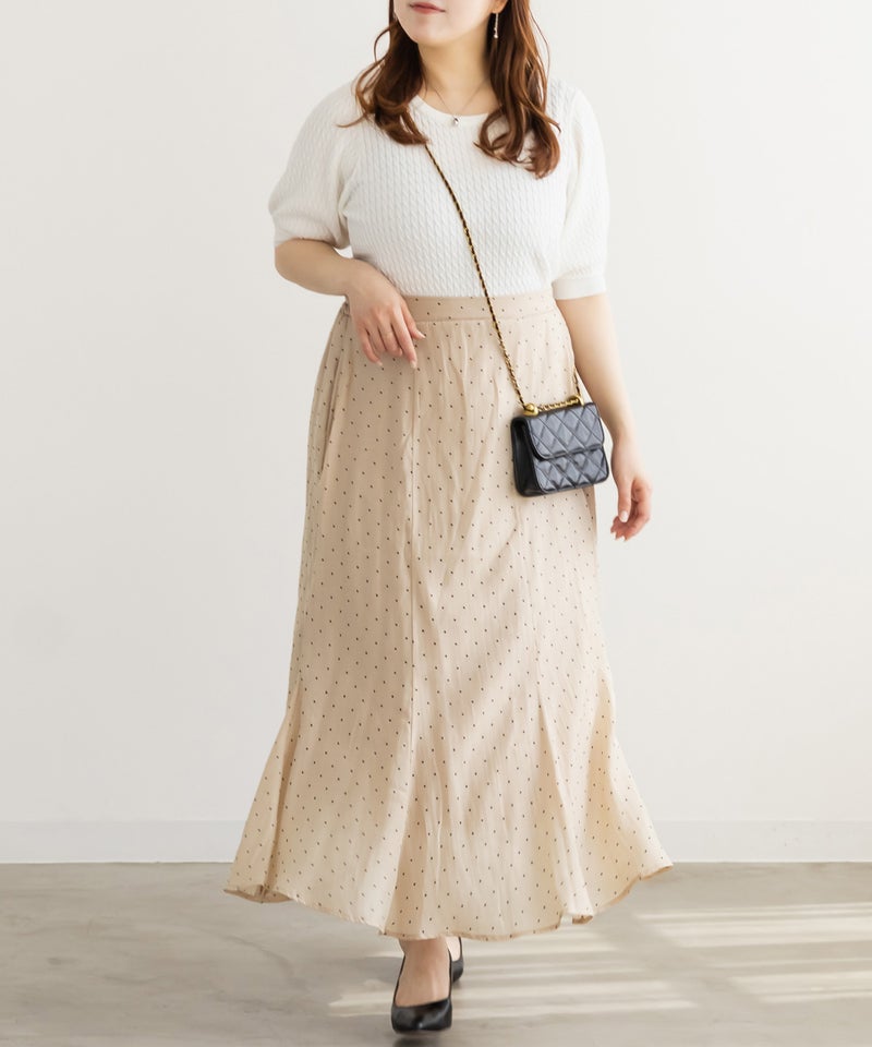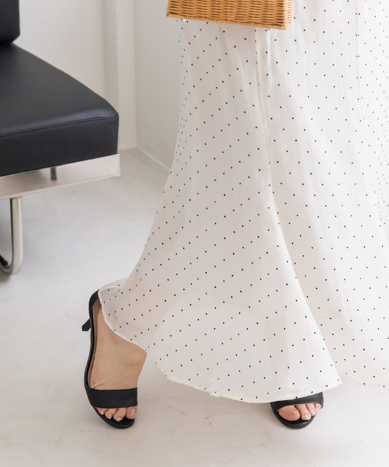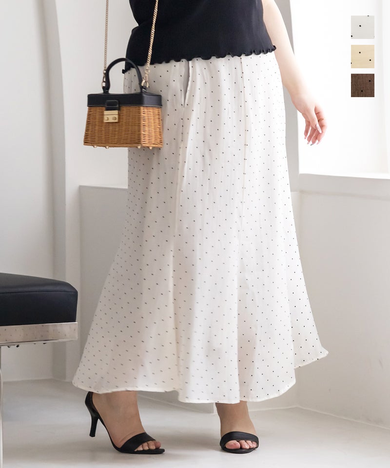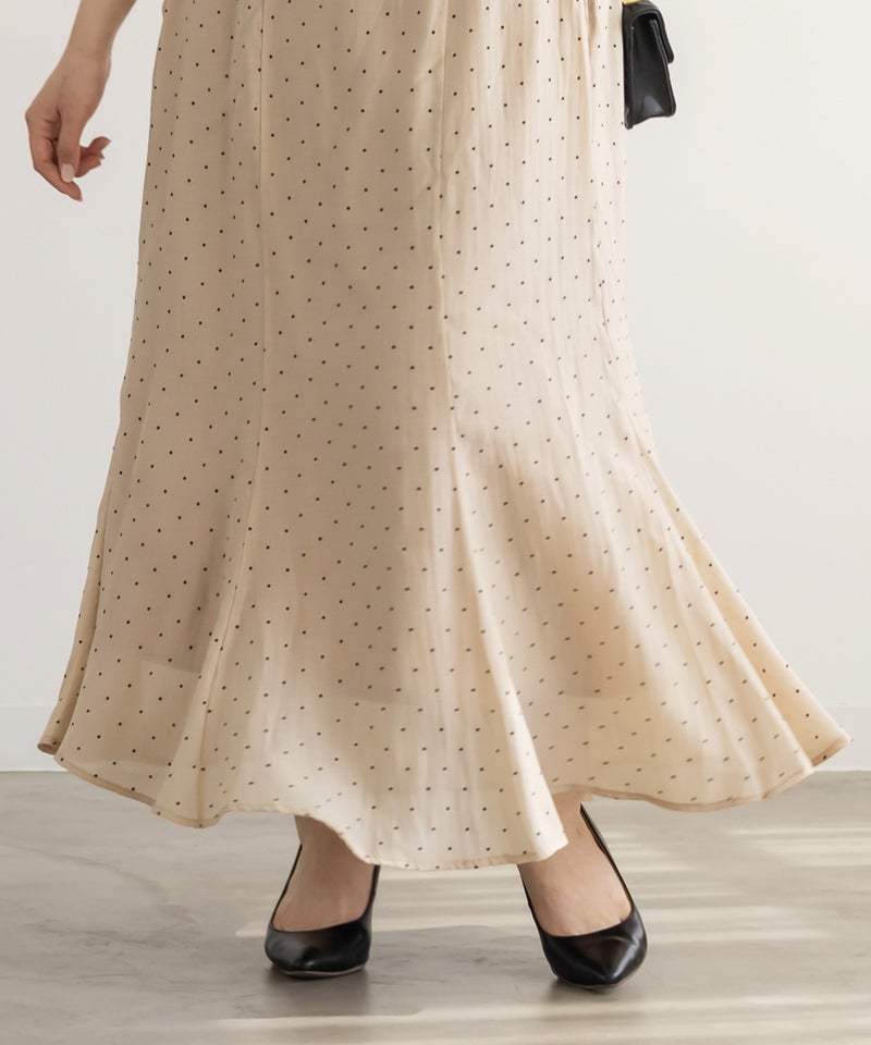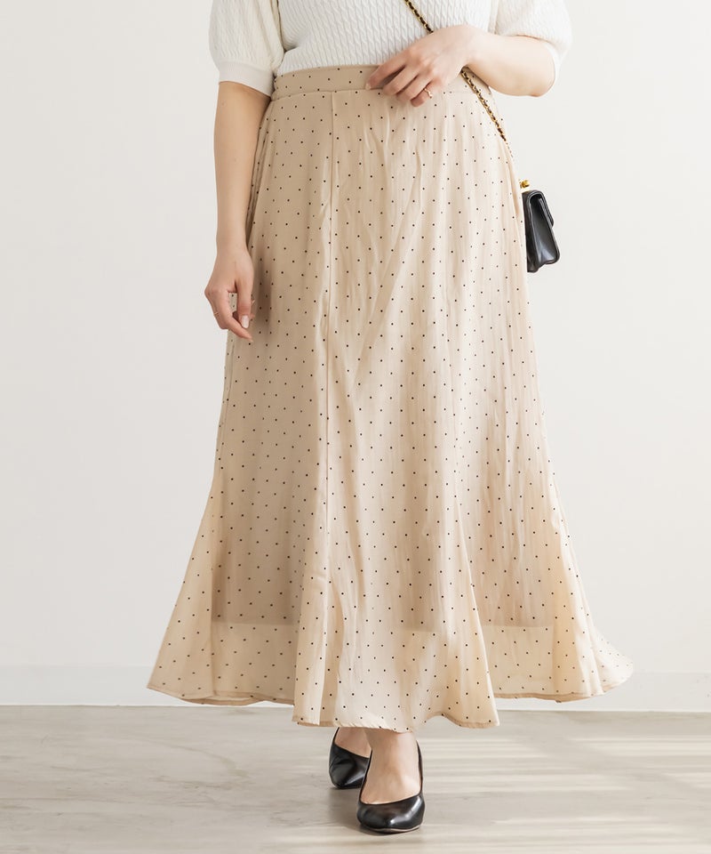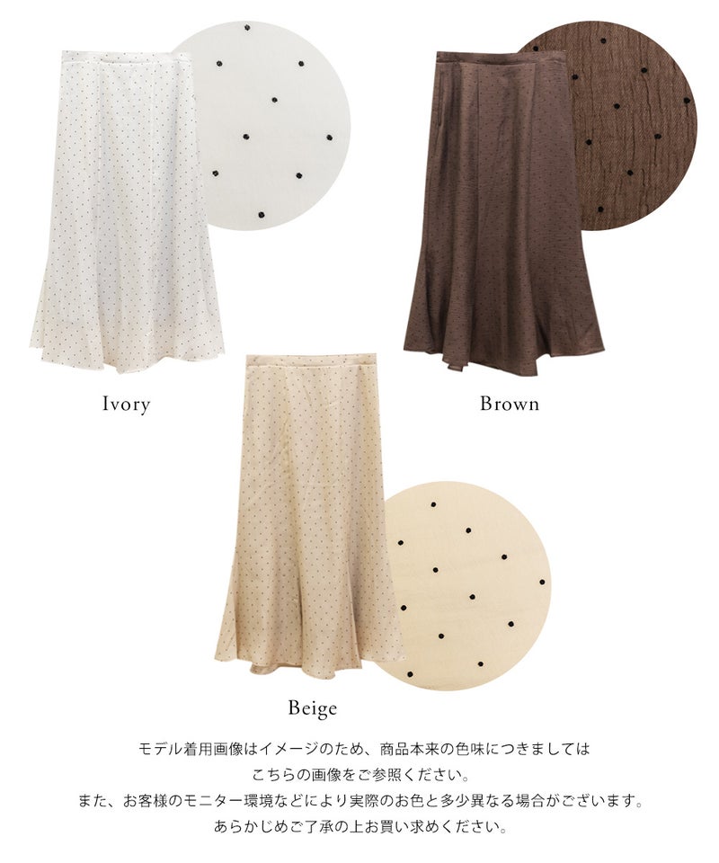 【design】大人っぽいドット柄のメーメイドスカート。フィットし過ぎないシルエットだから、腰回りをすっきりみせて女性らしくスタイルアップできる。【material】透け感のある素材に子供っぽくならない小さめで上品なドット柄を施した生地。ドットは高級感のあるフロッキープリント。さらりとした肌触りの裏地付き。【styling】腰回りがすっきりとしたデザインだから、ヒップあたりまでゆったりとしたトップスを合わせて、スカートの軽やかな裾をポイントにするスタイルがおすすめ。ゆるっと抜け感のある女性らしいコーディネートが完成します。