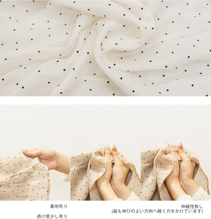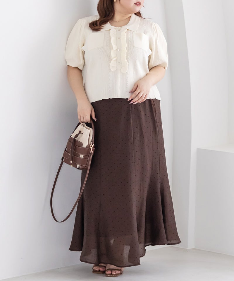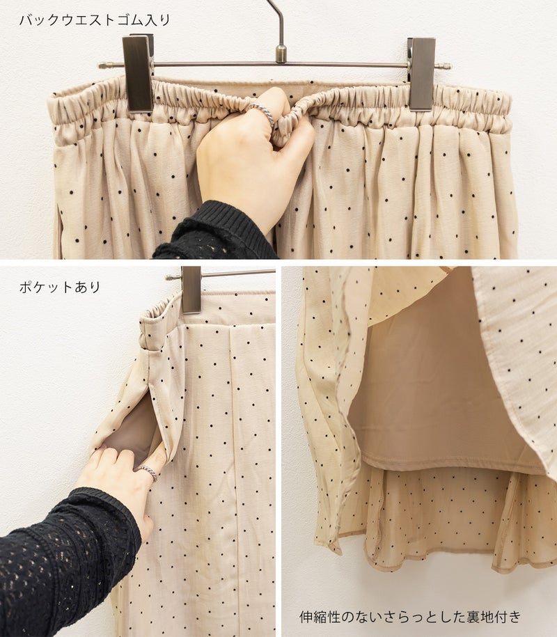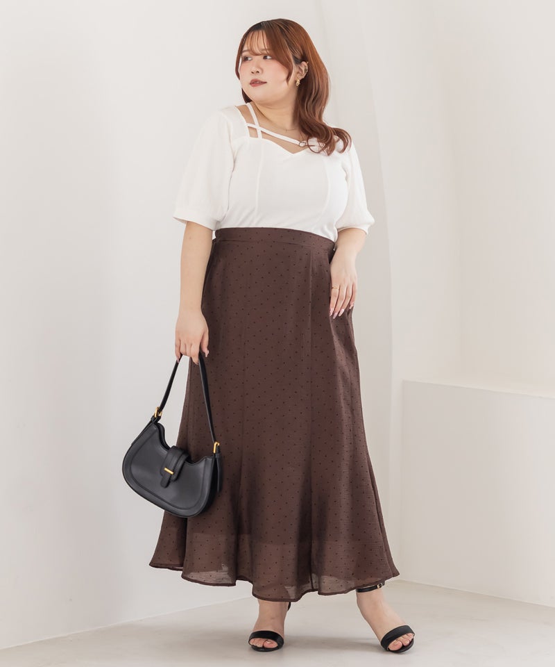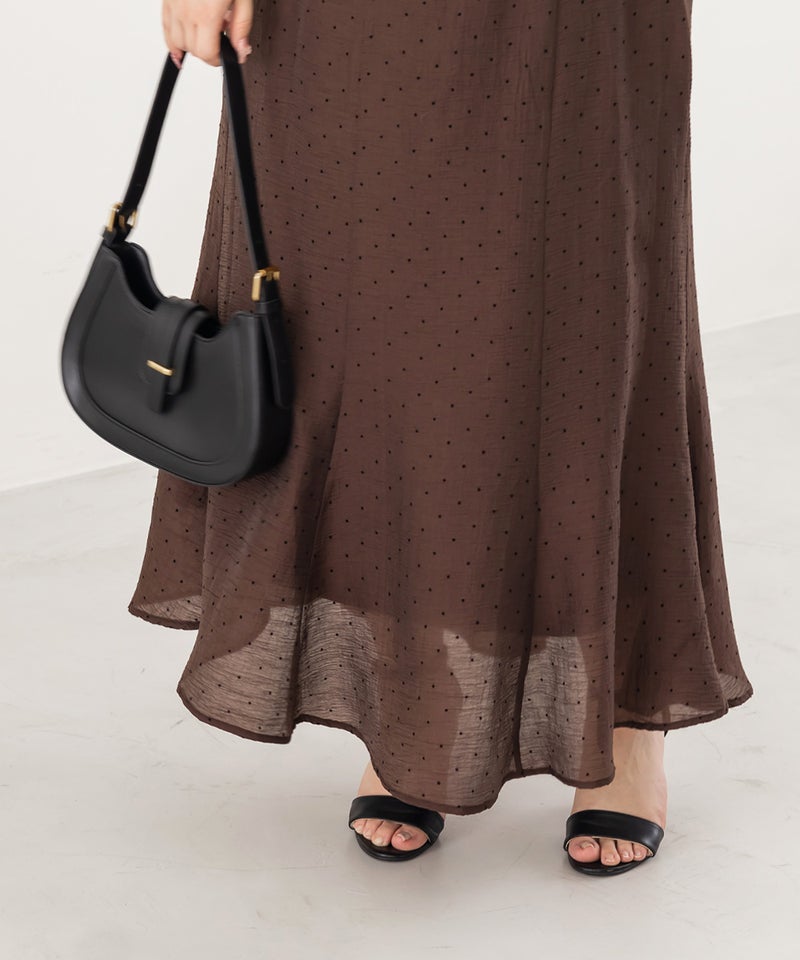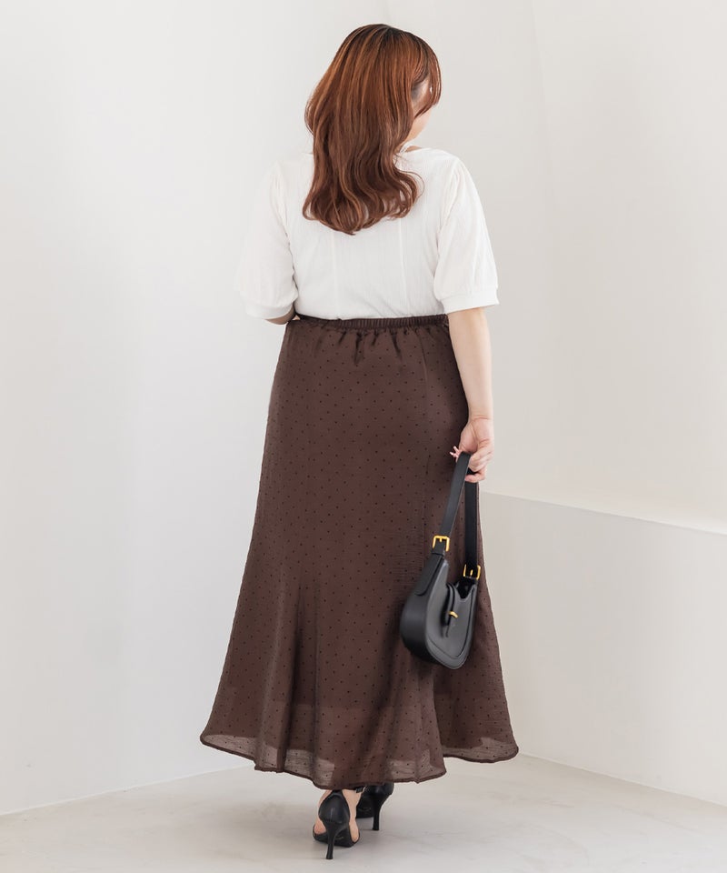 【design】大人っぽいドット柄のメーメイドスカート。フィットし過ぎないシルエットだから、腰回りをすっきりみせて女性らしくスタイルアップできる。【material】透け感のある素材に子供っぽくならない小さめで上品なドット柄を施した生地。ドットは高級感のあるフロッキープリント。さらりとした肌触りの裏地付き。【styling】腰回りがすっきりとしたデザインだから、ヒップあたりまでゆったりとしたトップスを合わせて、スカートの軽やかな裾をポイントにするスタイルがおすすめ。ゆるっと抜け感のある女性らしいコーディネートが完成します。