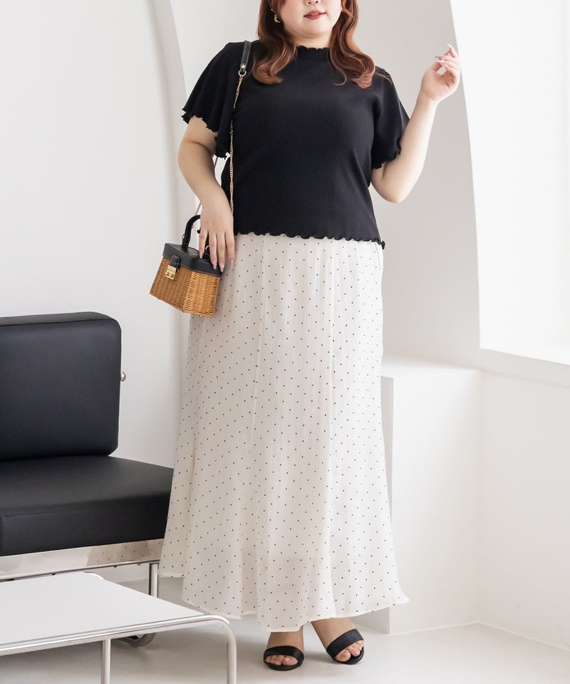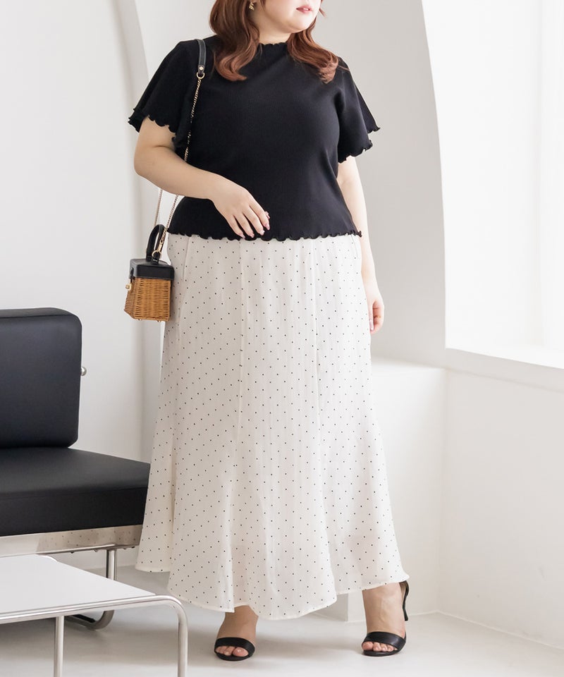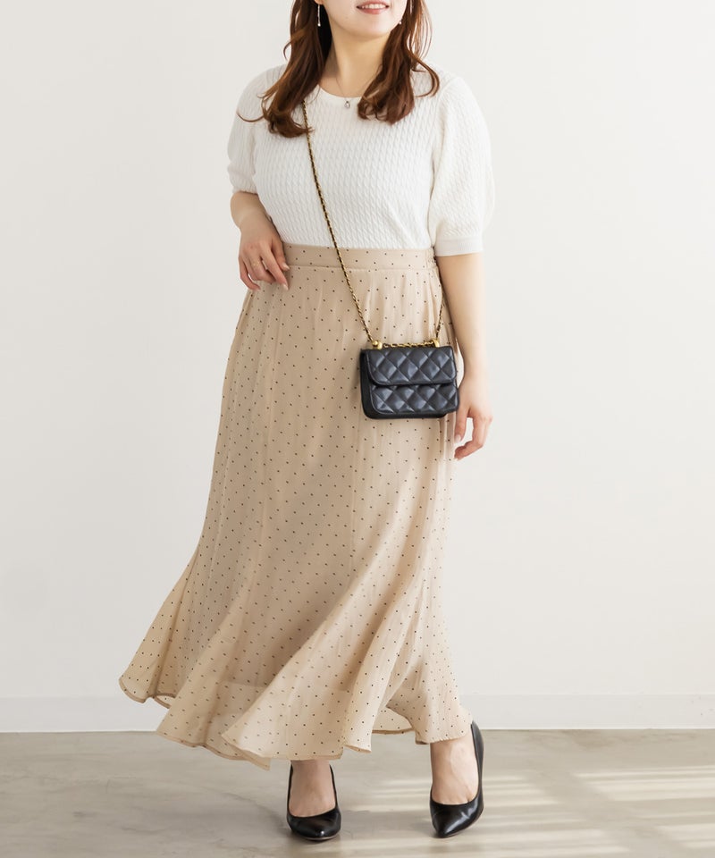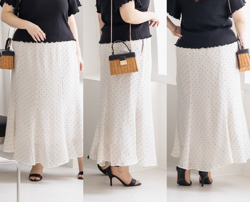 3Lを着てちょうどいいサイズでした。後ろゴムになっていて着心地らくちんでトレンドのドット柄とシアーな質感が可愛いです。マーメイドのすっきりとしたシルエットになっていて、どんなトップスともコーディネートしやすいです。お仕事から普段使いも活躍して、着回しが効くアイテムです。