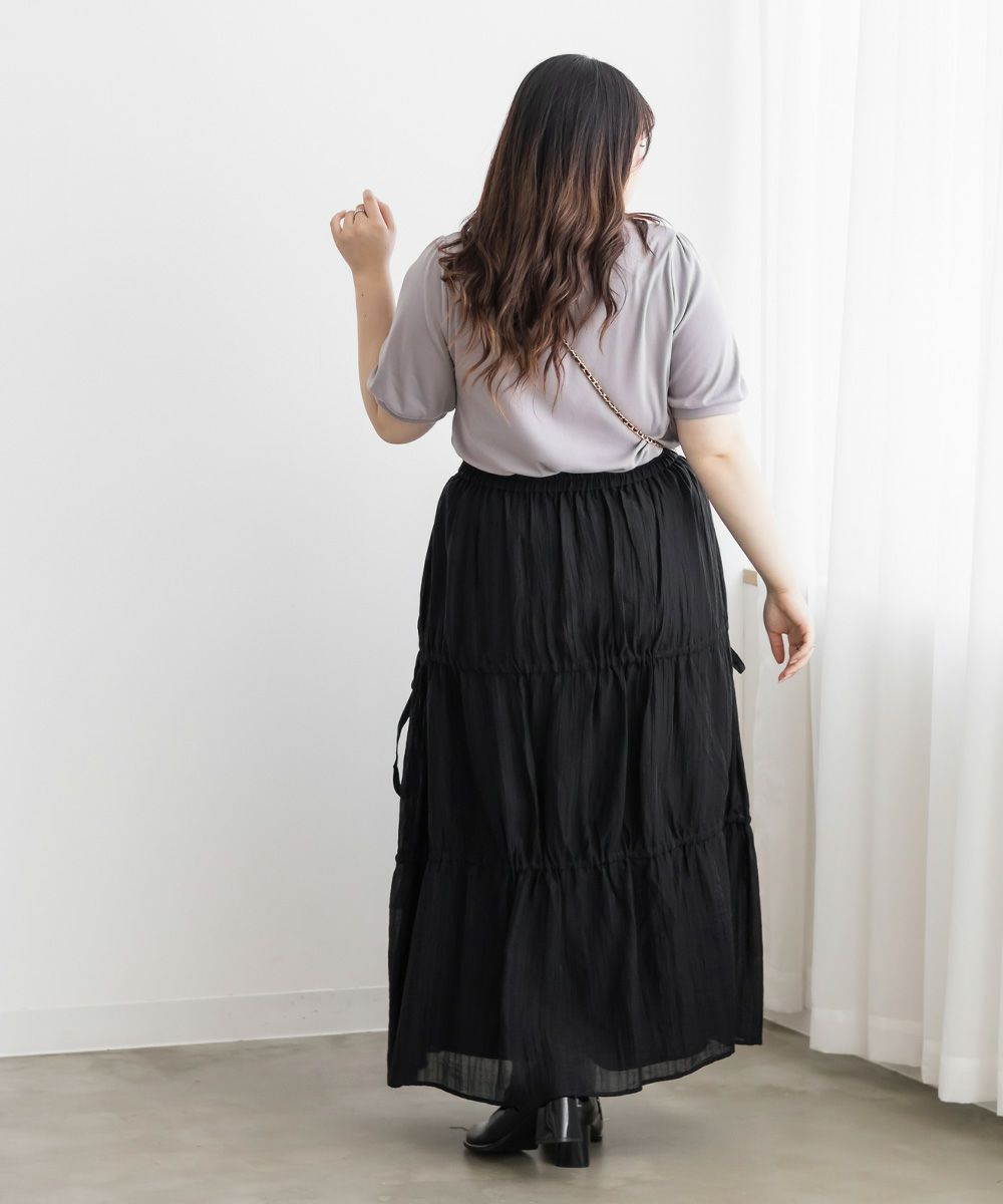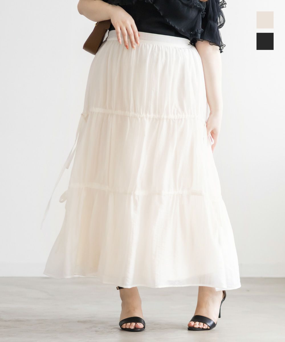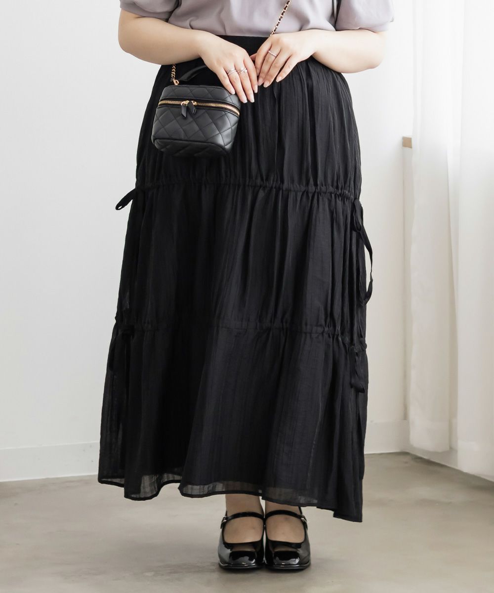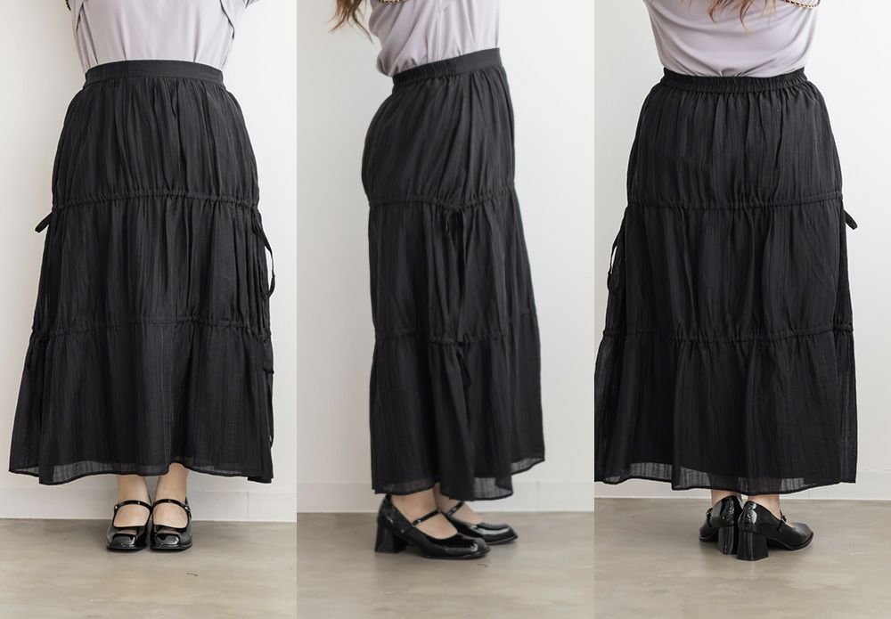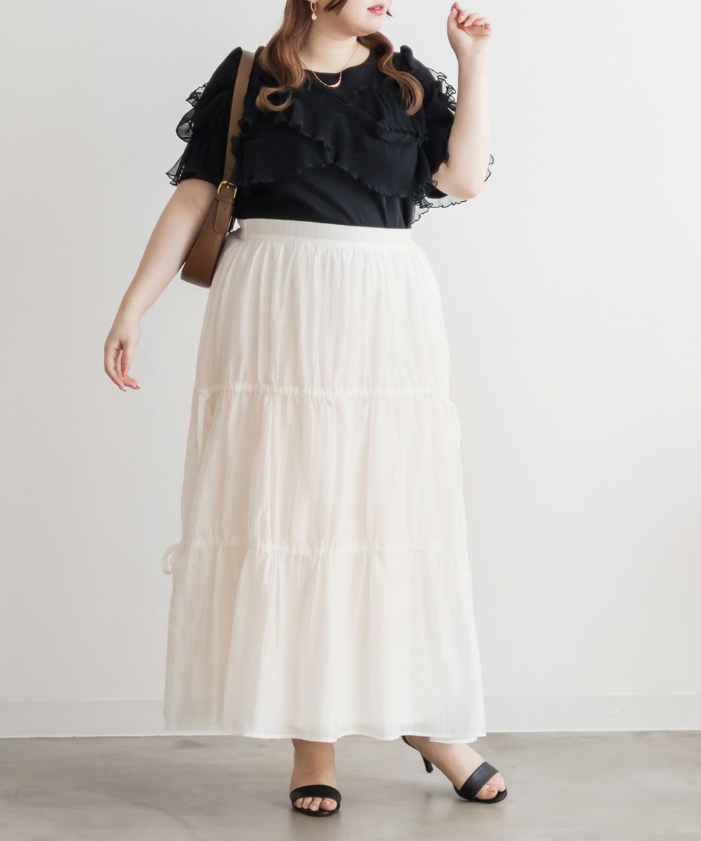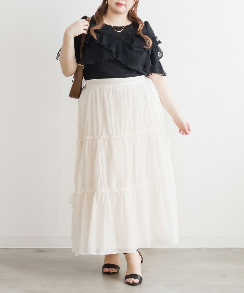 3Lサイズを着てちょうどいい着心地でした。ウエストは後ろゴムで窮屈感も無く、フレアシルエットなので身体のラインも拾わず足さばきもしやすかったです!優しい風合いが今っぽい着こなしにピッタリのトレンドアイテムです!ティアードとサイドにリボンがついているデザインがガーリーで女性らしさをプラスしてくれるアイテムです♪ふんわりとしたシルエットが特徴的で、動きが出るたびに美しく揺れます。カジュアルなトップスと合わせても、相性抜群なので普段使いにもぴったりです◎