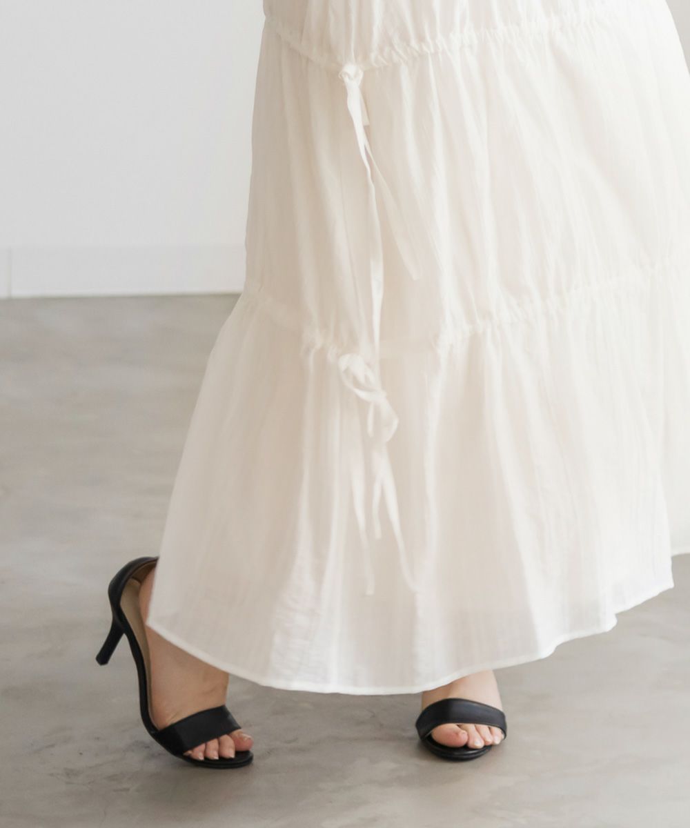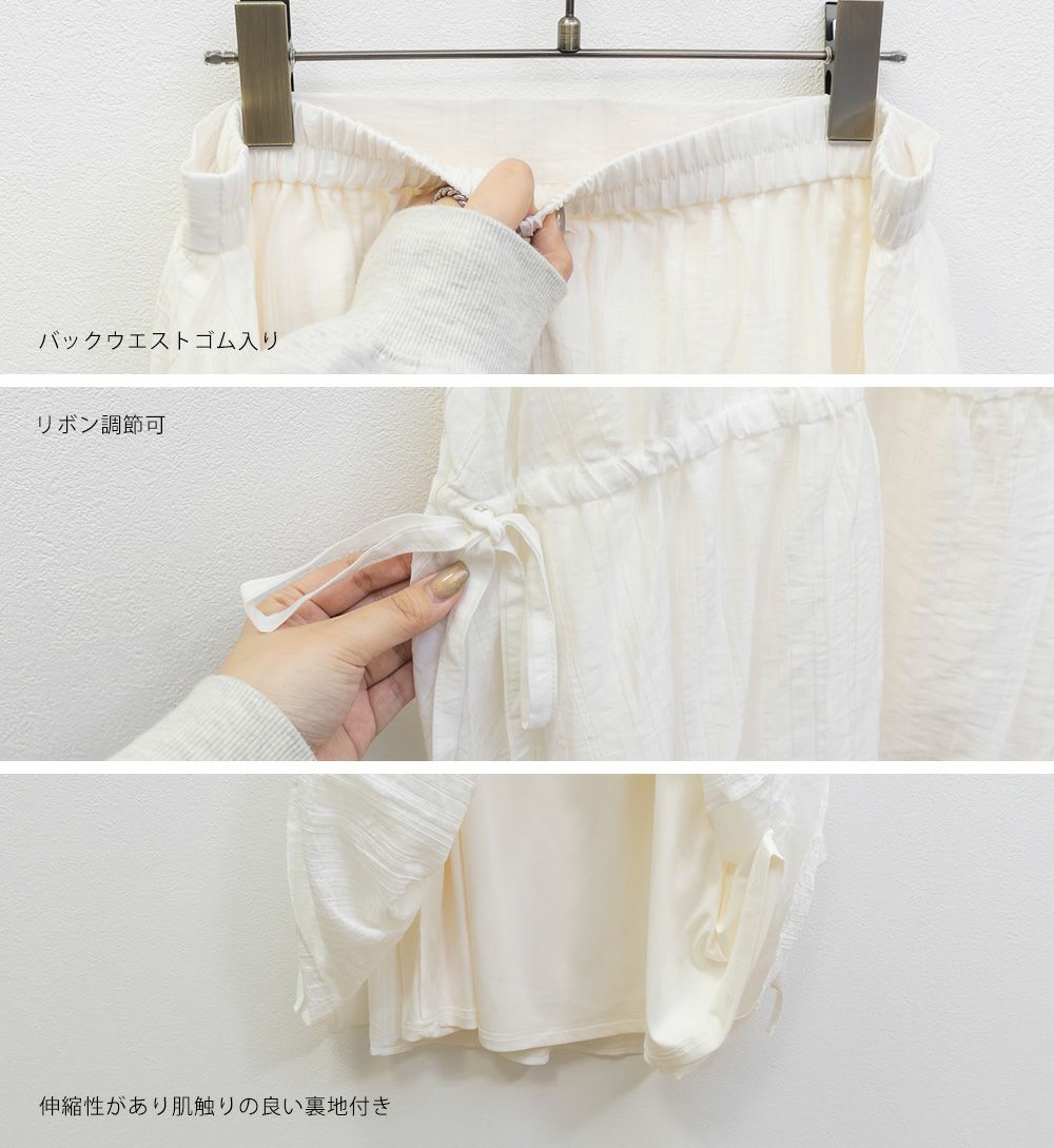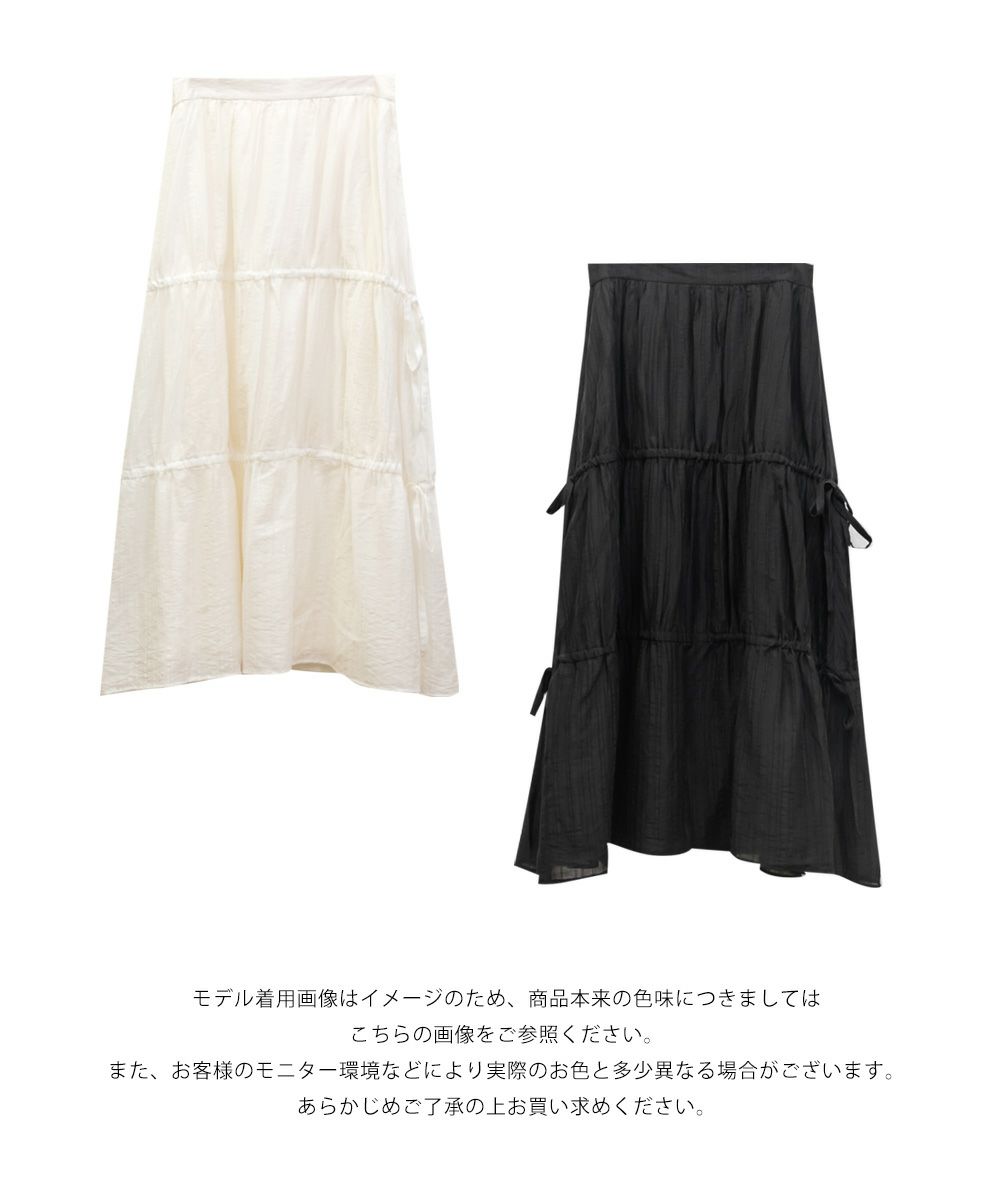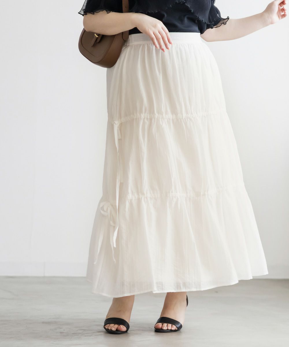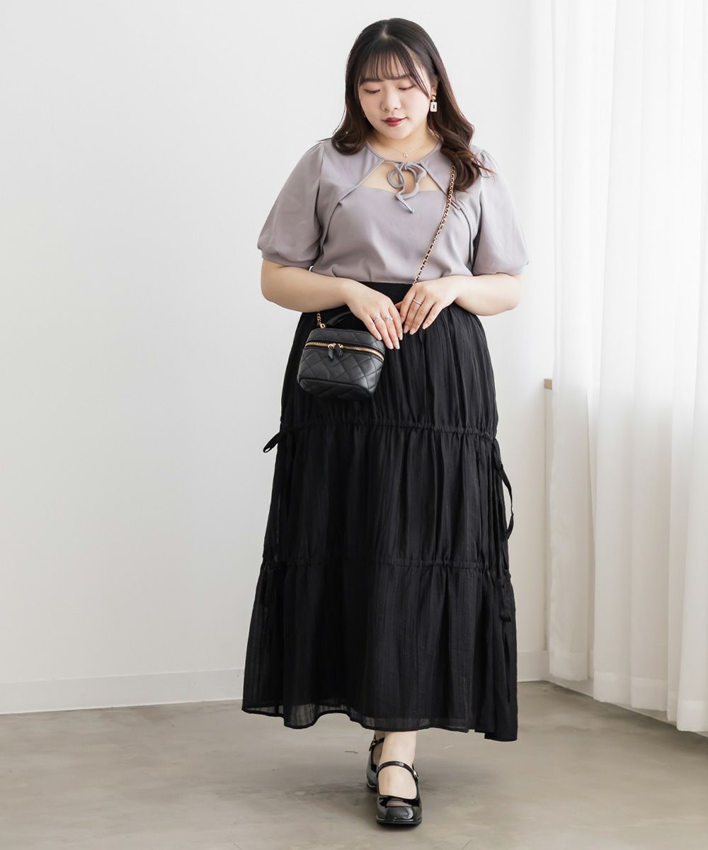 3Lサイズを着てちょうどいい着心地でした。ウエストは後ろゴムで窮屈感も無く、フレアシルエットなので身体のラインも拾わず足さばきもしやすかったです!優しい風合いが今っぽい着こなしにピッタリのトレンドアイテムです!ティアードとサイドにリボンがついているデザインがガーリーで女性らしさをプラスしてくれるアイテムです♪ふんわりとしたシルエットが特徴的で、動きが出るたびに美しく揺れます。カジュアルなトップスと合わせても、相性抜群なので普段使いにもぴったりです◎