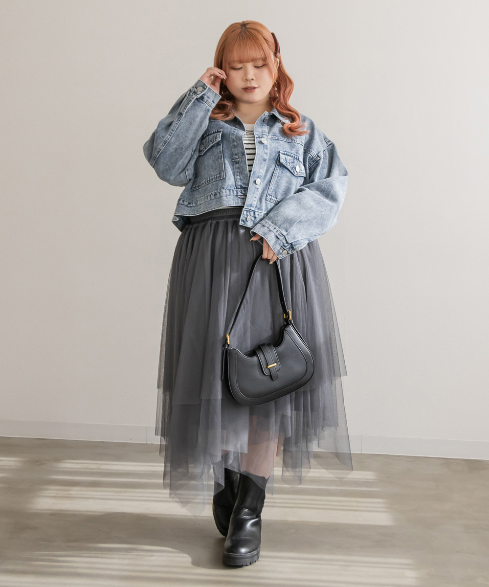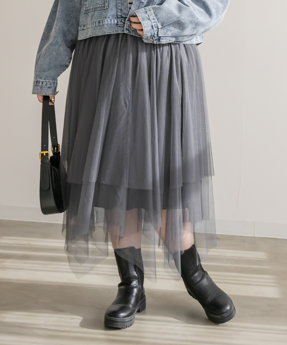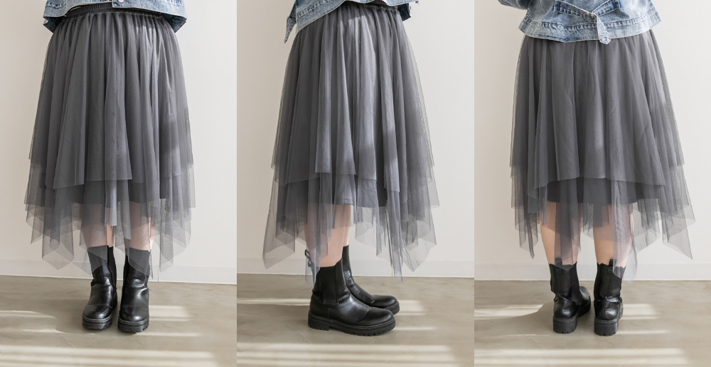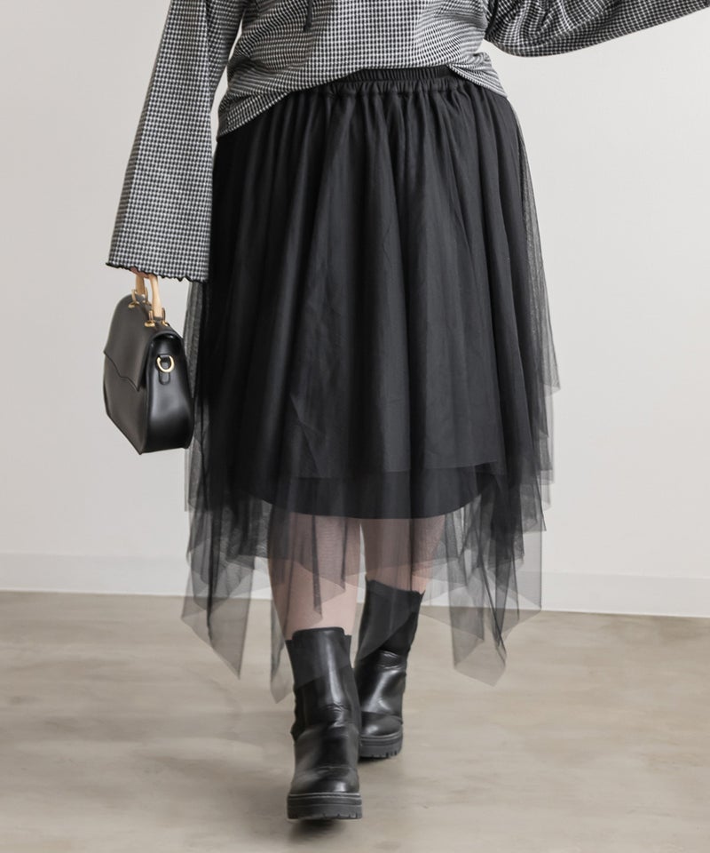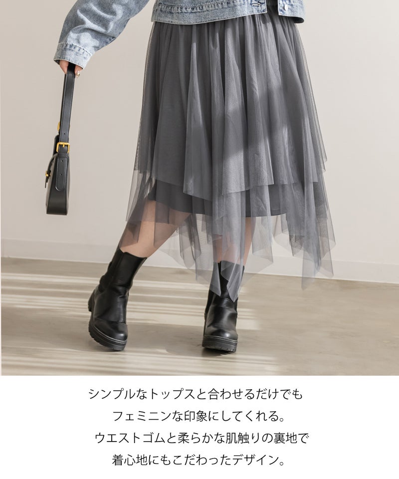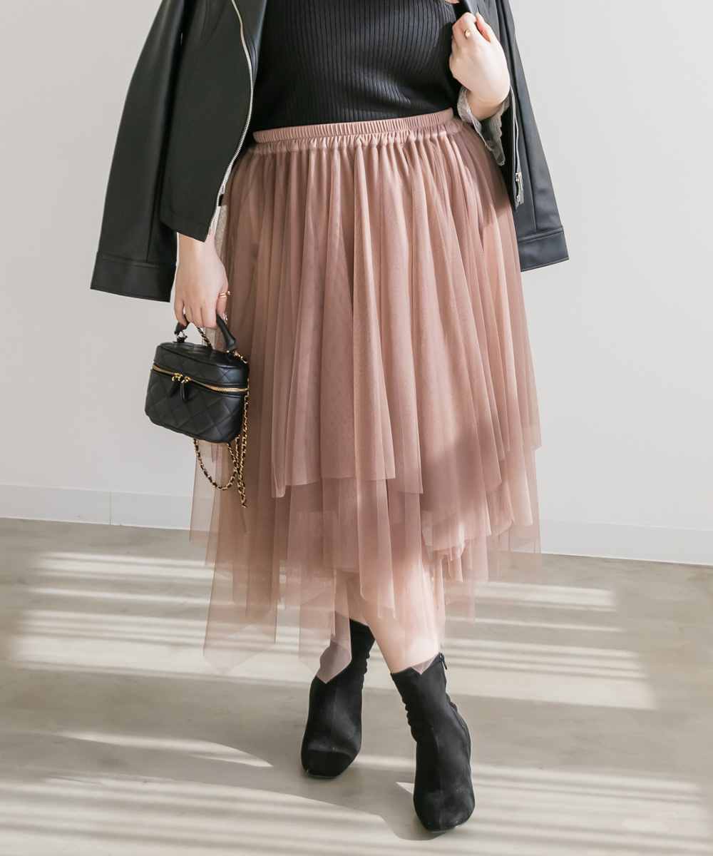 3Lサイズを着用してちょうどいいサイズ感で着用出来ました!ウエストは総ゴムで着脱も楽々です!ひらひら広がりのあるチュールスカートで足さばきもしやすいのがうれしいです♪ランダムなチュールティアードがコーディネートを華やかにしてくれるアイテムです!着丈も長すぎないので、ショートブーツをチラッと見せる着こなしもお勧めです。