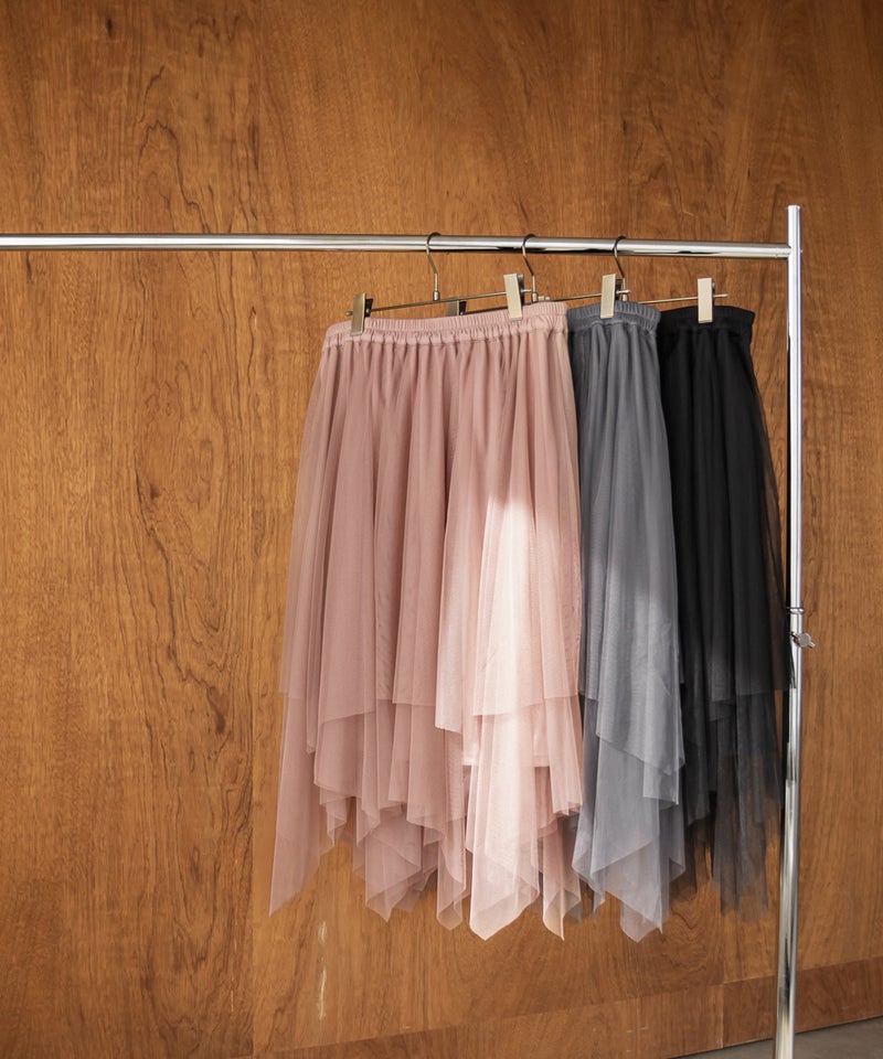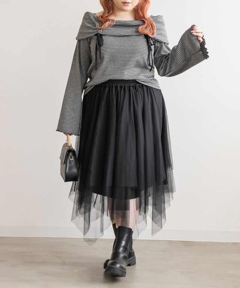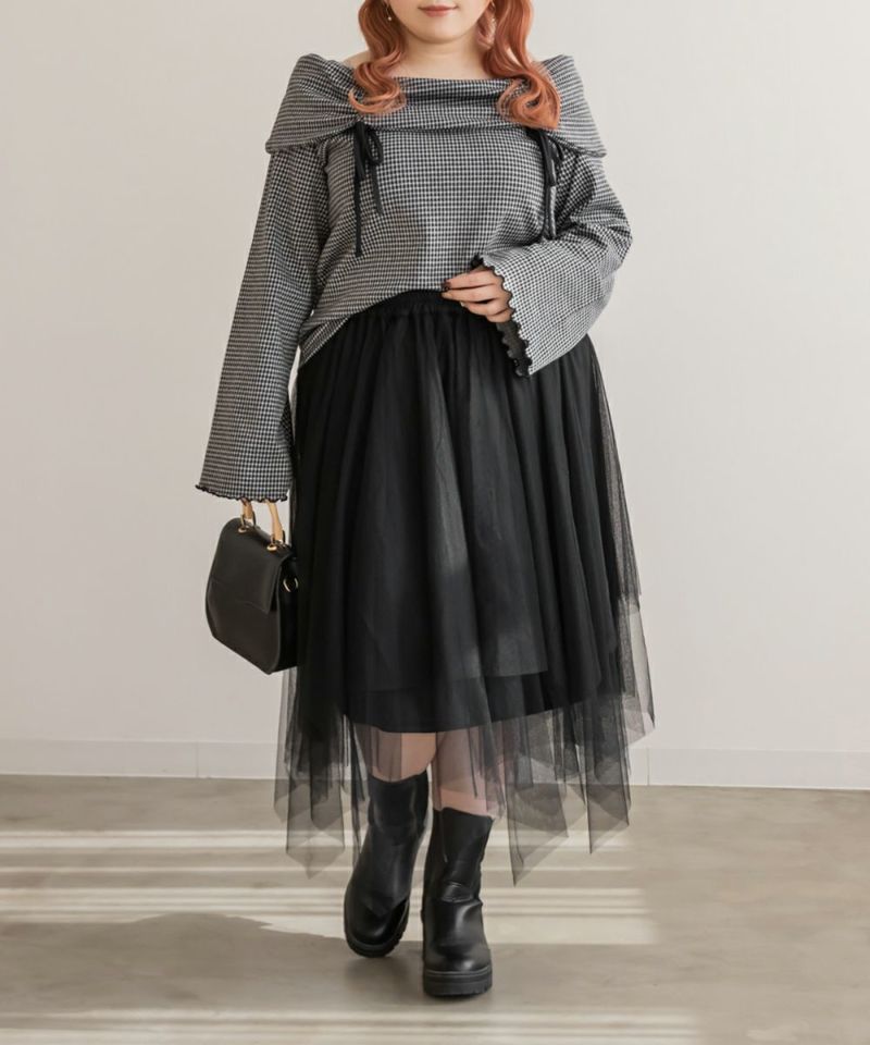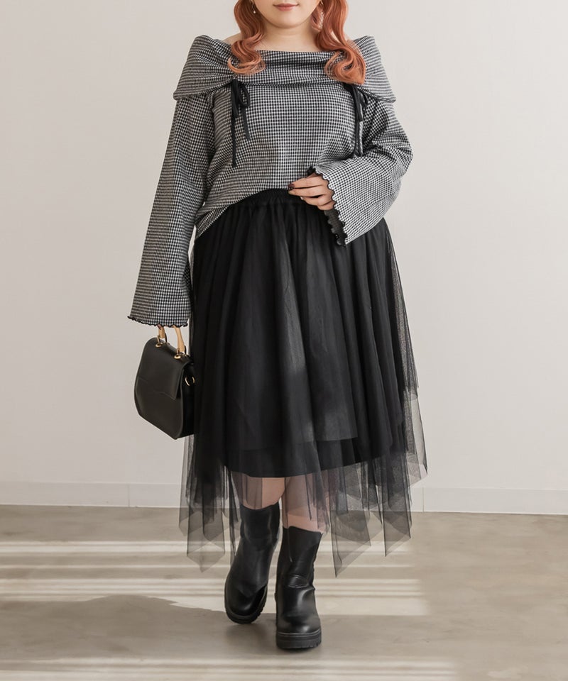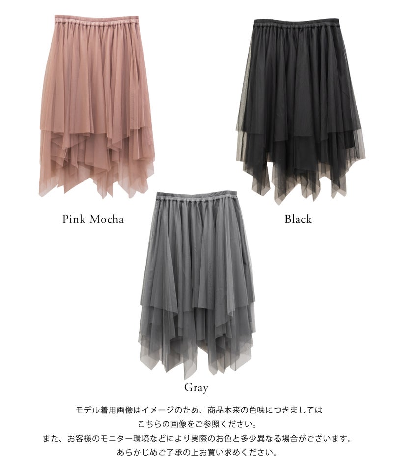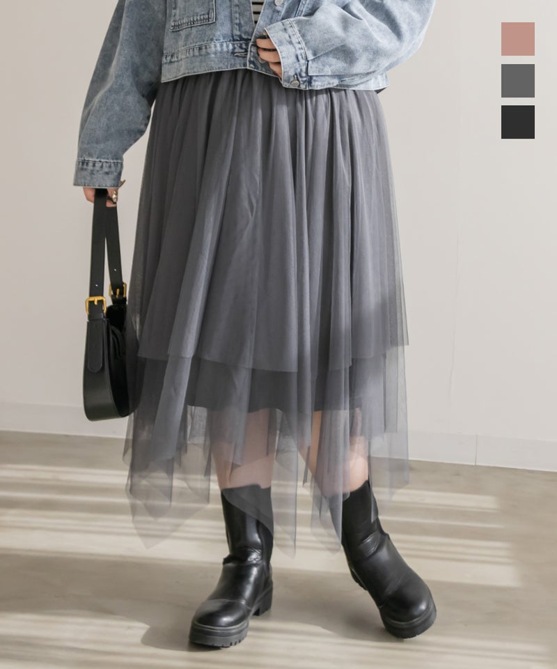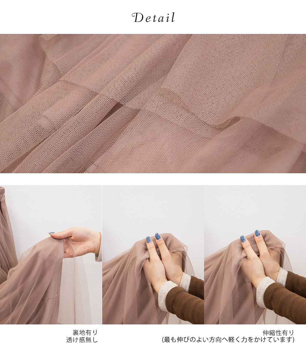 3Lサイズを着用してちょうどいいサイズ感で着用出来ました!ウエストは総ゴムで着脱も楽々です!ひらひら広がりのあるチュールスカートで足さばきもしやすいのがうれしいです♪ランダムなチュールティアードがコーディネートを華やかにしてくれるアイテムです!着丈も長すぎないので、ショートブーツをチラッと見せる着こなしもお勧めです。