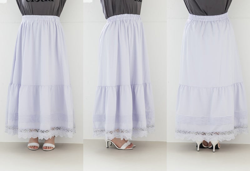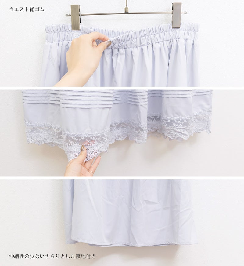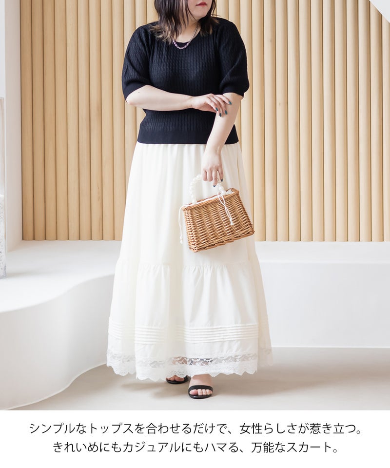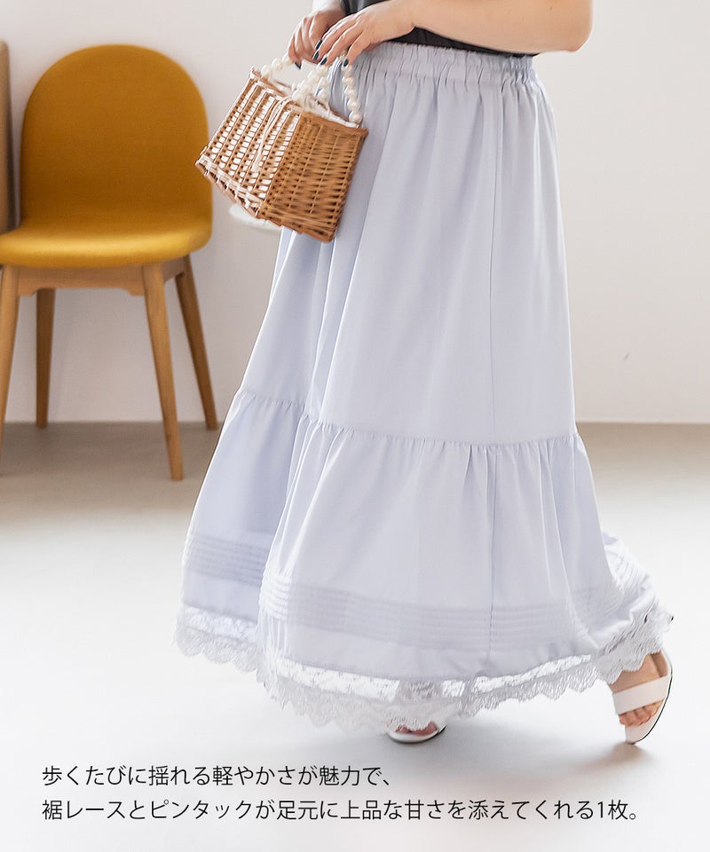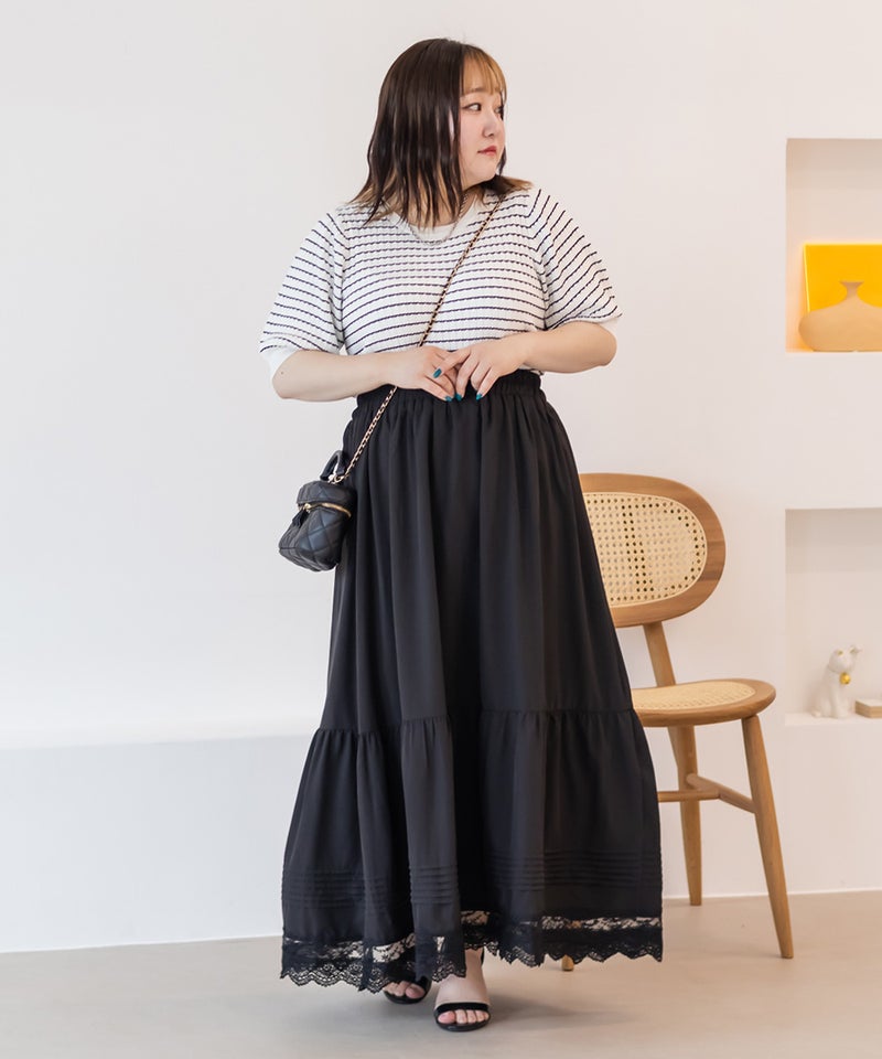 LLサイズをきてらくちんな着心地でした。ウエストは総ゴムで、ほどよくフィットしながらラクに履けて動きやすいです◎程よく落ち感のある生地で広がりすぎず、綺麗なフレアシルエットです!裾のピンタックとレースがとっても上品で、フェミニンな着こなしももちろん、カジュアルコーデでも大人っぽくまとまります♪ブラウスと合わせればきれいめに、ロゴTと合わせれば抜け感のある可愛さも楽しめて、着回し力もばっちりです!年中使える生地感・デザインなので、たくさん着回したいアイテムです!