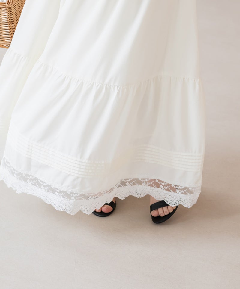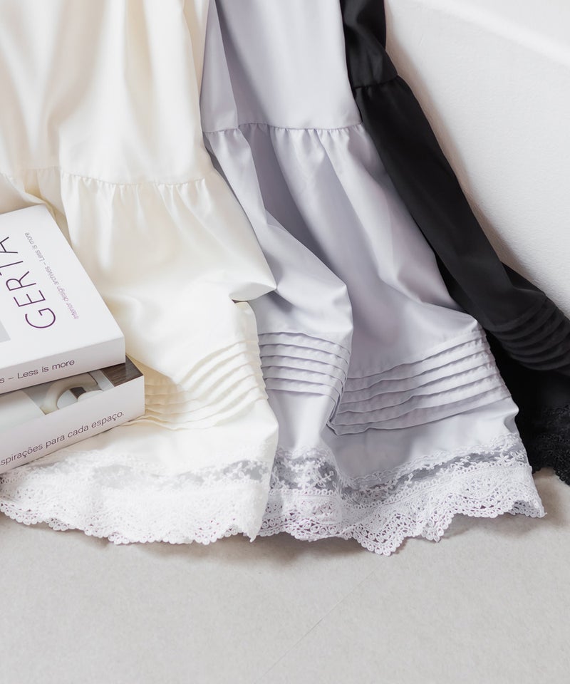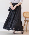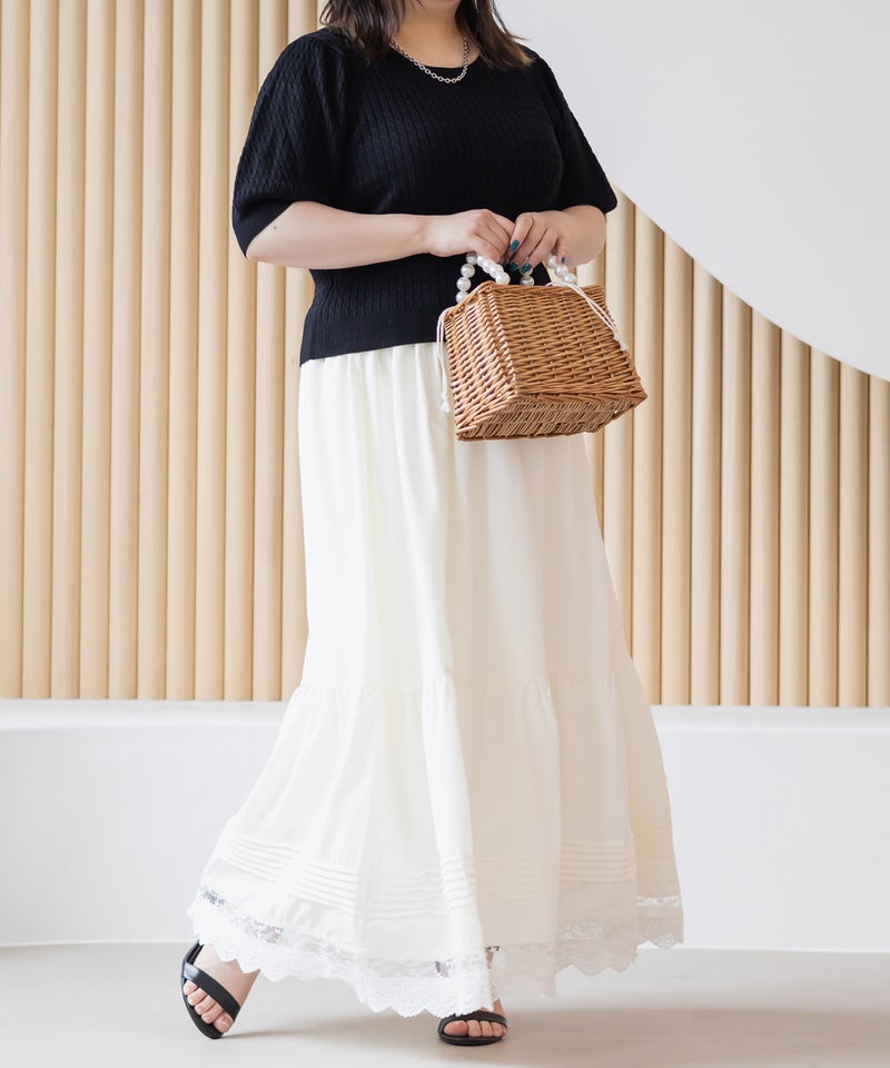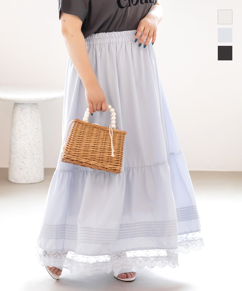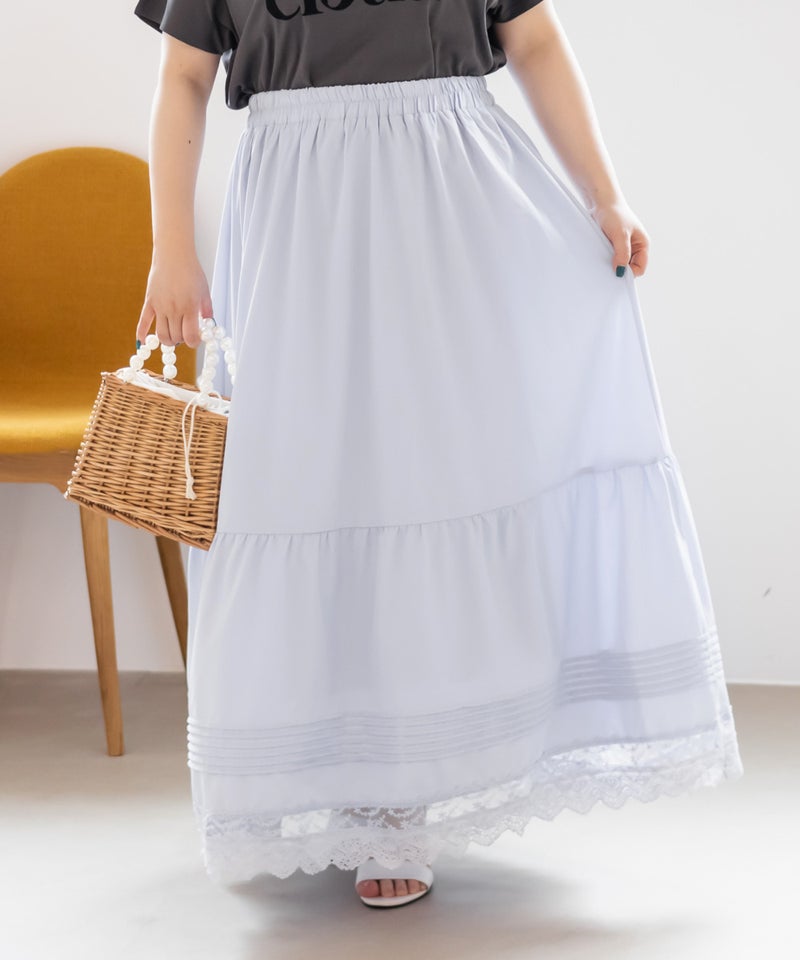LLサイズをきてらくちんな着心地でした。ウエストは総ゴムで、ほどよくフィットしながらラクに履けて動きやすいです◎程よく落ち感のある生地で広がりすぎず、綺麗なフレアシルエットです!裾のピンタックとレースがとっても上品で、フェミニンな着こなしももちろん、カジュアルコーデでも大人っぽくまとまります♪ブラウスと合わせればきれいめに、ロゴTと合わせれば抜け感のある可愛さも楽しめて、着回し力もばっちりです!年中使える生地感・デザインなので、たくさん着回したいアイテムです!
