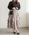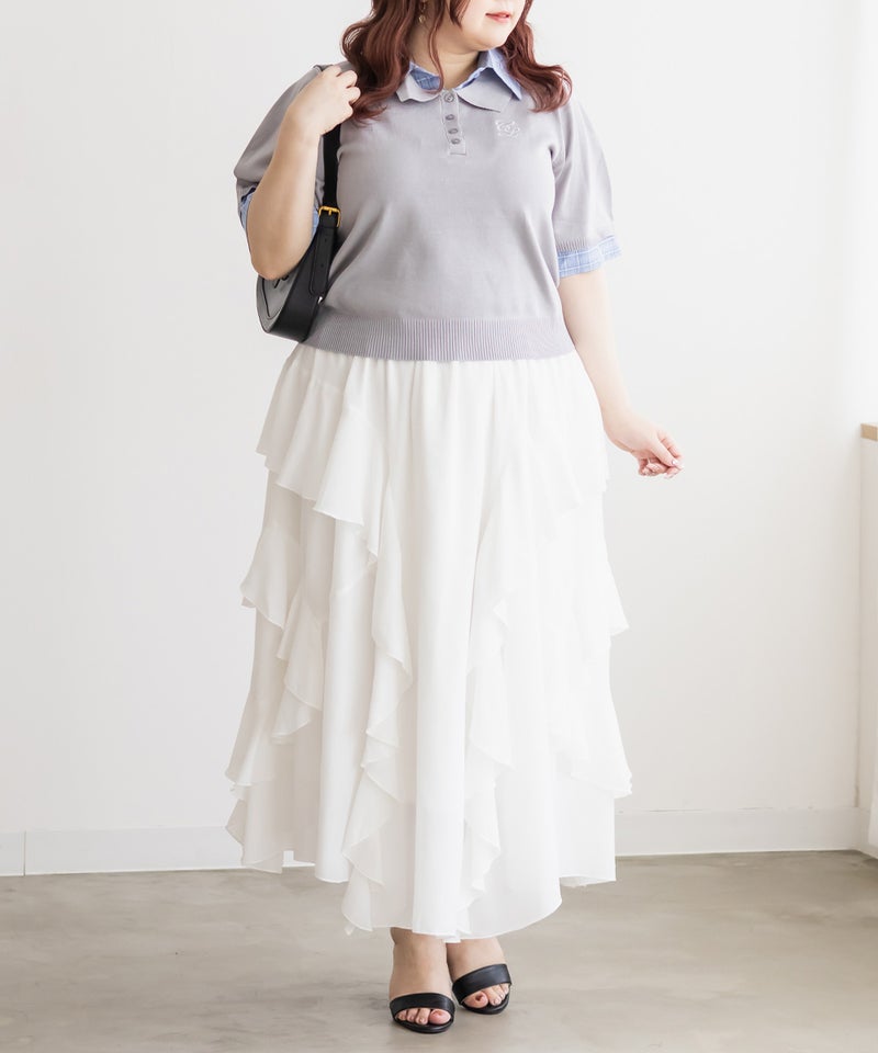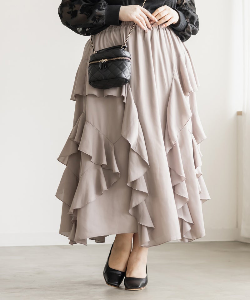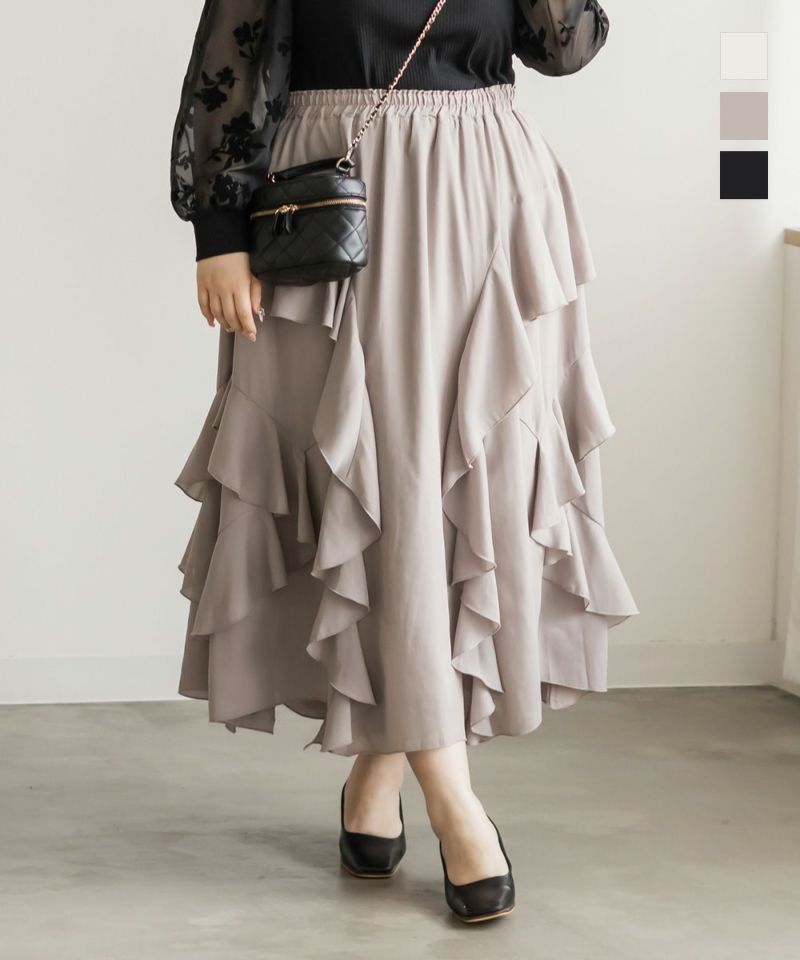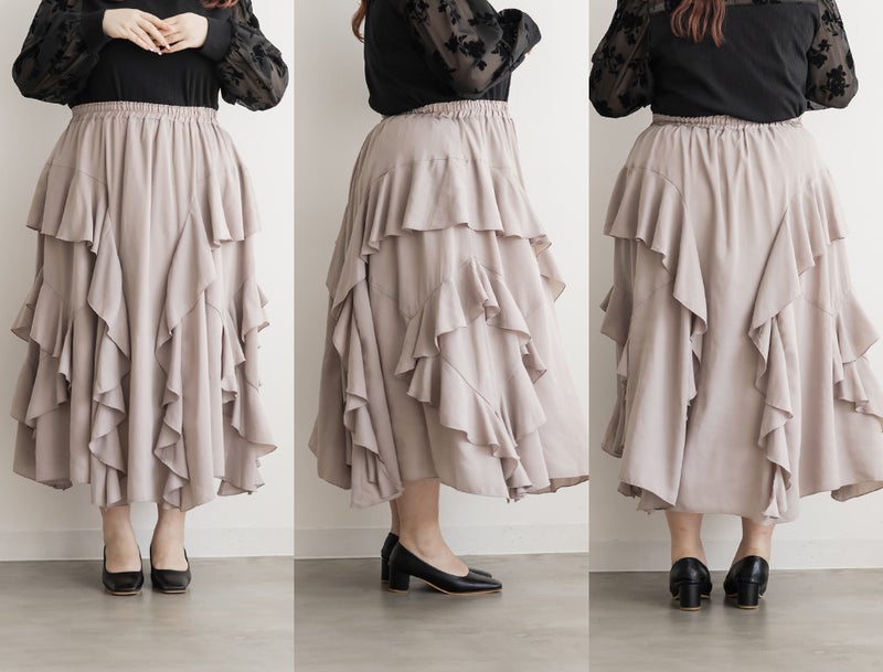 3Lサイズを着用しました。ウエストは総ゴム仕様でラクに履けてちょうどよかったです◎ラッフルデザインが歩くたびにひらっと揺れて、女性らしさをしっかり演出してくれます。ロング丈なので気になる足元もカバーしつつ、縦のラインを強調してくれるのでスタイルアップ効果も♪シンプルなトップスを合わせるだけで華やかになるので、普段使いはもちろん、ちょっとしたお出かけにもぴったりでした。