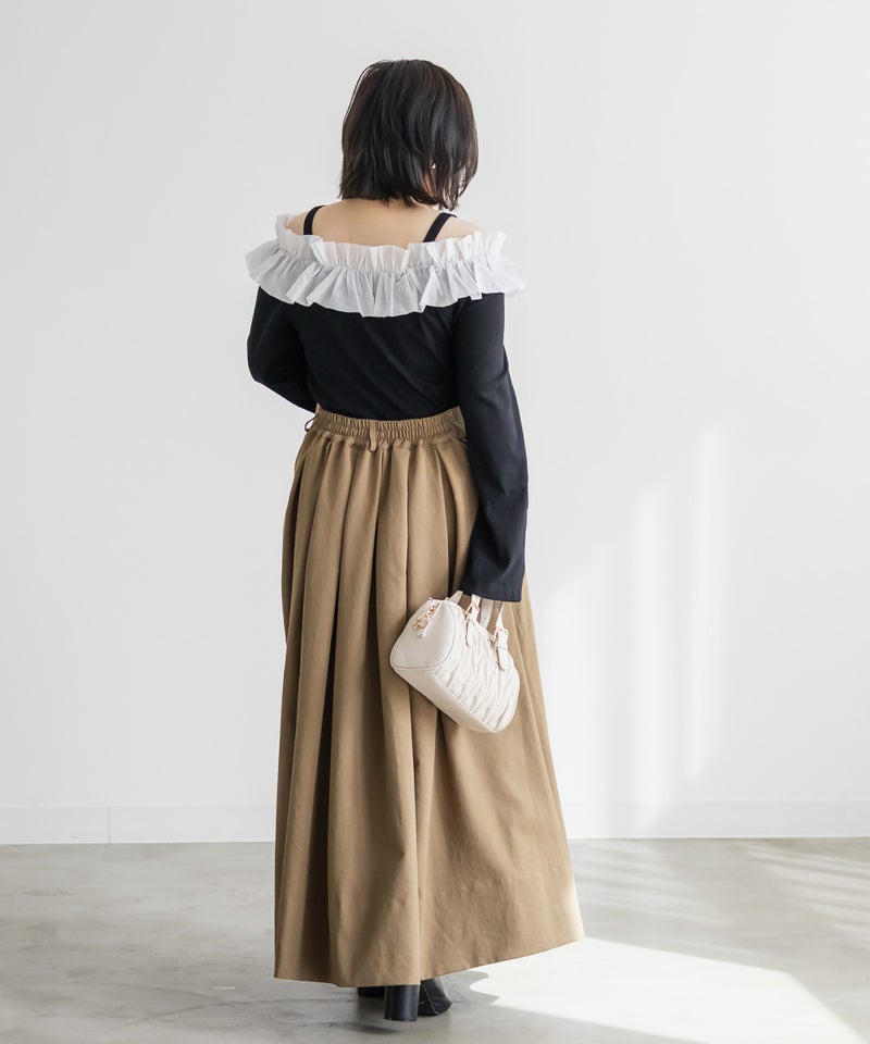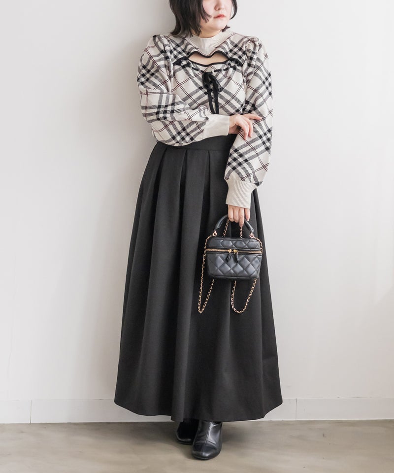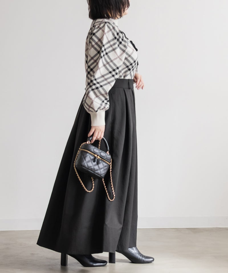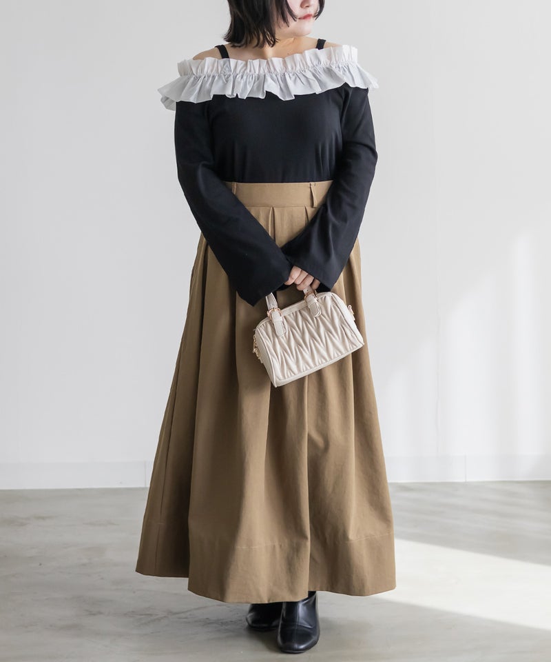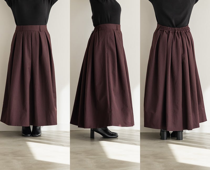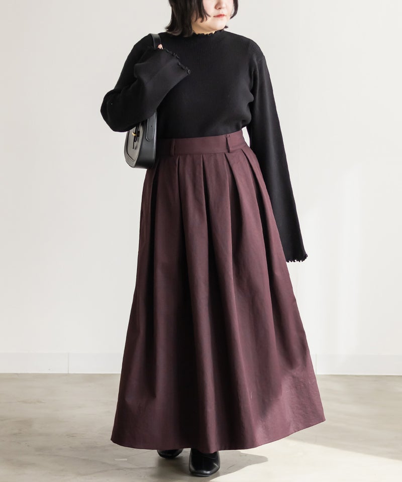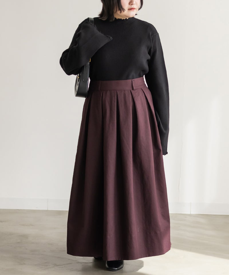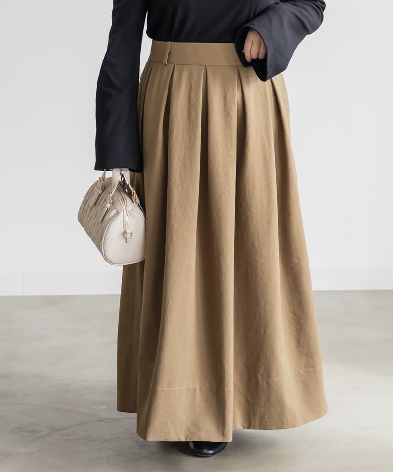 LLサイズを着用してぴったりの着心地でした。ウエストは巾広い後ろゴム仕様なので窮屈感のない着心地です◎ファスナーもついているので着脱もらくちん♪たっぷりとしたタックがお腹やお尻をすっぽりカバーしてくれて、ウエストをしっかりキュッと引き締めてくれるデザインです。お腹周りはフレアシルエットがすっきりとカバーしてくれるので華奢見えが叶います♪たっぷりの生地感が歩くたびにゆれて女性らしく綺麗なシルエットです!今っぽいデザインのスカートでオールシーズン使えるのも高ポイントです。