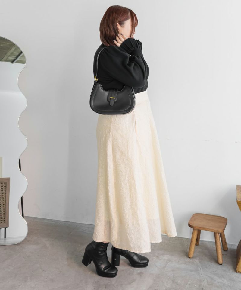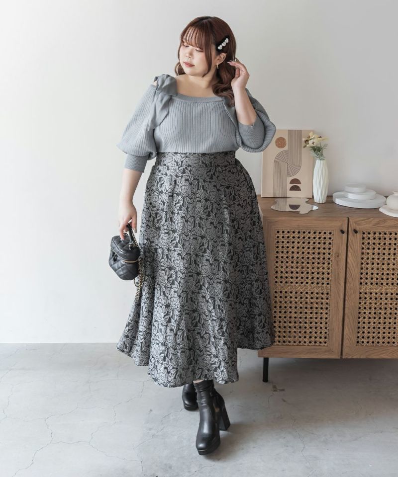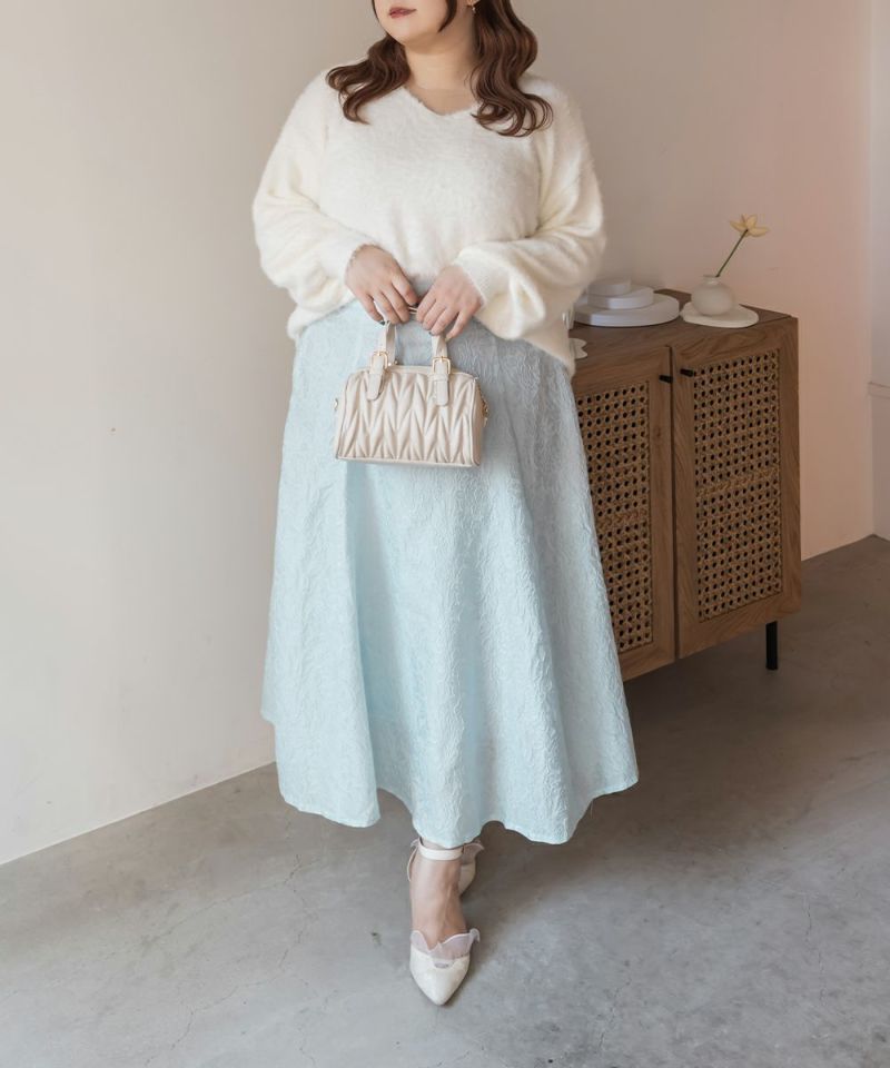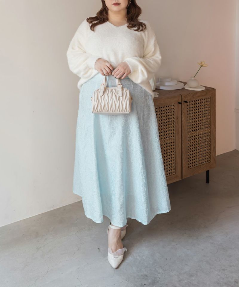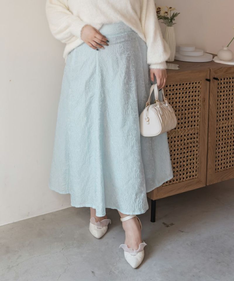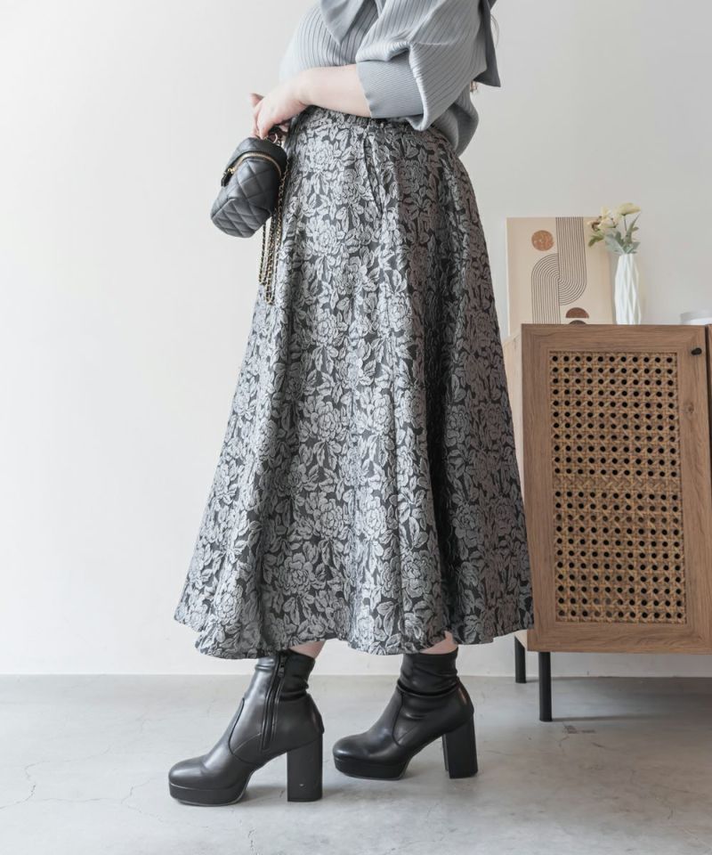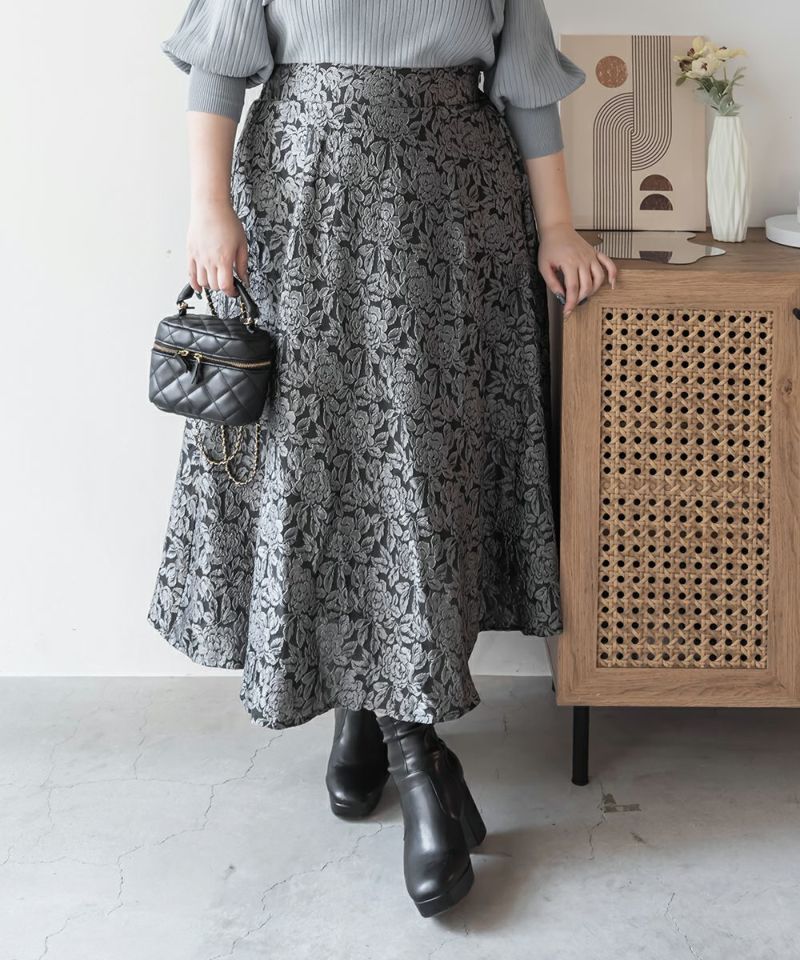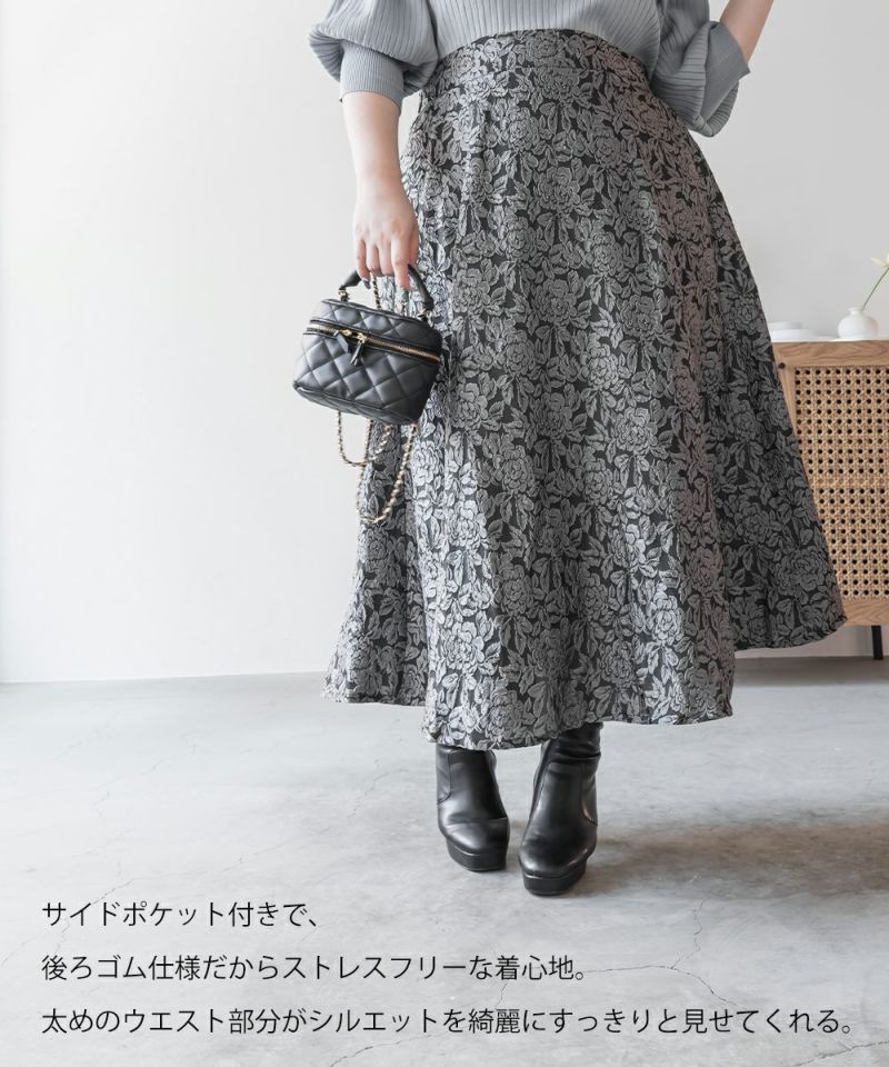 3Lサイズを着用しました! ウエストは後ろゴム仕様でフィット感がありながらも、締め付け感がなく快適な履き心地でした!パネル切替でふんわりと立体的なシルエットになり、気になる腰まわりもカバーしてくれます。 軽やかなジャガード素材に上品な花柄が施されていて、動くたびにふわっと揺れるのが魅力です◎軽い着心地だけど大人っぽく高級感のある印象を演出してくれます!シンプルなトップスと合わせるだけでコーデが華やかになり、きれいめにもカジュアルにも着こなしやすいのが嬉しいポイントです♪軽やかな雰囲気なので重たくならず、季節を問わず長く楽しめる1枚です! 足元はパンプスできれいめに仕上げるのはもちろん、スニーカーと合わせてカジュアルダウンするのもおすすめです!花柄スカートが好きな方や、上品な雰囲気のスカートをお探しの方にぴったりのアイテムです!