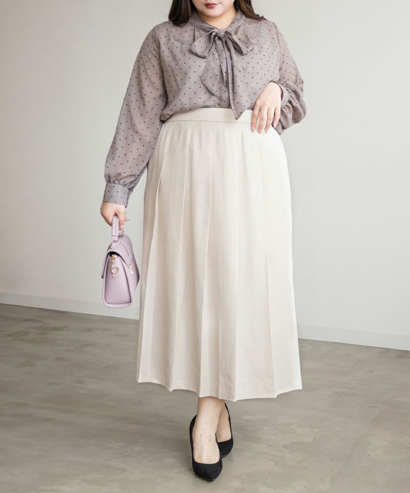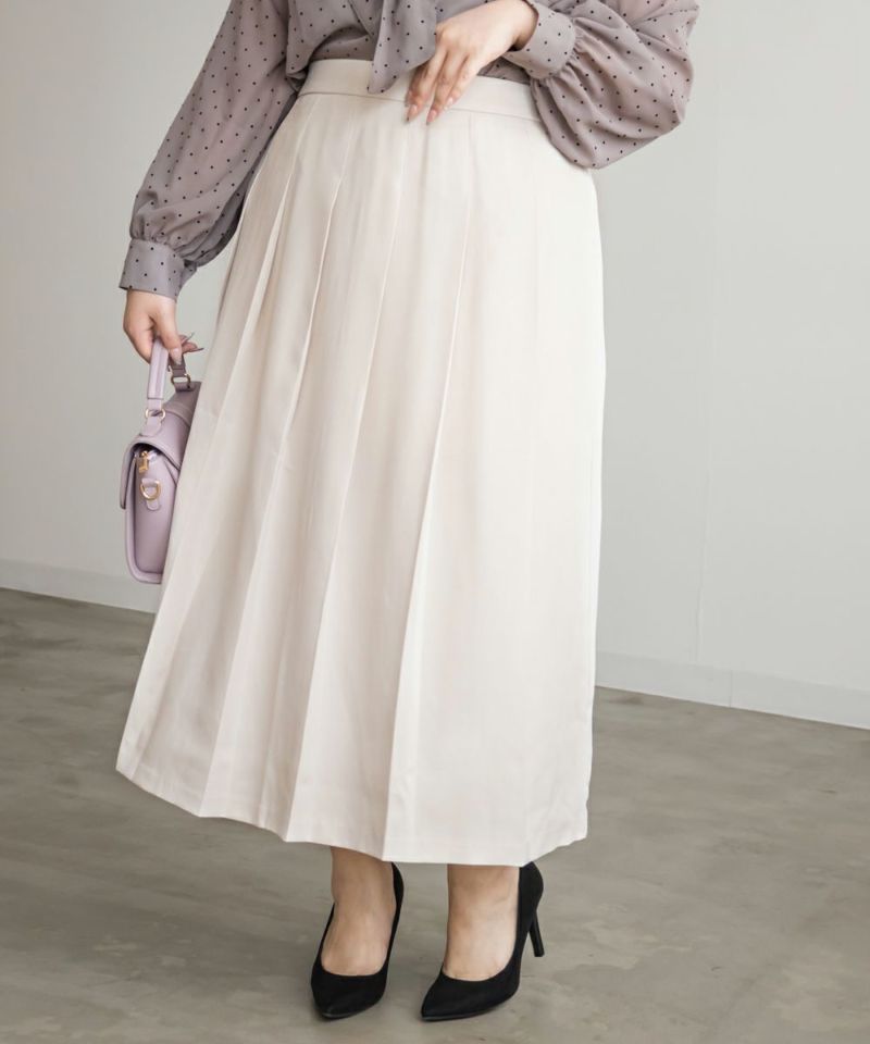 3Lサイズを着用しました。後ろはゴムで窮屈感無く、ちょうどいいサイズ感でした!プリーツの落ち感がきれいで上品見えします。後ろはプリーツ加工されていないので、座ったりしても安心です◎長すぎない着丈で低身長さんにもおすすめです!フレアシルエットで腰回りや太もも周りをしっかりカバーしてくれて、ブーツ合わせはもちろん、フラットシューズでもヒールでもバランスよく合わせられそうです!きれいめにもカジュアルにも使えて、オンオフ問わず活躍してくれるスカートです!