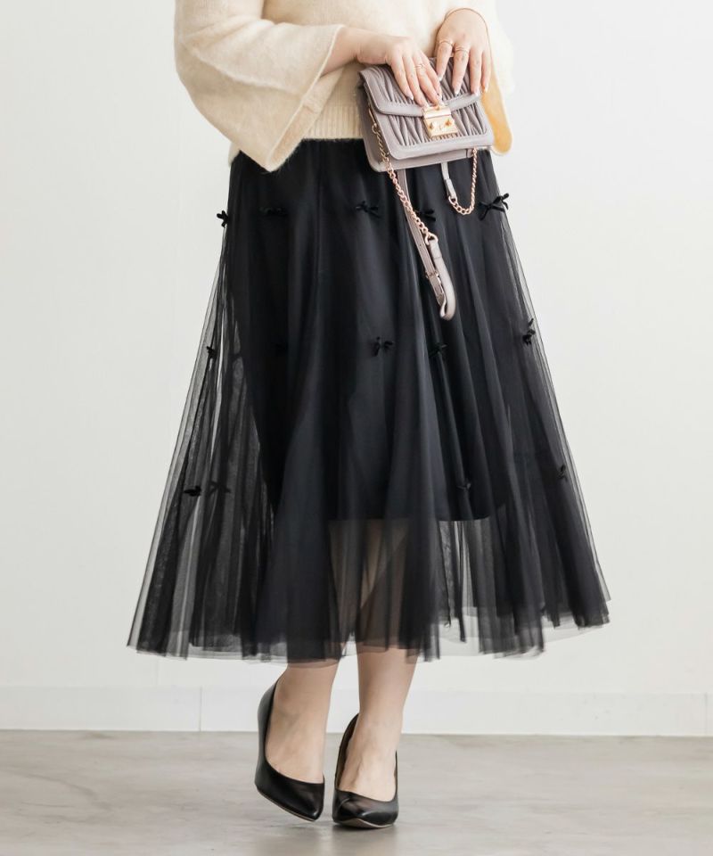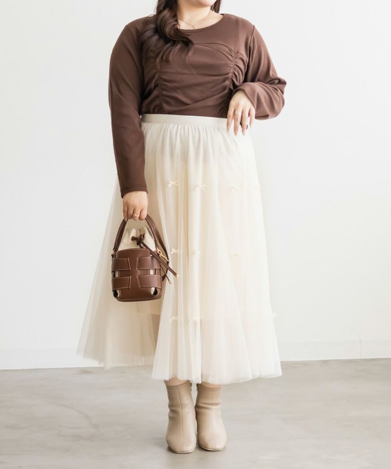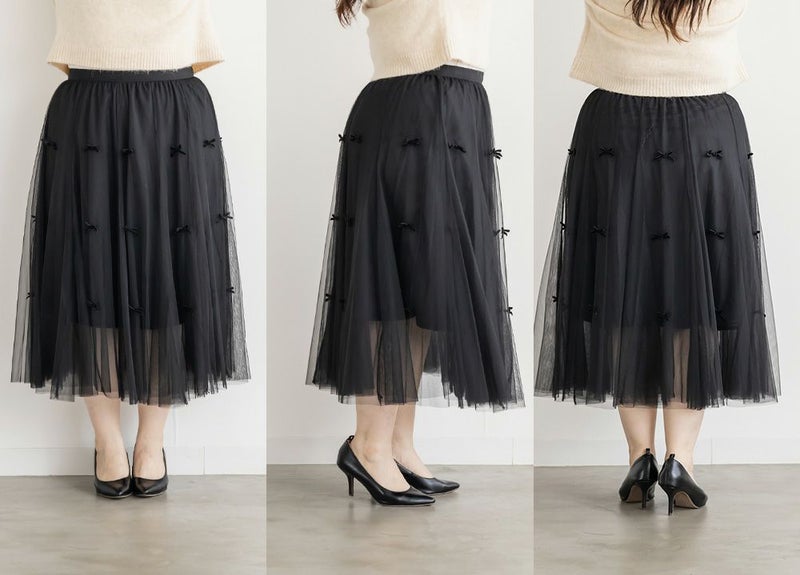 3Lを着てちょうどいいサイズ感でした。ウエストはゴムになっていて着心地ラクチン◎ひらひら軽い着心地のチュールにリボンあしらわれていて、ガーリーな1枚です♪フレアシルエットで広がりすぎないのでトップスを選ばずにすっきりと着用出来ます!オールシーズン着られるのでデートやお出かけにたくさん着回ししたいスカートです。