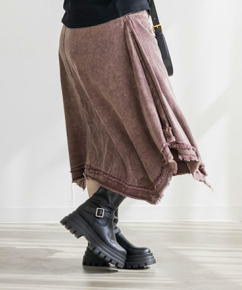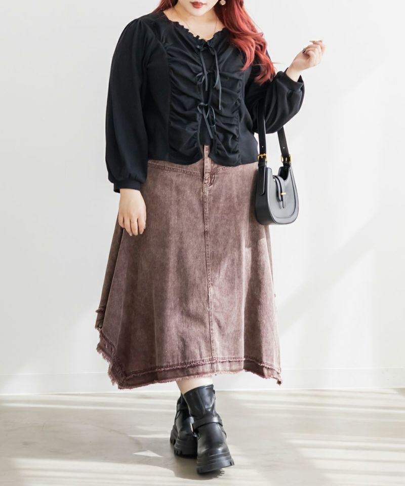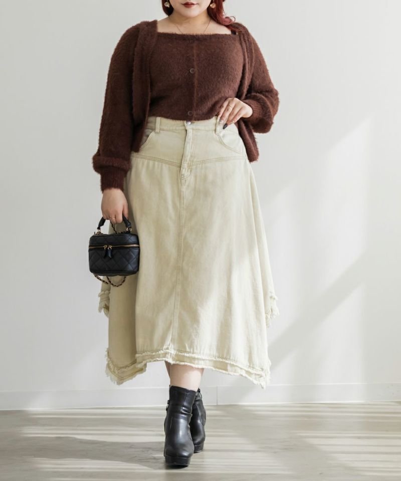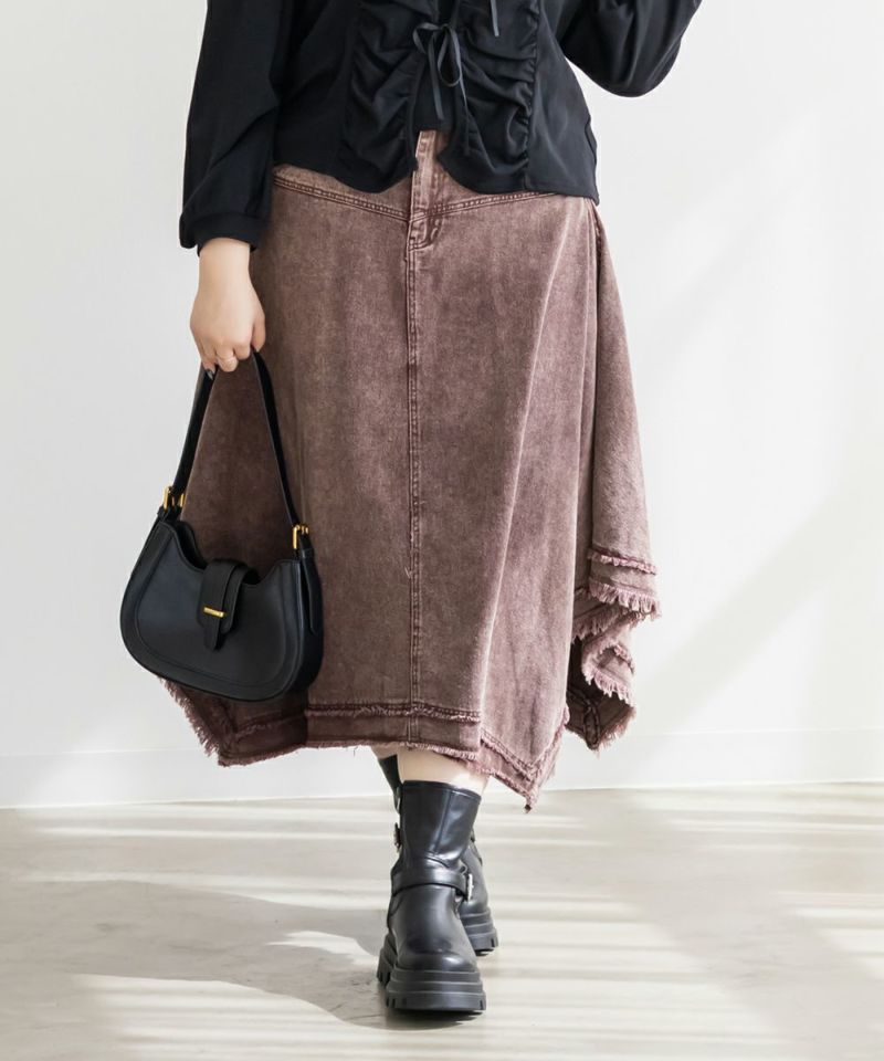 3Lを着てピッタリのサイズ感でした。ウエストは後ろゴム仕様で穿き心地もラクです。生地にほどよいハリがあるので体のラインを拾わず、すっきりとしたシルエットで着られました。フリンジデザインが目を引くおしゃれなスカートで、裾のイレヘムデザインが動くたびに軽やかで、シンプルなトップスを合わせるだけでもコーデが決まります◎ 丈感もミディ丈でバランスが取りやすく、ブーツにもパンプスにも合う1枚です♪