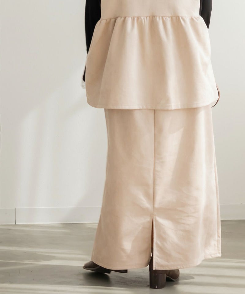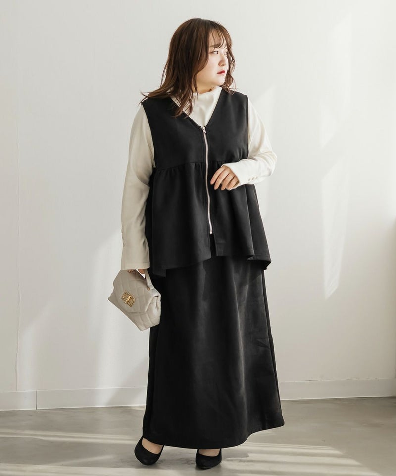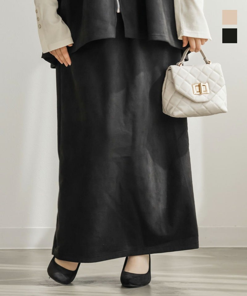 3Lを着てちょうどいい着心地でした。すっきりシルエットのナロースカートですが、ピタッとしすぎず着用出来ました!やわらかいスエード生地が季節感がありコーデに取り入れやすいです!どんなアイテムとも相性良く着られて、ニットやスエット、ブラウスなど汎用性が高い1枚です!同じ生地のベストと合わせてセットアップコーデが出来て、大人っぽく着こなせます♪