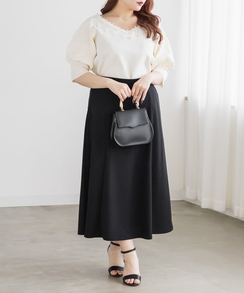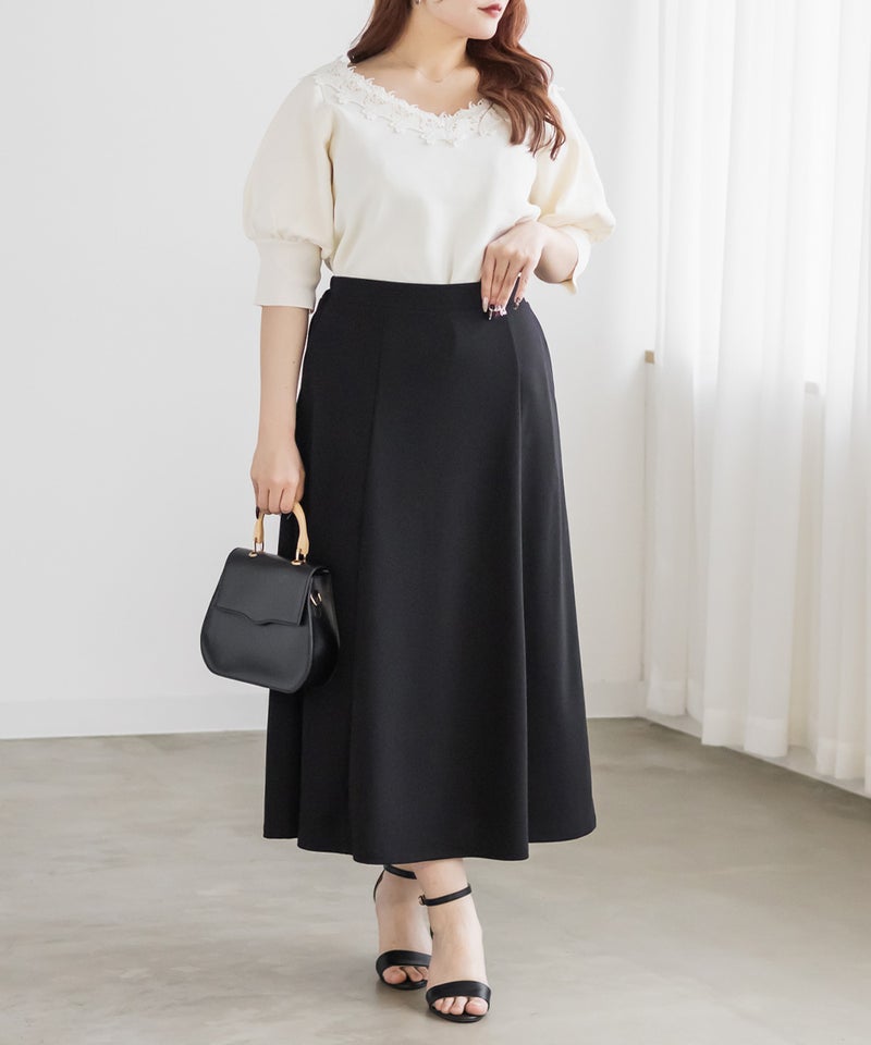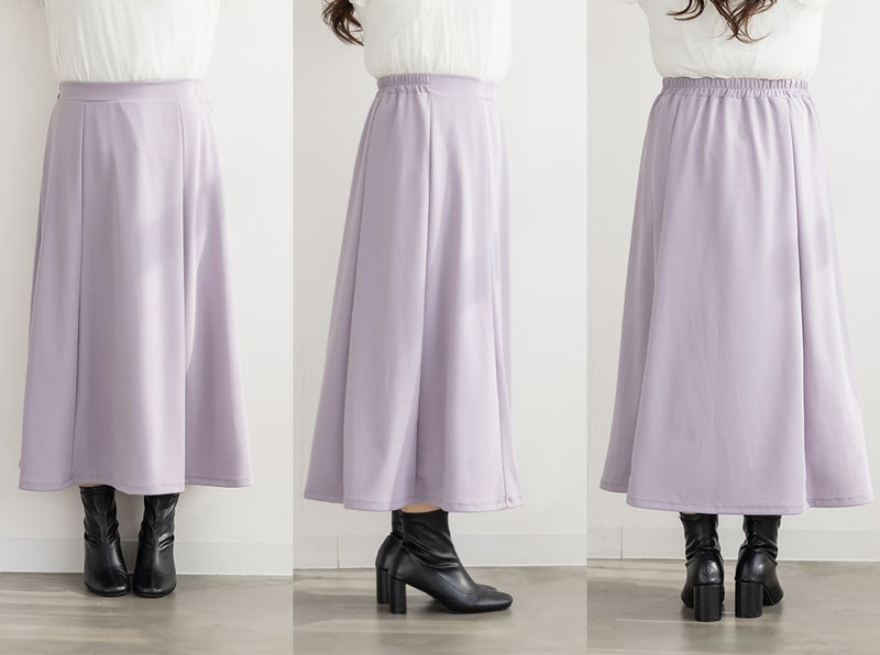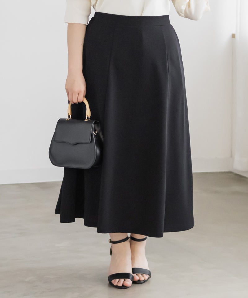 LLを着てちょうどいい着心地でした!ストレッチ素材とフレアに広がるスカートなので締め付けがなくとってもらくちんな着心地でした◎シンプルなフレアスカートですがパネル切替になっているのでメリハリがついてすっきり着られます。長すぎない着丈なので足首が華奢に見えてフェミニンな印象です♪普段使いもしやすい1枚ですが、オフィスなどにも着回しできるので汎用性の高い1枚です!