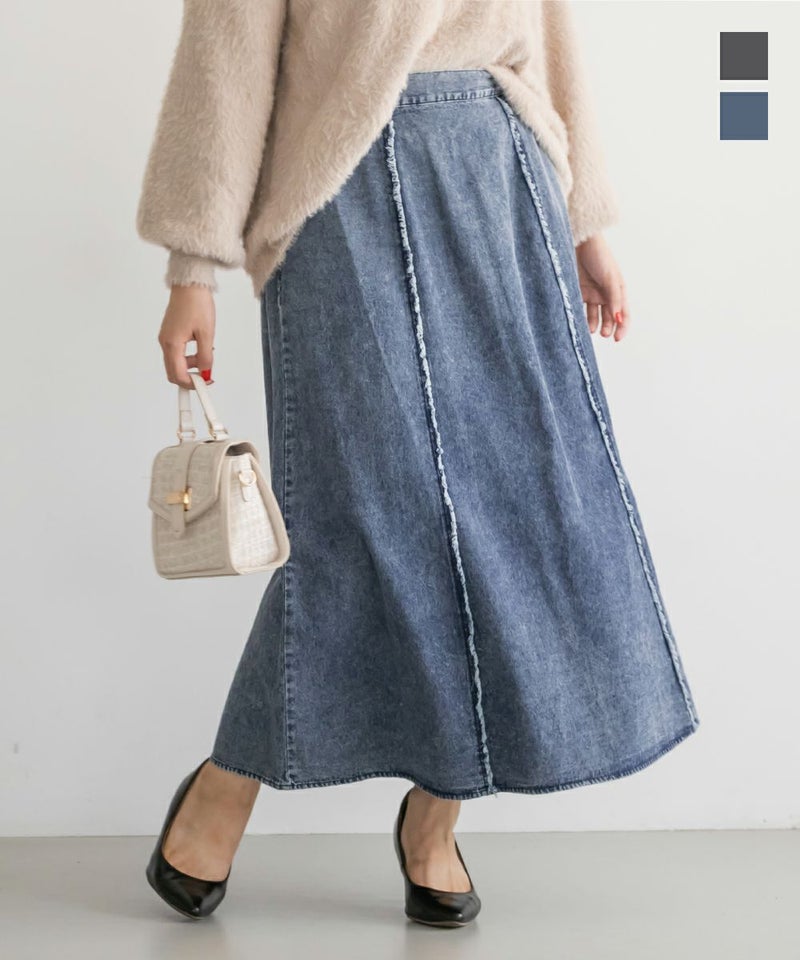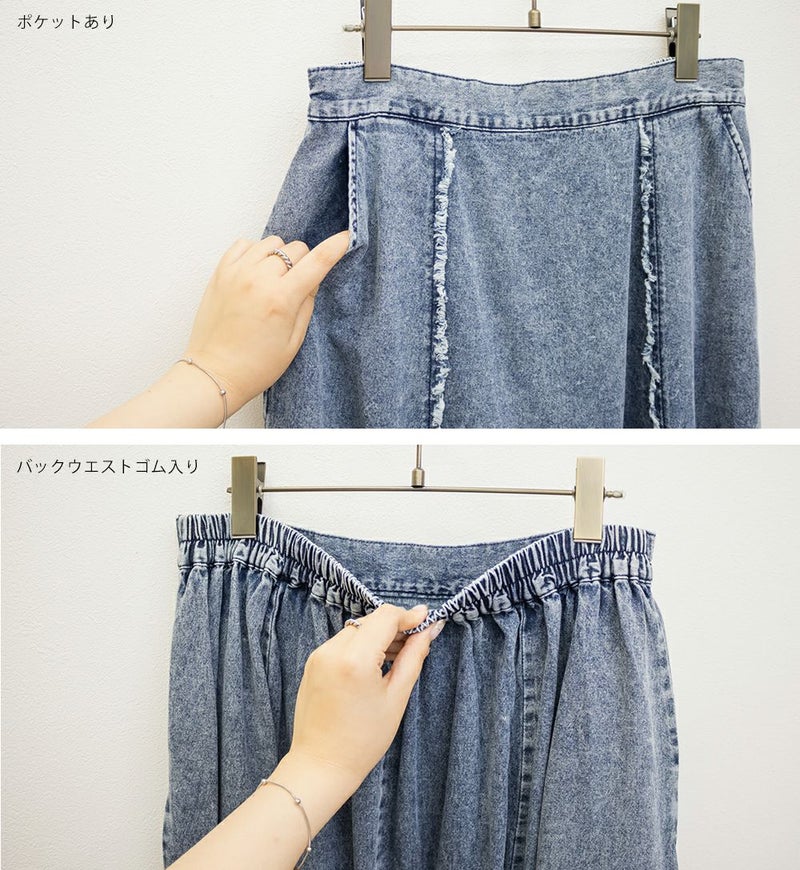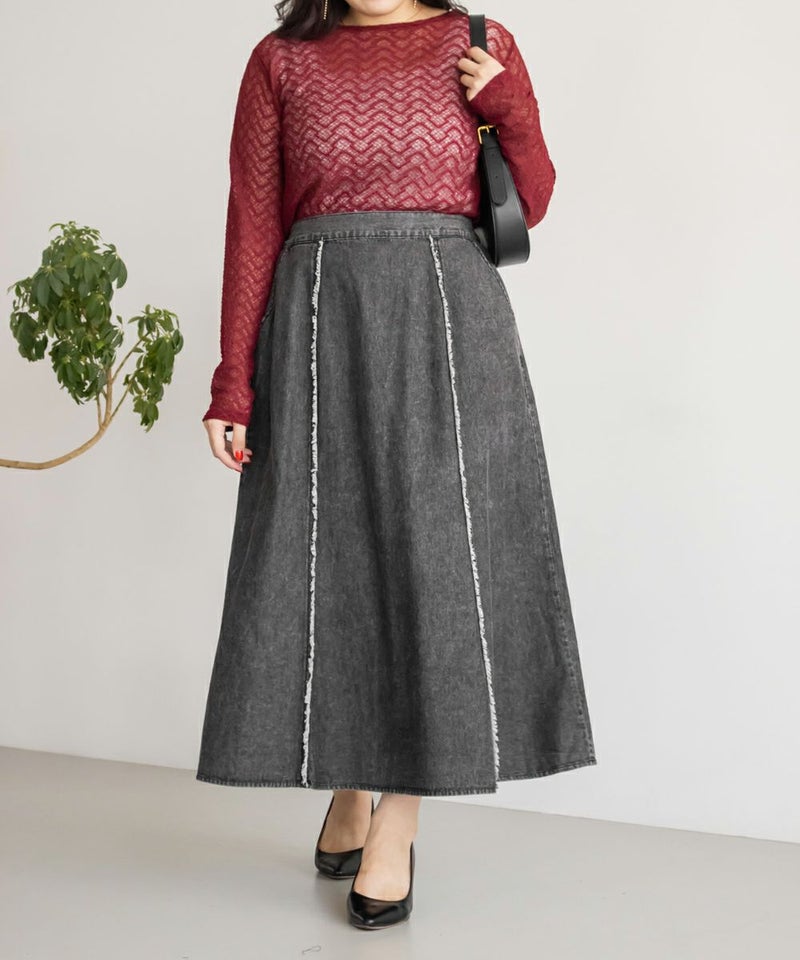 3Lサイズを着用てちょうどよいサイズ感でした!後ろゴムで窮屈感無く着脱も問題なくできました。縦に入ったフリンジが、すっきりと華奢に見せてくれます。カジュアルなデニム素材ながら、女性らしいマーメイドラインのスカートにデザインされていて、幅広いイメージで着こなせます!軽いデニム生地なのでごわつきにくいのも嬉しい!カジュアルコーデからキレイめまで合わせられるのでトップスを選ばず着用していただけます!