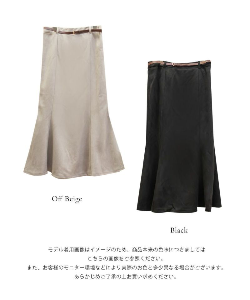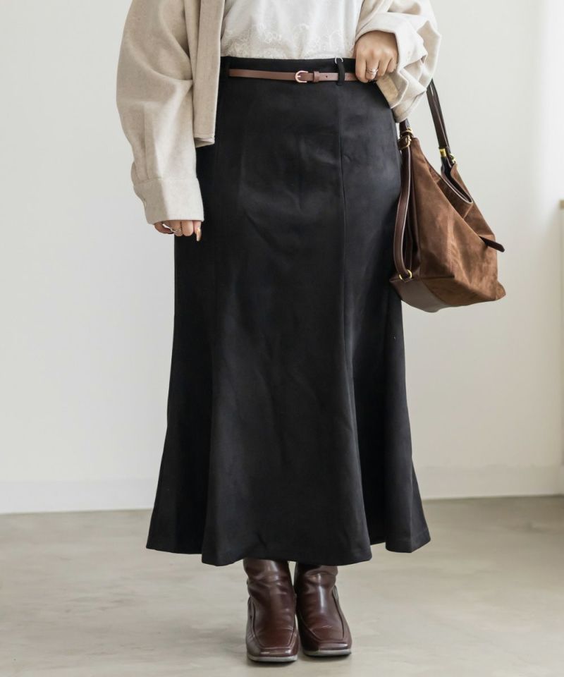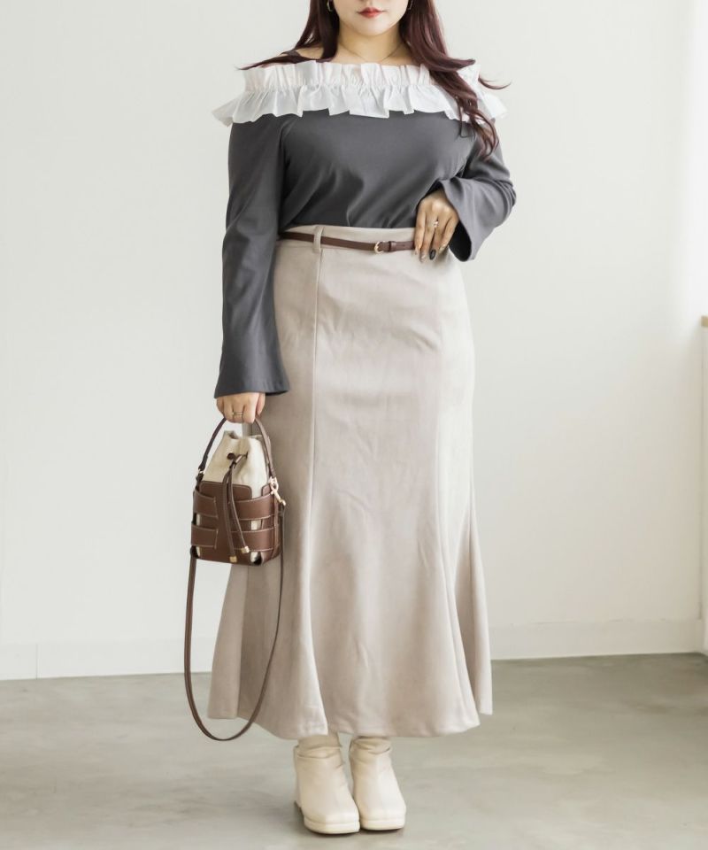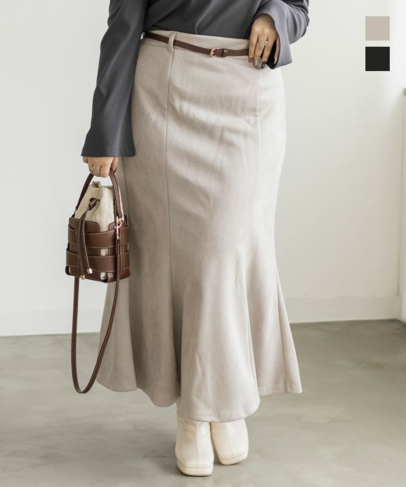3Lサイズを着用して、ジャストサイズでした。フィット感のあるマーメイドシルエットなので、腰回りなど気になる方はヒップ等のサイズ確認をお勧めします◎後ろゴム仕様なのと、ベルトがついているので幅広いサイズ感の方に着用していただけます。裾に向かって流れるマーメイドシルエットなので下半身を華奢にみせてくれます。長めのスカート丈も脚長に見え、ブーツなどを合わせて季節感のある着こなしがおすすめです!オールシーズン着用でき、ベルト付きなのも嬉しいポイントです♪