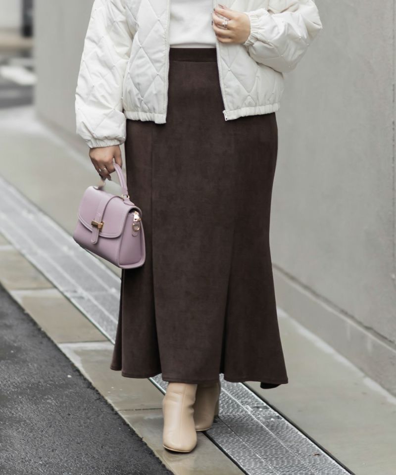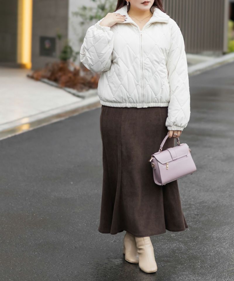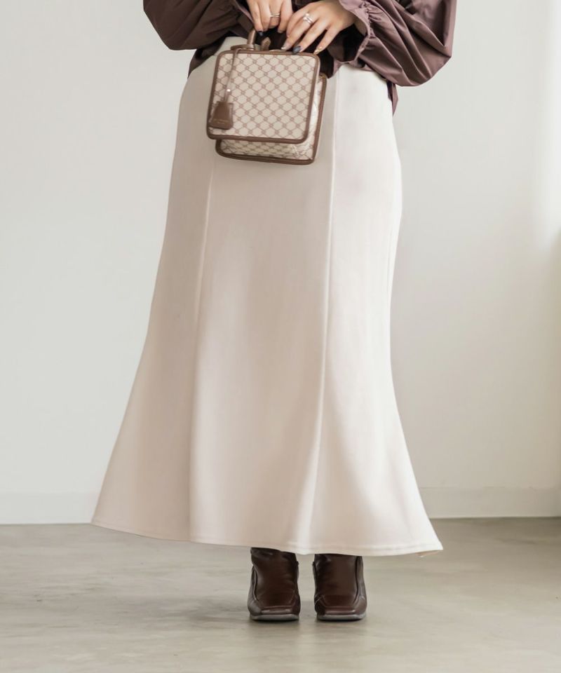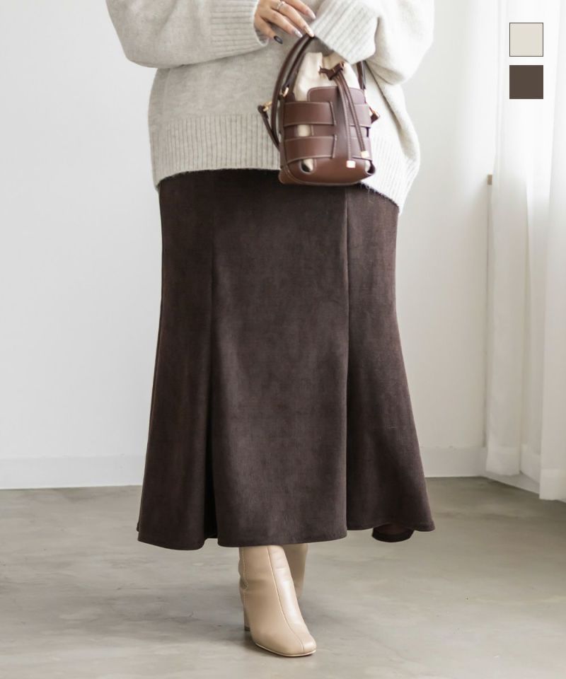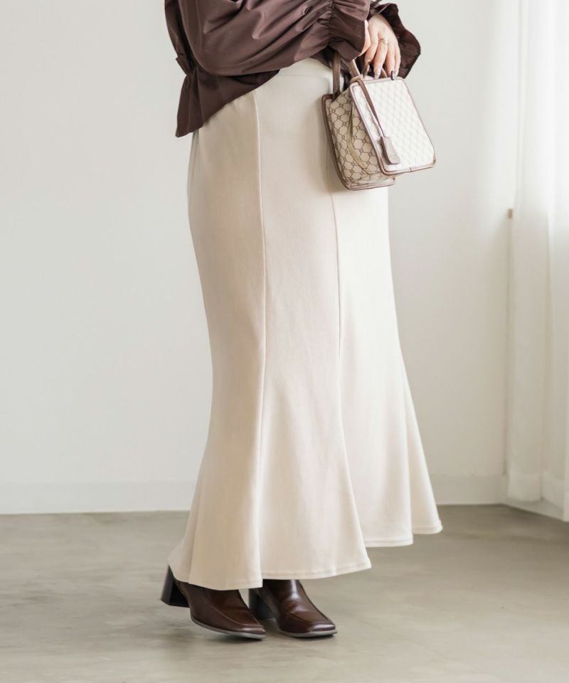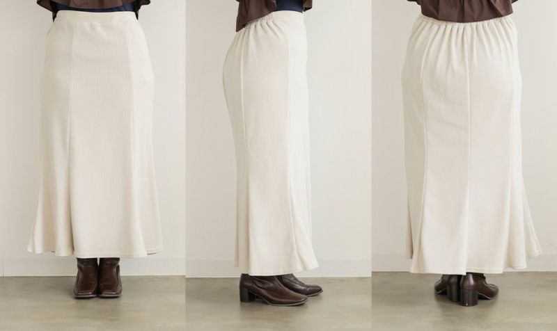 3Lサイズを着用して、ぴったりの着心地でした!ウエストは 後ろゴム仕様なのと生地自体も程よく伸びるので安心感があり、ストレスなく過ごせそうです。マーメイドラインの裾は動くたびに揺れるシルエットが女性らしくきれいに見せてくれるのに締め付け感がないのが嬉しいポイントです!表面感に温かみのあるウール調になっていて、季節感のある雰囲気です!冬のオフィスコーデでにも良さそうです!シンプルトップスからブラウス、ニット合わせまで幅広くコーディネートを楽しめます◎ オフィスカジュアルから休日のおでかけスタイルまで大活躍の予感です!