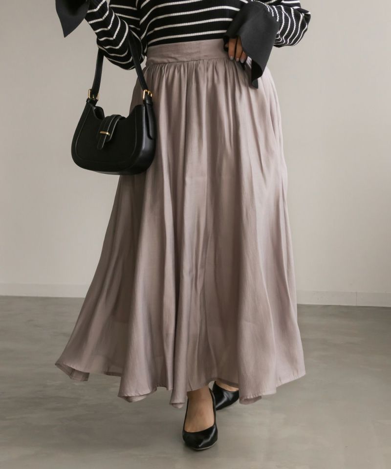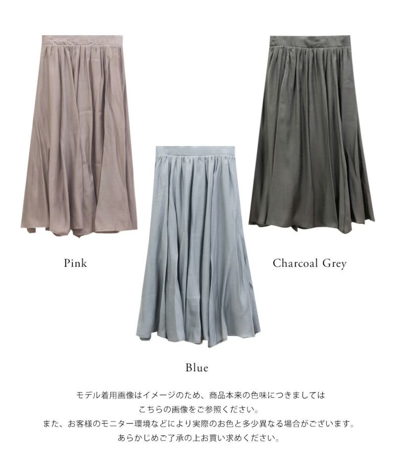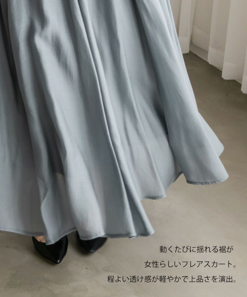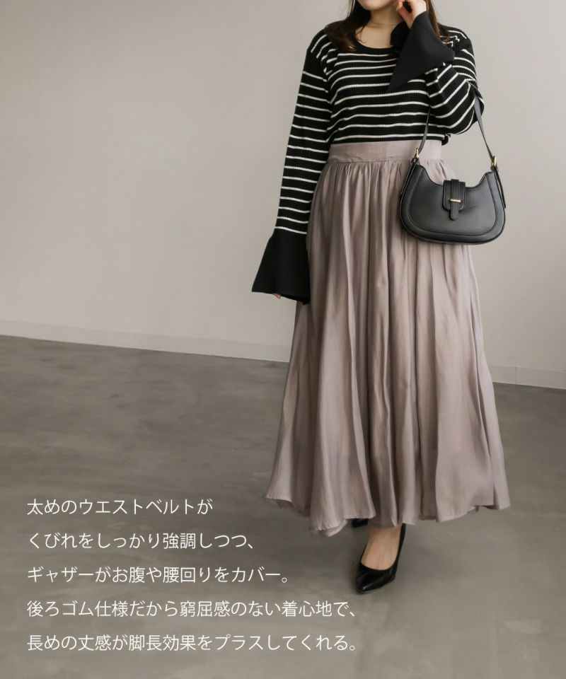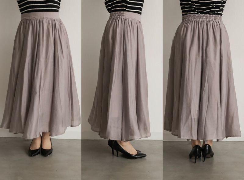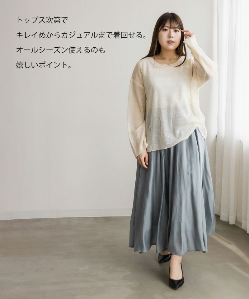 3Lサイズを着用して丁度いいサイズ感でした。後ろウエストは巾広めのゴムなので窮屈感のない着心地です◎たっぷりとしたギャザーがボディラインを拾わずに着られて綺麗なシルエットで着用出来ました。ウエストをキュッと見せてくれるフィット&フレアシルエットが歩くたびにゆれて女性らしいデザインです!さらりとした生地なのでオールシーズン大活躍します!