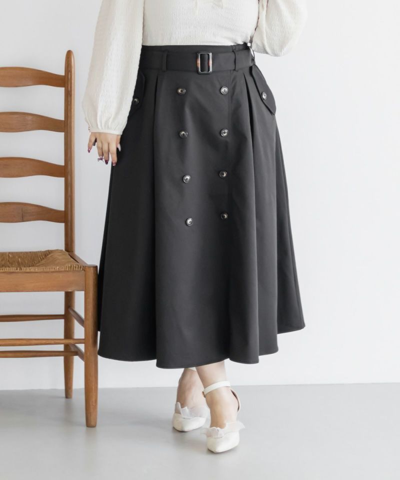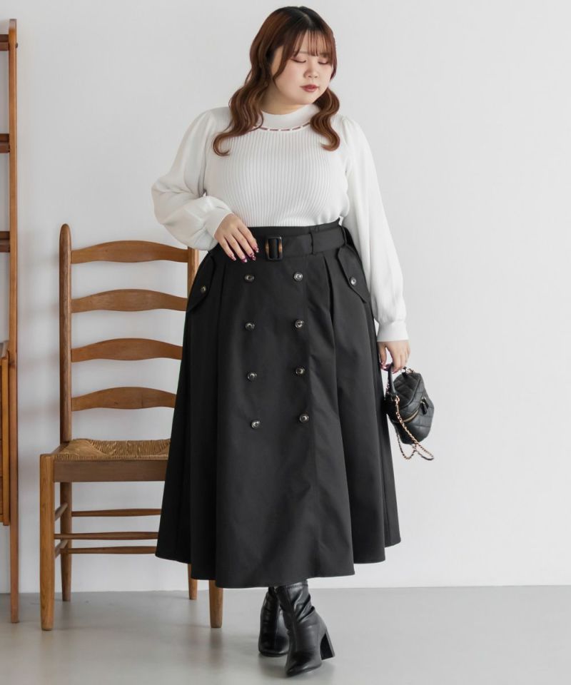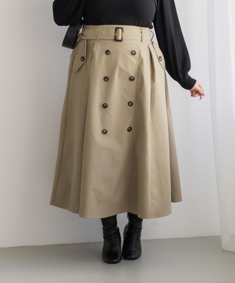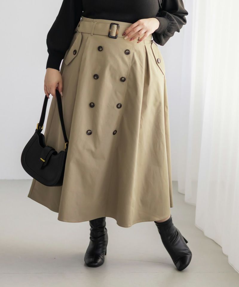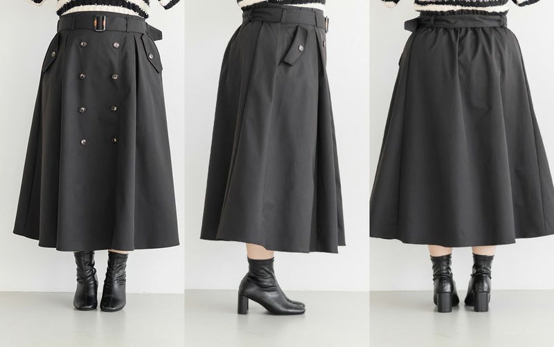 3Lを着て丁度いいサイズでした。後ろゴムなのとベルト付きでサイズ感は心配なさそうです!ハリのある生地で、Aラインのシルエットを綺麗に保ってくれます!トレンチデザインで清楚な着こなしにしてくれます♪シンプルなトップスと相性良く着られて、デートやお出かけなどにも活躍します◎