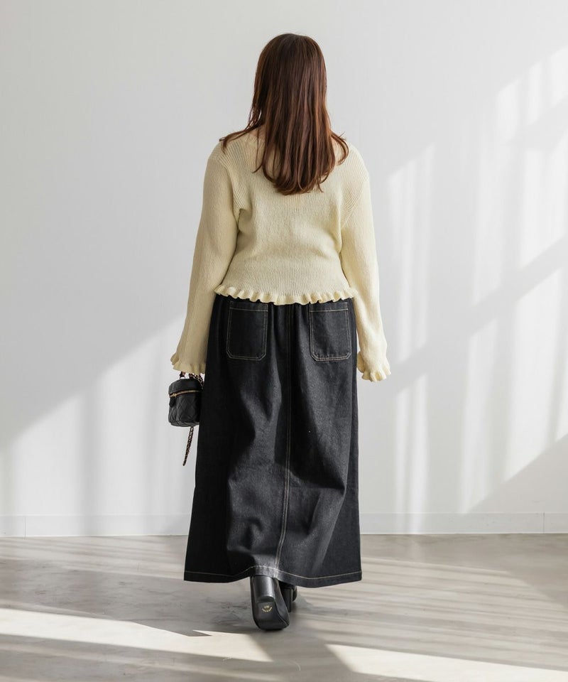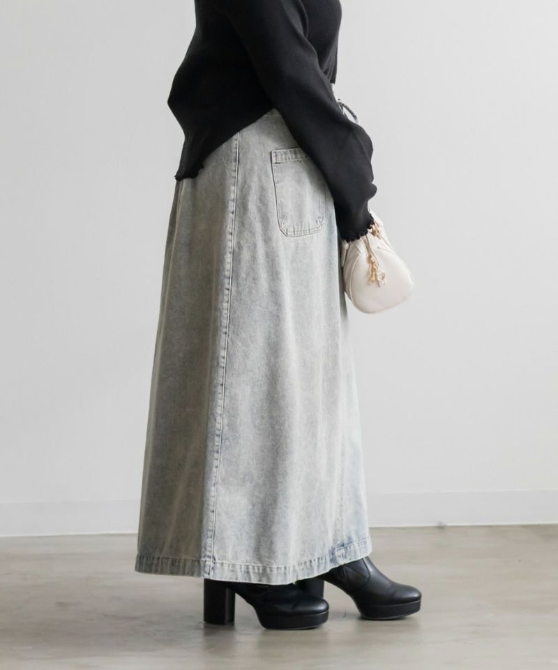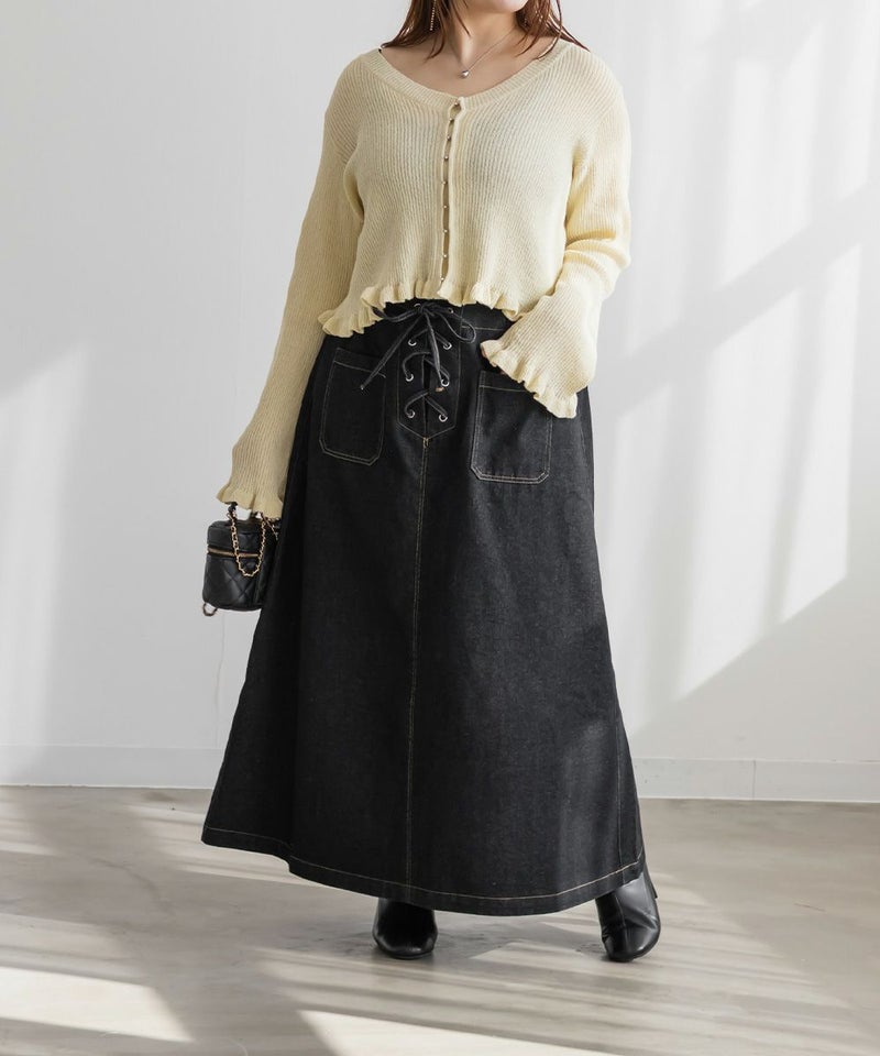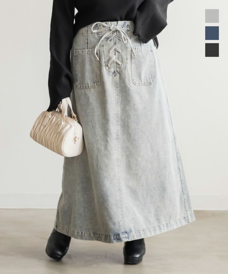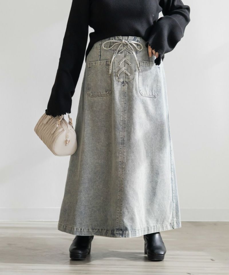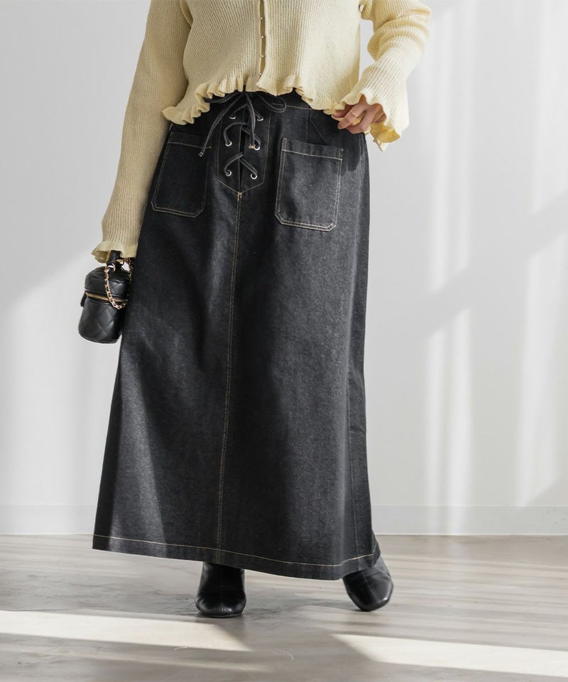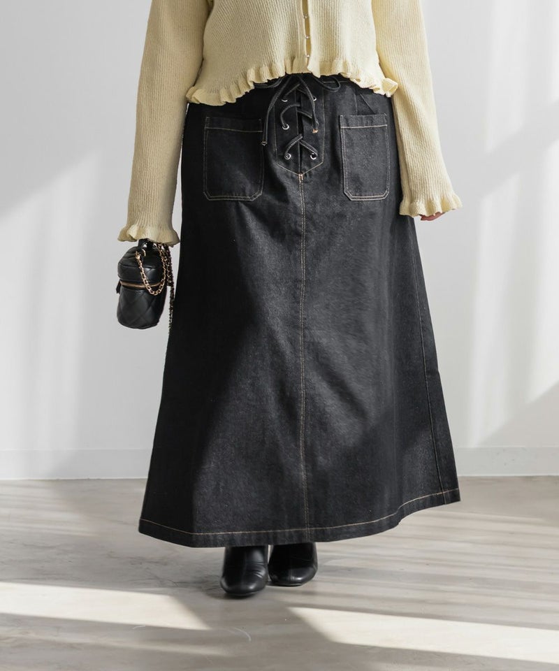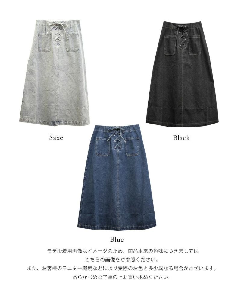 【design】シンプルな中に女性らしさをを取り入れたフロントデザイン。レースアップとポケットがポイントになってお腹まわりをカバーしてくれる。大人っぽくスタイルアップが叶うAラインシルエット。【material】しっかりとしたデニム生地で、サックスとブルーはビンテージ調の洗い加工、ブラックは落ち着いた雰囲気のカラーで仕上げました。程よくハリのある生地だから、ボディラインも拾いづらく、オールシーズン着用可能です。【styling】シンプルなシルエットだからシャツ・ニット・カットソー,どんなトップスとも合わせやすい。コーデの主役になれるようなデザイン性のあるスカートだから、ベーシックなトップスを着てもこなれ感のある着こなしに。