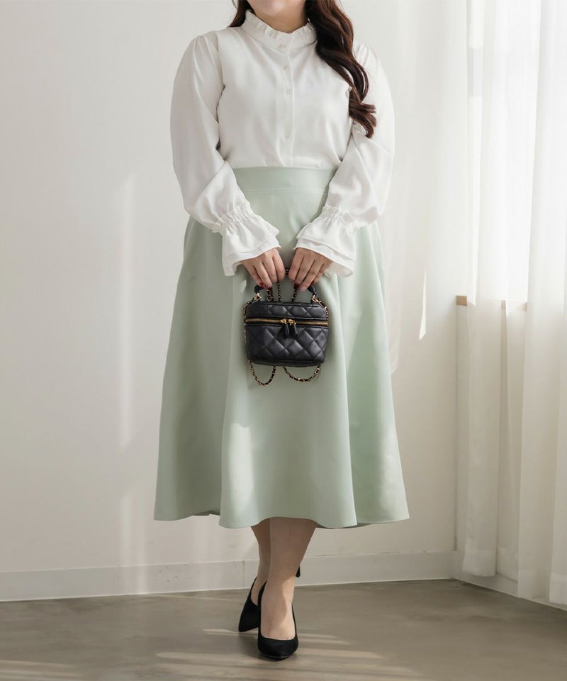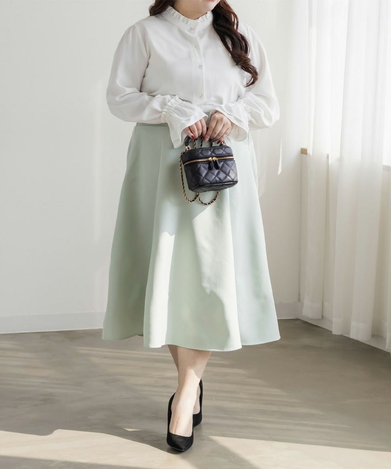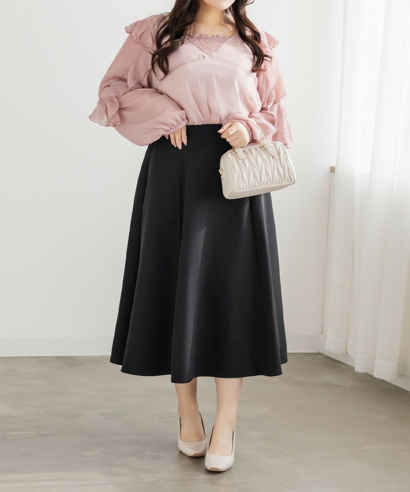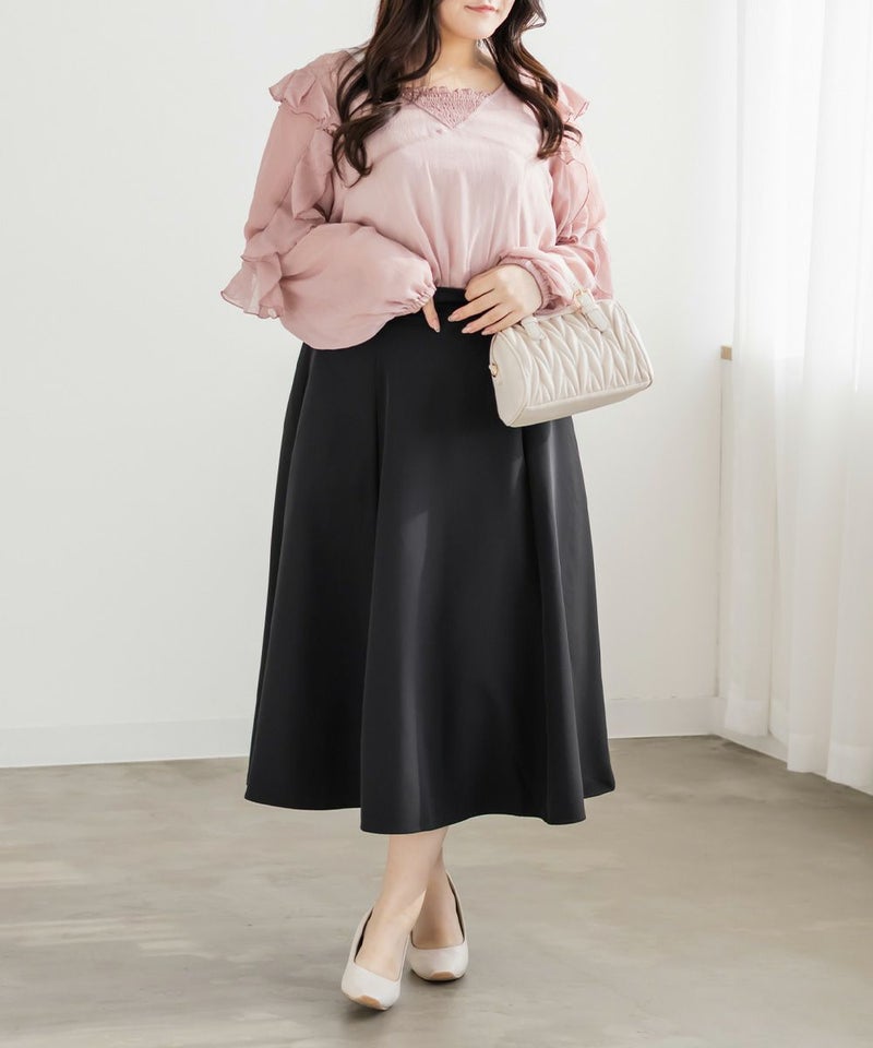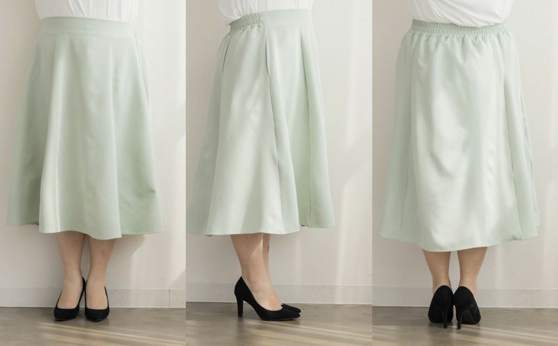 3Lサイズを着用して丁度いいサイズ感でした。後ろウエストは巾広めのゴムなので窮屈感のない着心地です◎ギャザーやタックではなくパネル切替になっていているのですっきりとしたシルエットで女性らしい雰囲気で着られました。さらりとした落ち感がある生地でオールシーズン大活躍します!たっぷりとしたフレアシルエットが歩くたびにゆれてかわいいです!着丈も長すぎず、きれいめな印象があるのでデートなどにはもちろん、お仕事などフォーマルなシーンにもお使いいただけます♪