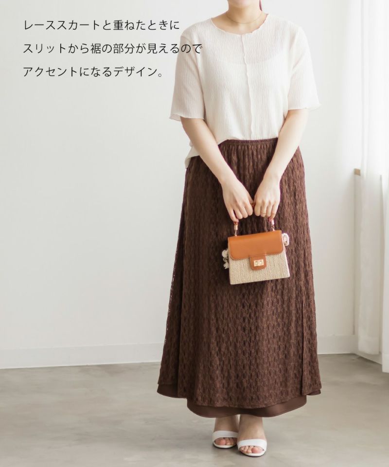 3Lを着て、ちょうどいいサイズ感でした。ウエストは総ゴム仕様で穿き心地もらくちんでした◎着丈も足首くらいのバランスでちょうどいいです!レースを前にして2枚で着用したり、サテンスカート単品で使ったり、レーススカートのみでパンツなどとレイヤードしたり、どのパターンも大人可愛く決まるので、気分で使い分けたいです♪レーススカートは総レースで上品さもあって、スリット入りでチラッと重ね着が見えるのもポイントです◎サテンスカートは、ツヤ感も綺麗できちんと感のある着こなしにもマッチします!1セットあると大活躍するスカートは1枚持っておくと本当に便利!