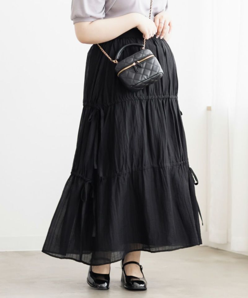 3Lサイズを着てちょうどいい着心地でした。ウエストは後ろゴムで窮屈感も無く、フレアシルエットなので身体のラインも拾わず足さばきもしやすかったです!優しい風合いが今っぽい着こなしにピッタリのトレンドアイテムです!ティアードとサイドにリボンがついているデザインがガーリーで女性らしさをプラスしてくれるアイテムです♪ふんわりとしたシルエットが特徴的で、動きが出るたびに美しく揺れます。カジュアルなトップスと合わせても、相性抜群なので普段使いにもぴったりです◎