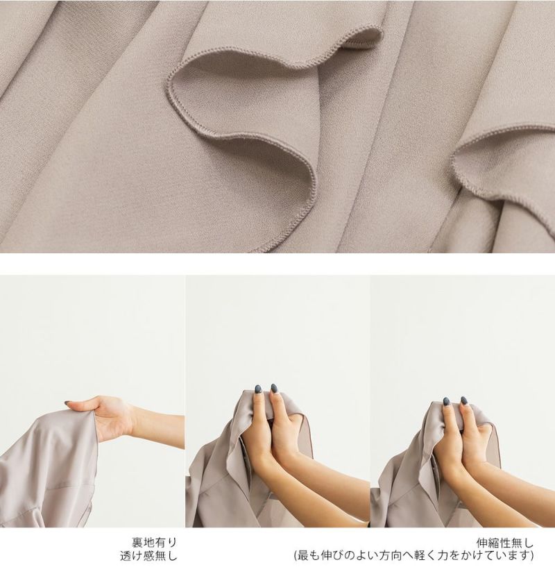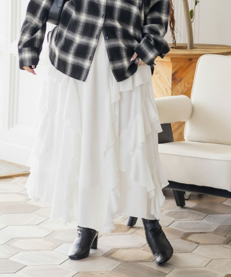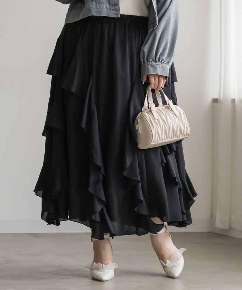 3Lサイズを着用しました。ウエストは総ゴム仕様でラクに履けてちょうどよかったです◎ラッフルデザインが歩くたびにひらっと揺れて、女性らしさをしっかり演出してくれます。ロング丈なので気になる足元もカバーしつつ、縦のラインを強調してくれるのでスタイルアップ効果も♪シンプルなトップスを合わせるだけで華やかになるので、普段使いはもちろん、ちょっとしたお出かけにもぴったりでした。