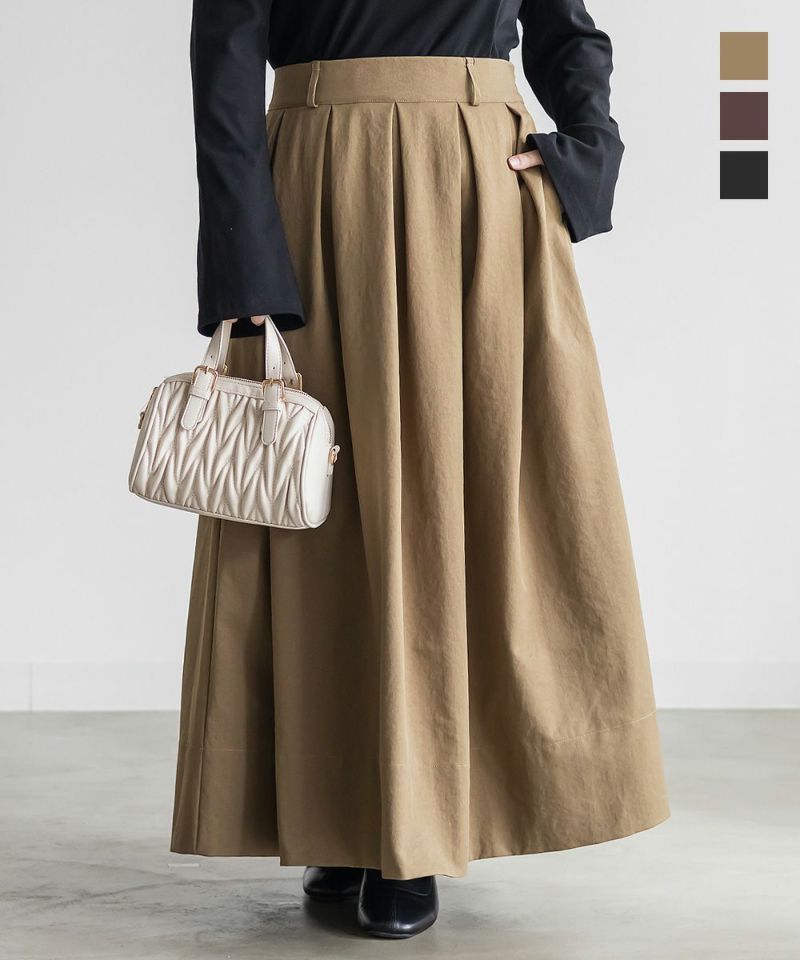 LLサイズを着用してぴったりの着心地でした。ウエストは巾広い後ろゴム仕様なので窮屈感のない着心地です◎ファスナーもついているので着脱もらくちん♪たっぷりとしたタックがお腹やお尻をすっぽりカバーしてくれて、ウエストをしっかりキュッと引き締めてくれるデザインです。お腹周りはフレアシルエットがすっきりとカバーしてくれるので華奢見えが叶います♪たっぷりの生地感が歩くたびにゆれて女性らしく綺麗なシルエットです!今っぽいデザインのスカートでオールシーズン使えるのも高ポイントです。