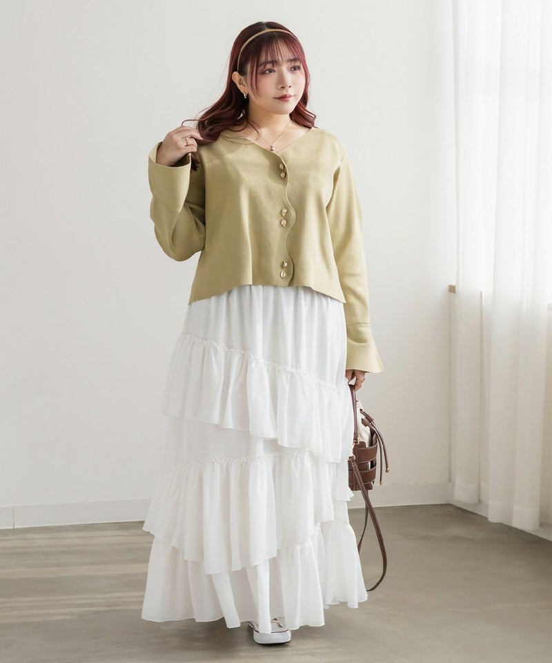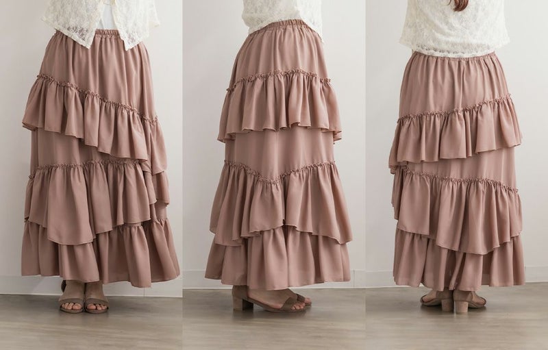 3Lを着てちょうどいいサイズでした。ウエストは全部ゴムになっていて着心地らくちんで、アシンメトリーに重ねた生地の揺れ感が華やかさを演出するティアードスカートです!しっかり落ち感があるのでシルエットも広がりすぎずお洒落な雰囲気です◎フェミニン・ガーリー系のトップスとのコーデはもちろん、ジャケットやシャツと合わせてフレッピー系にもピッタリです♪あえてTシャツやスニーカーを合わせたカジュアルな着こなしもおすすめです!