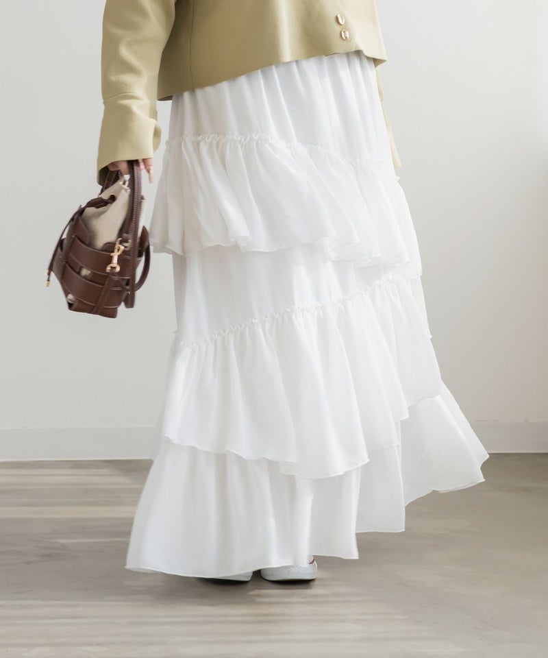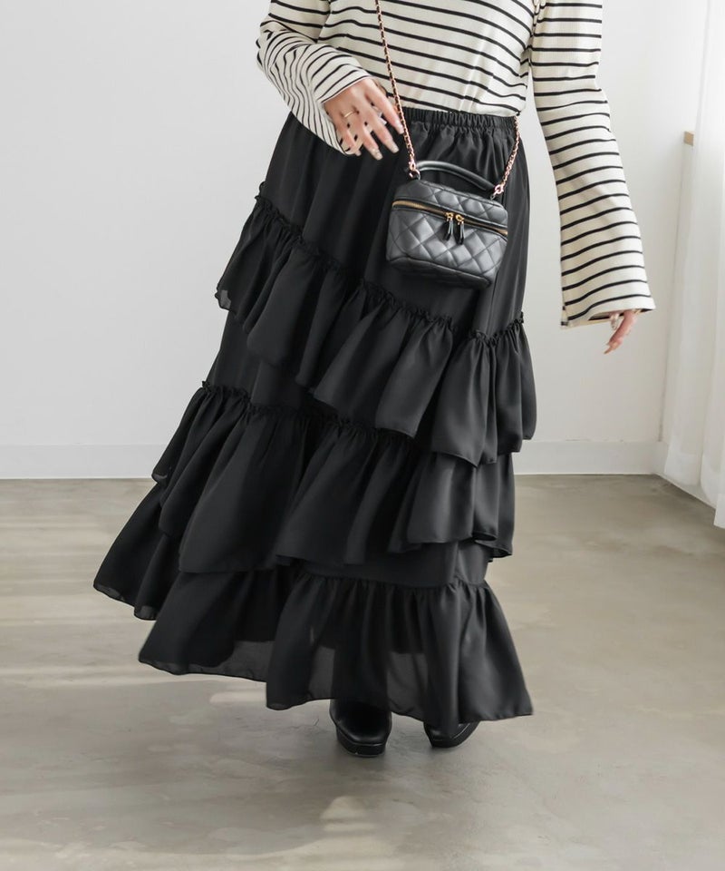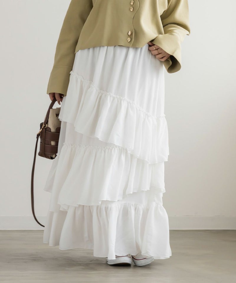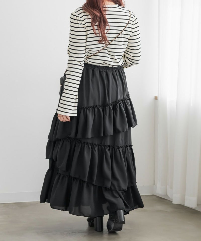 アシンメトリーなラッフルデザインがフェミニンなロングスカート。動くたび揺れるような軽やかなデザインで今っぽい着こなしに。