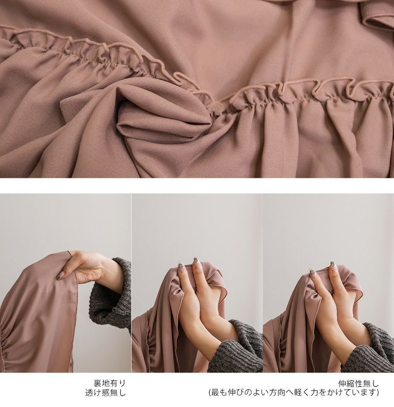 表地は柔らかく落ち感のあるジョーゼット生地、裏地にはさらりとした伸縮性のない生地を使用。オールシーズン着用可能な素材感。