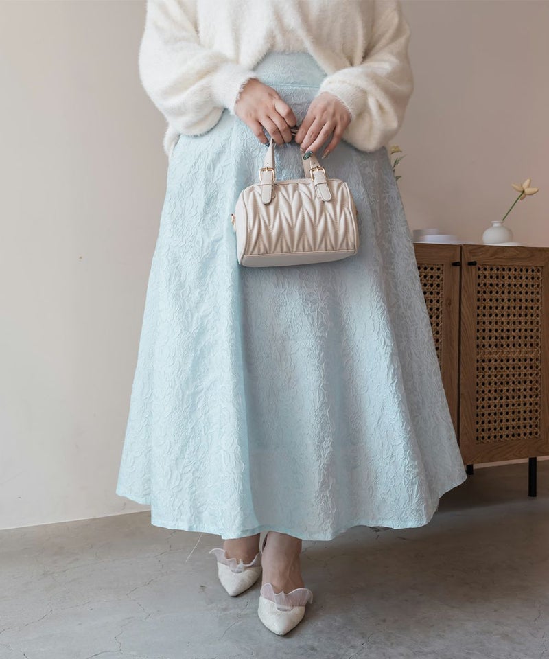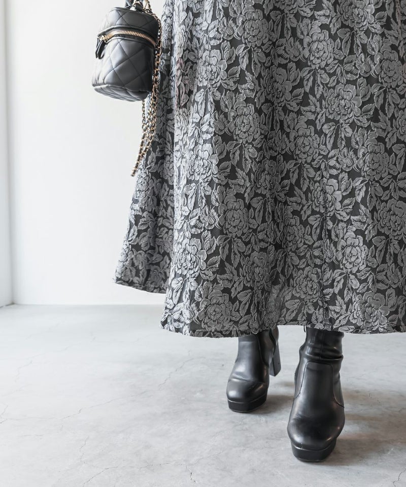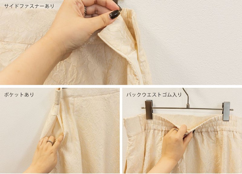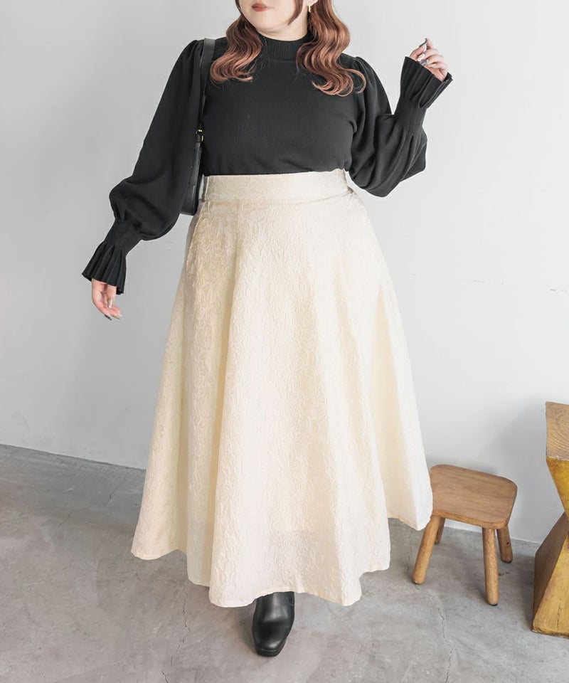 3Lサイズを着用しました! ウエストは後ろゴム仕様でフィット感がありながらも、締め付け感がなく快適な履き心地でした!パネル切替でふんわりと立体的なシルエットになり、気になる腰まわりもカバーしてくれます。 軽やかなジャガード素材に上品な花柄が施されていて、動くたびにふわっと揺れるのが魅力です◎軽い着心地だけど大人っぽく高級感のある印象を演出してくれます!シンプルなトップスと合わせるだけでコーデが華やかになり、きれいめにもカジュアルにも着こなしやすいのが嬉しいポイントです♪軽やかな雰囲気なので重たくならず、季節を問わず長く楽しめる1枚です! 足元はパンプスできれいめに仕上げるのはもちろん、スニーカーと合わせてカジュアルダウンするのもおすすめです!花柄スカートが好きな方や、上品な雰囲気のスカートをお探しの方にぴったりのアイテムです!