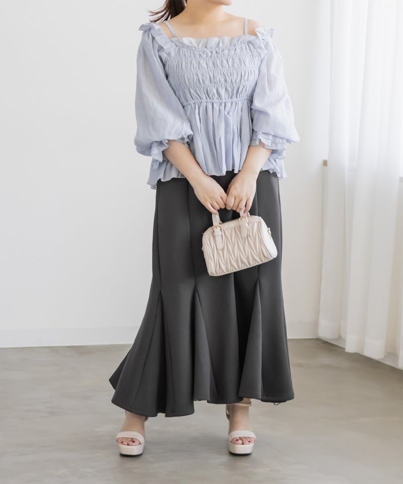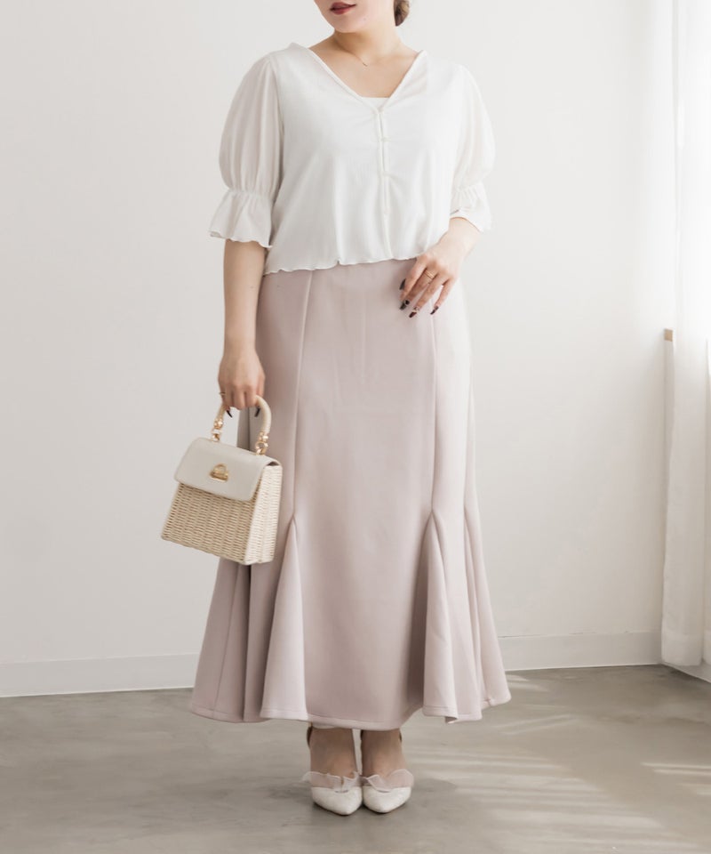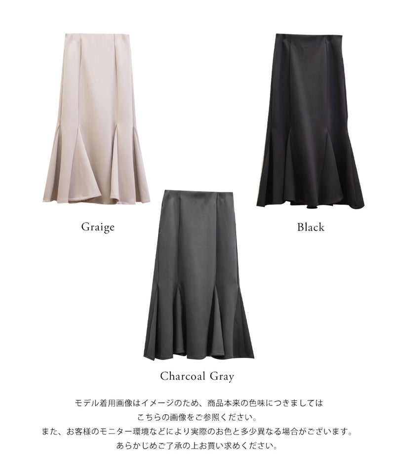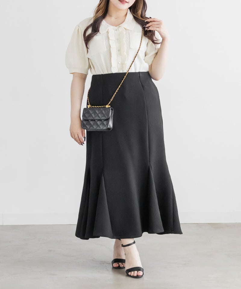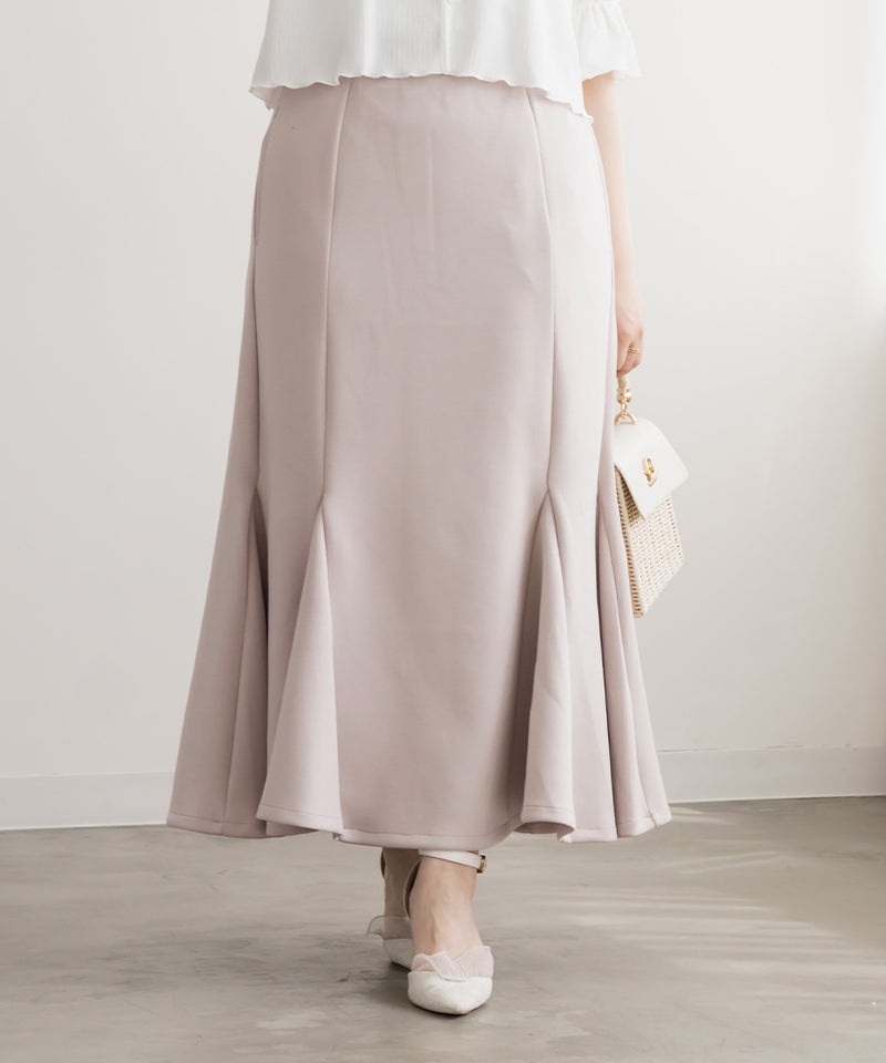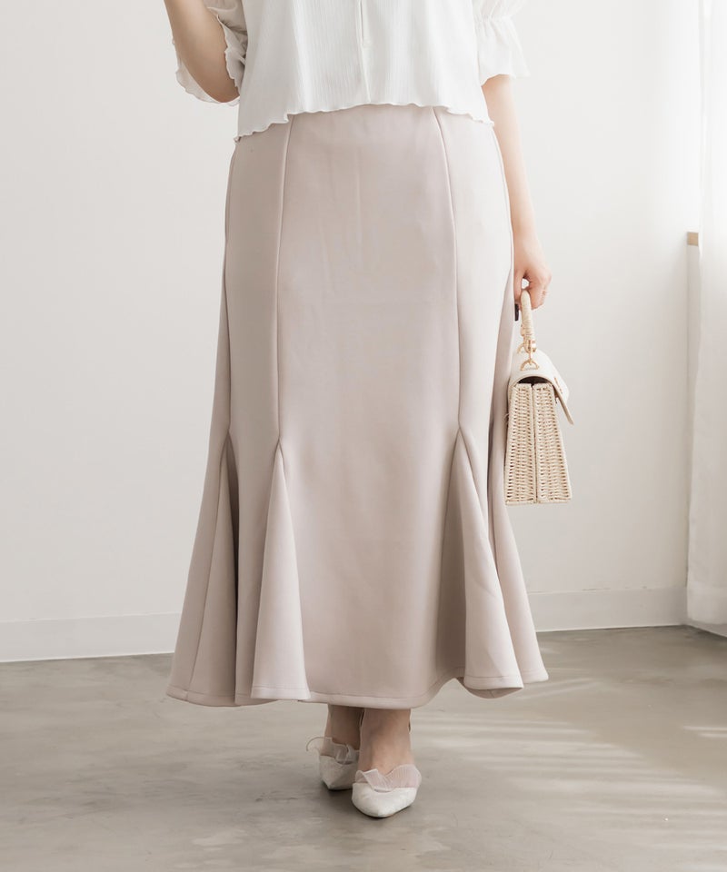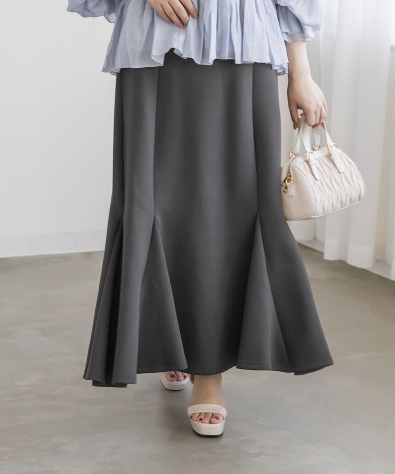 【design】ストレスフリーな着心地でスタイルアップできるマーメイドスカート。しっかりとフレアに広がる裾が女性らしさを格上げ。シンプルなデザインだからどんなトップスとも合わせやすい。【material】着心地らくちんな伸縮性のある素材。ボディラインを拾いづらく、美しいシルエットをつくるしっかりとしたハリのある生地感。オールシーズン着用可能な素材感です。