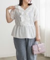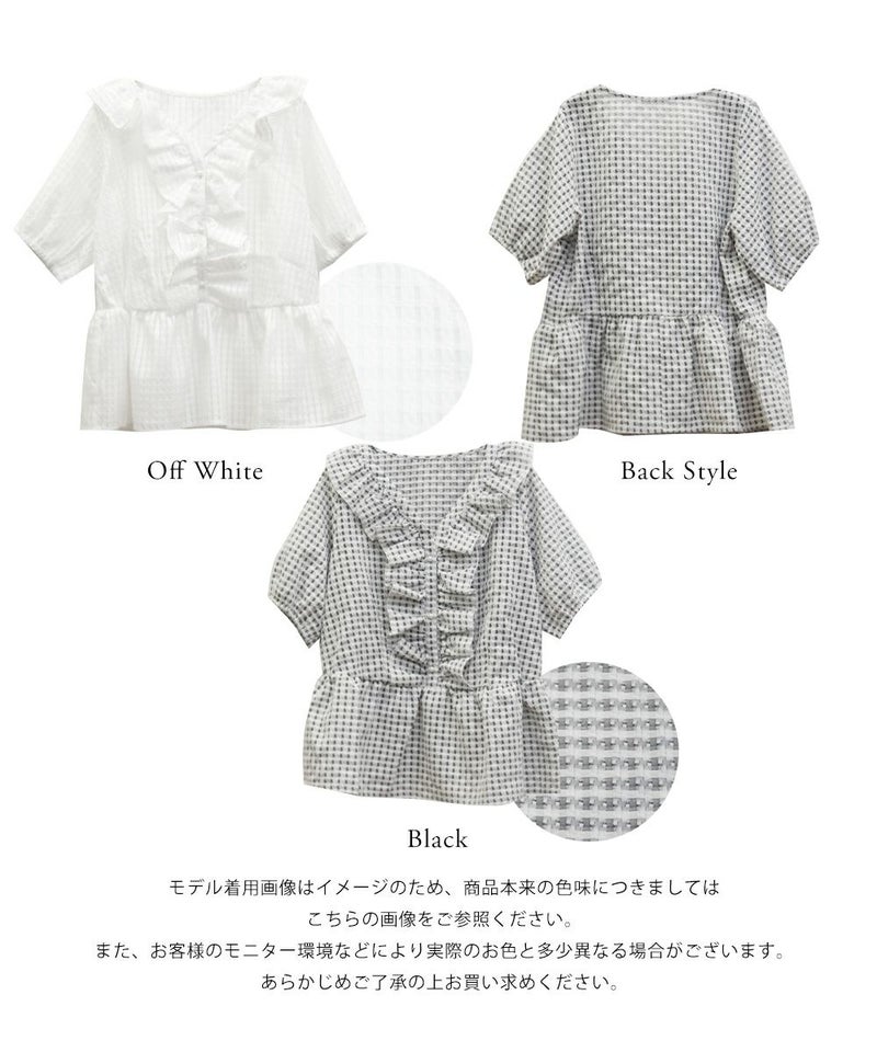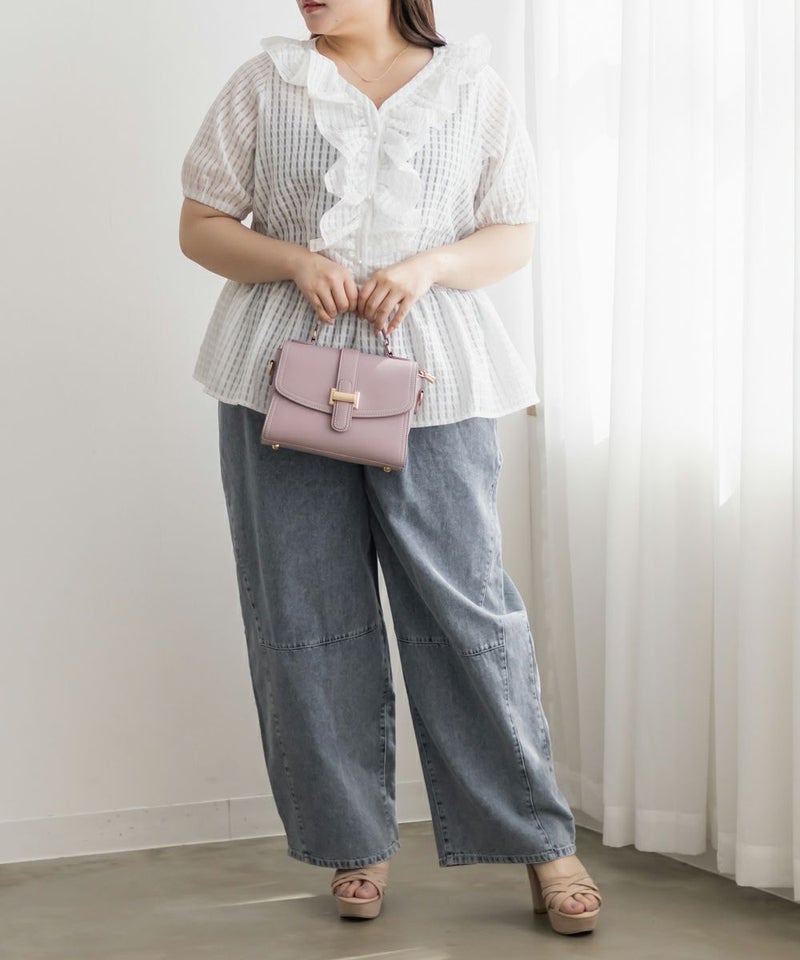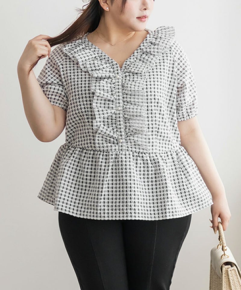ドビーチェックフリルブラウス 大きいサイズ クレット プラスサイズ 3L 4L ドビーチェックフリルブラウス
