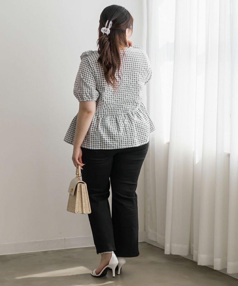 3Lサイズを着用しましたが、身幅にも腕まわりにもゆとりがあり、ちょうどよく着られました◎ふんわりとしたフリルのボリューム感が可愛くて、甘さはありつつも、落ち着いたチェック柄で大人っぽく着こなせます♪お腹まわりは自然とカバーしてくれるシルエットなので、インしなくてもバランスよく決まります!袖のふんわり感やペプラムのシルエットなど、後ろ姿まで抜かりなく可愛いアイテムです!