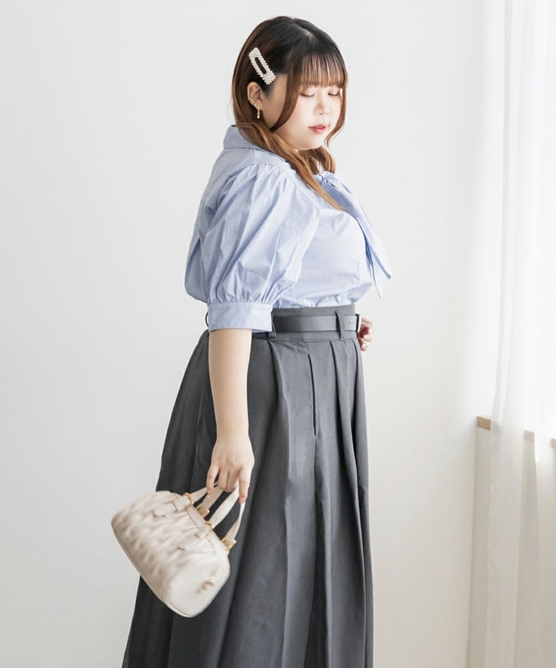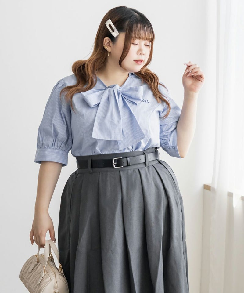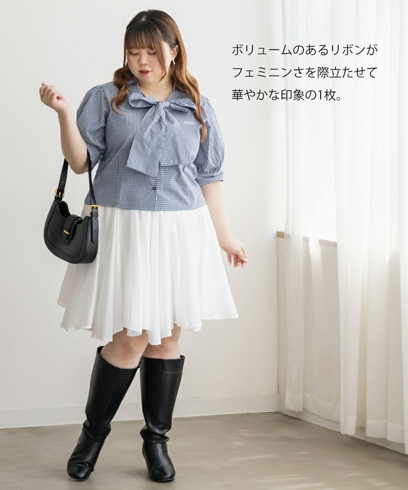 3Lを着てちょうどいい着心地でした。ボタンの開きも気にならず安心して着られました♪ さらっとハリのあるシャツ地で、上品な印象です!リボンタイは取り外しができるので、ガーリーにもカジュアルにも着回せて便利です◎ 肘まで隠れる袖も嬉しいです!デニムやスカート、どんなボトムにも合わせやすい万能ブラウスです。