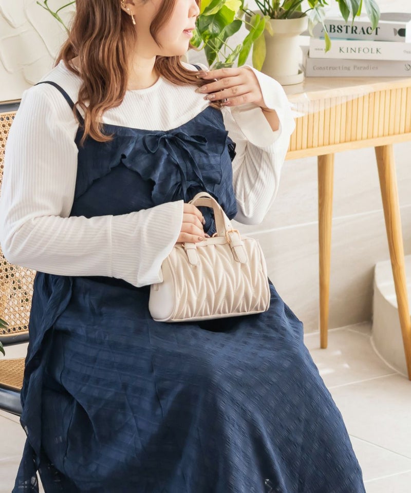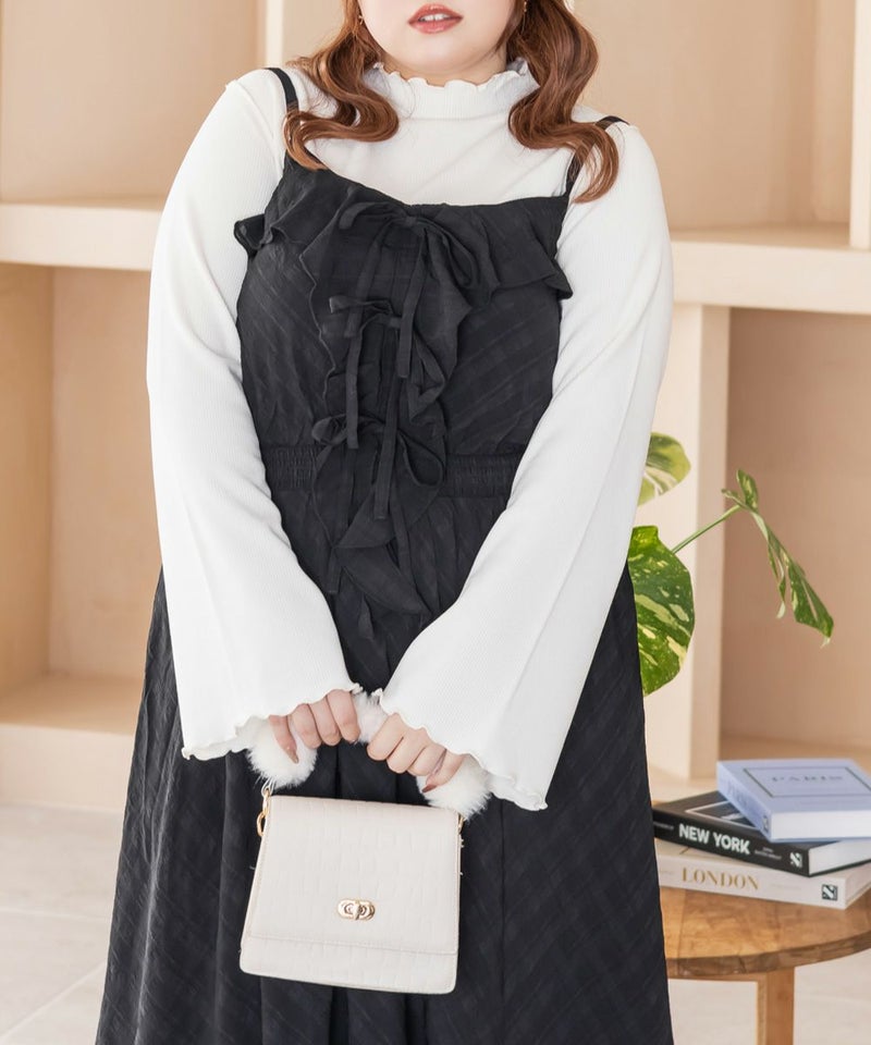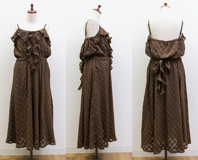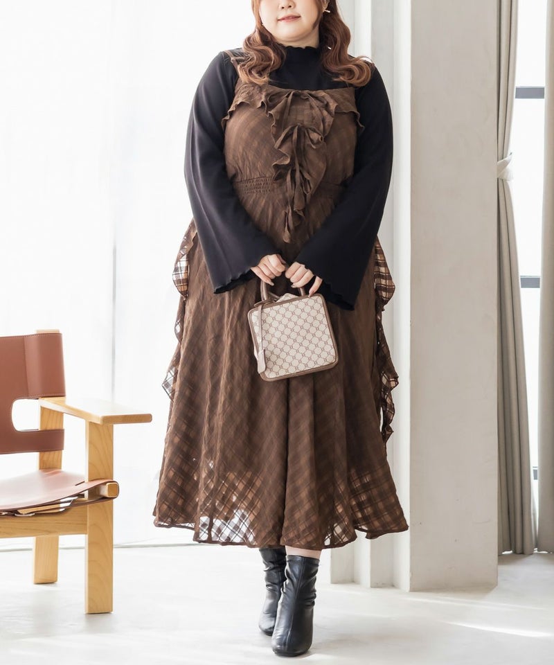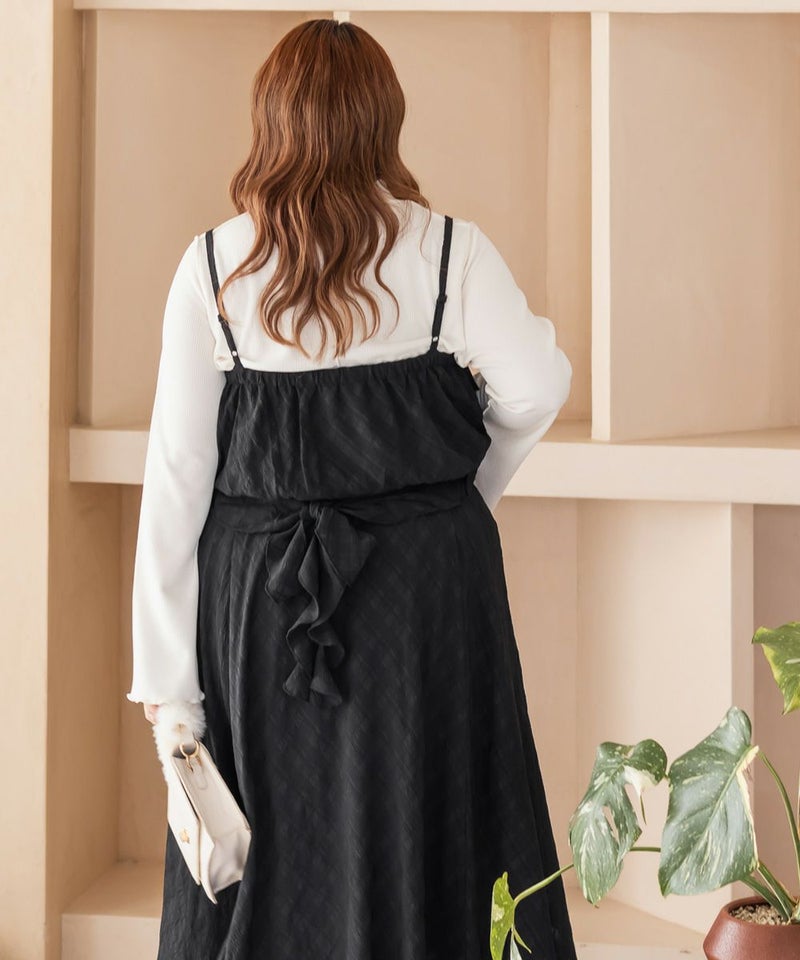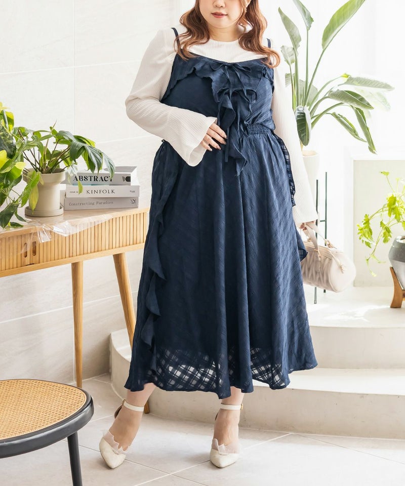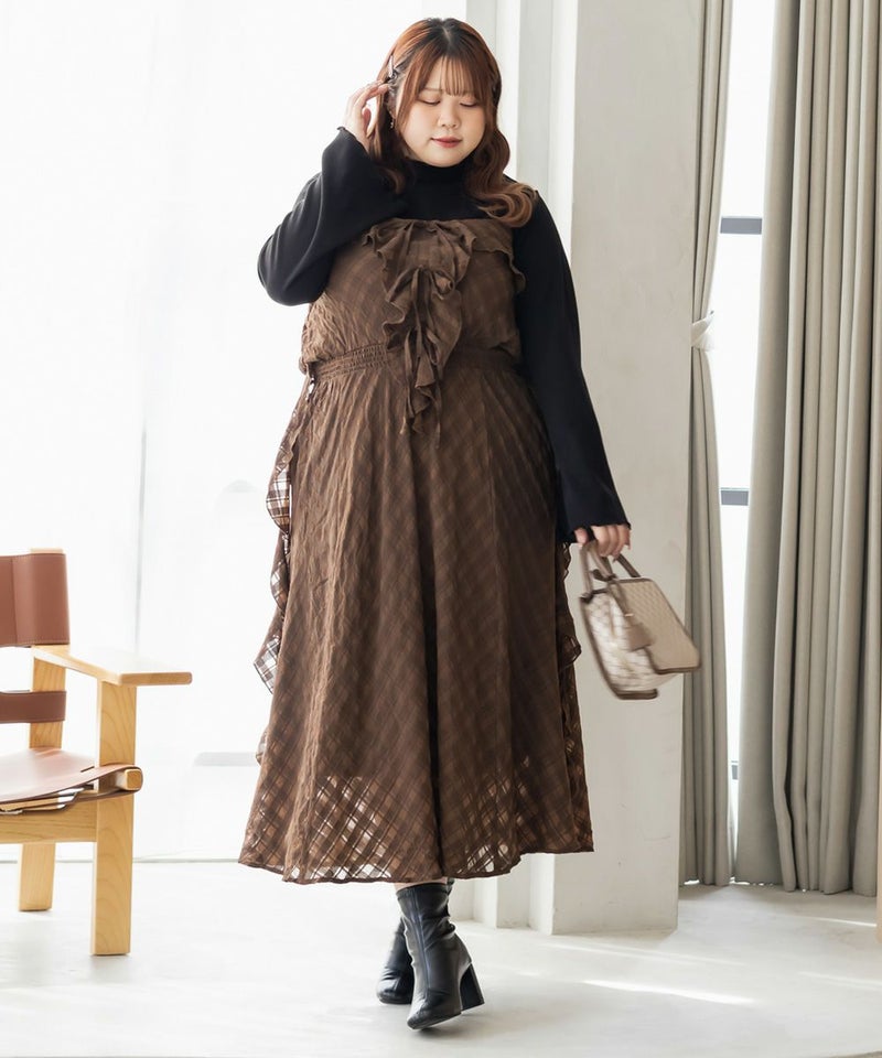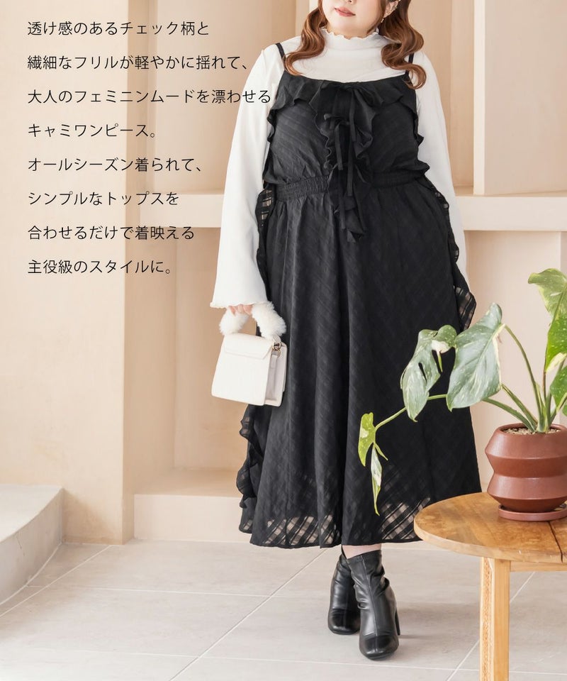 3Lを着て身幅に程よいゆとりがあるので、窮屈感なくリラックスして着られました。軽やかなシアーチェック素材で、さらっと着られるキャミワンピースです。アジャスターで肩ひもを調整できるので、身長に合わせて丈感を変えられるのも◎ サイドのフリルリボンは結び方次第で雰囲気を変えられるので、前で可愛く結んだり後ろで大人っぽくまとめたりとアレンジを楽しめます。ポケット付きで実用性もあり、普段使いにもぴったりです♪