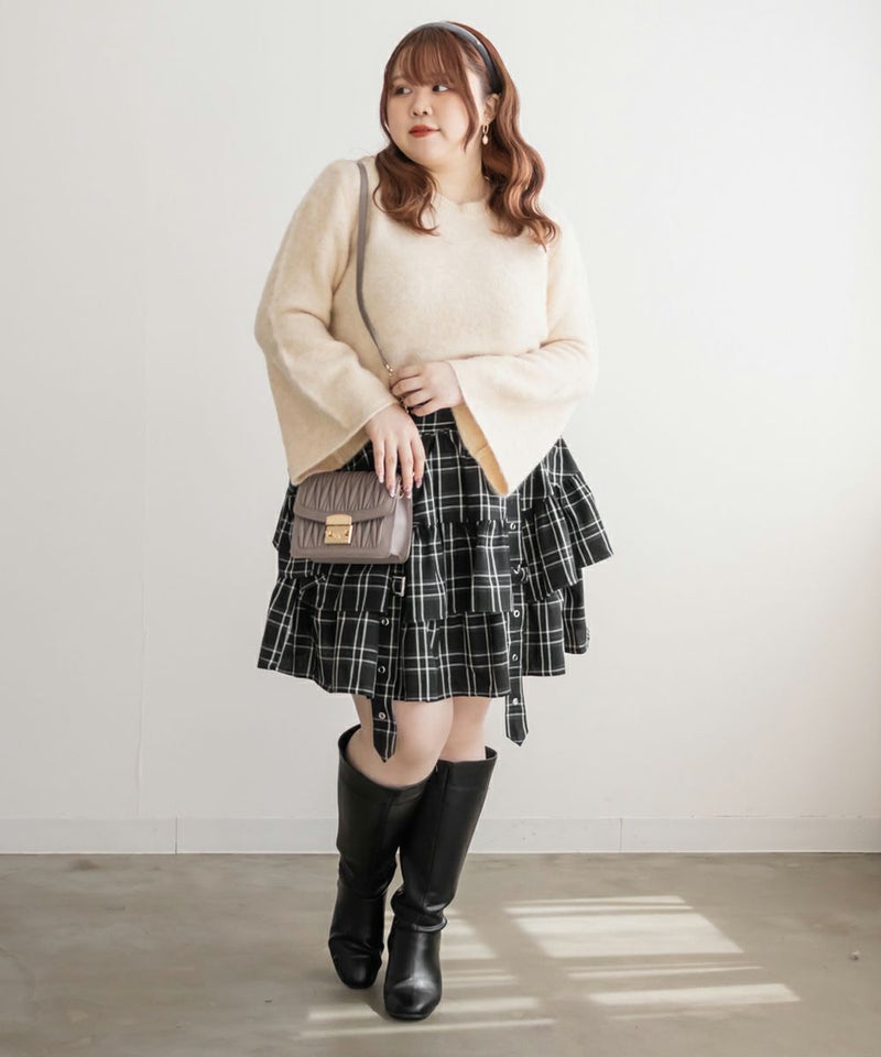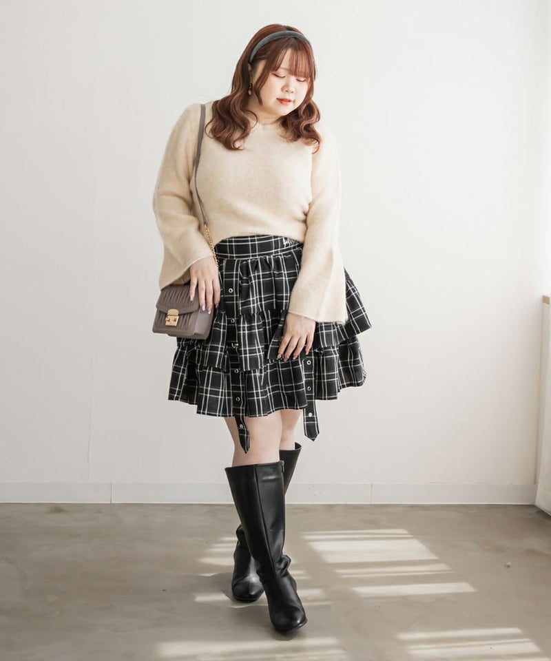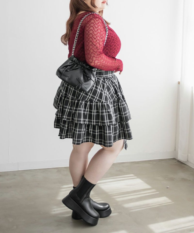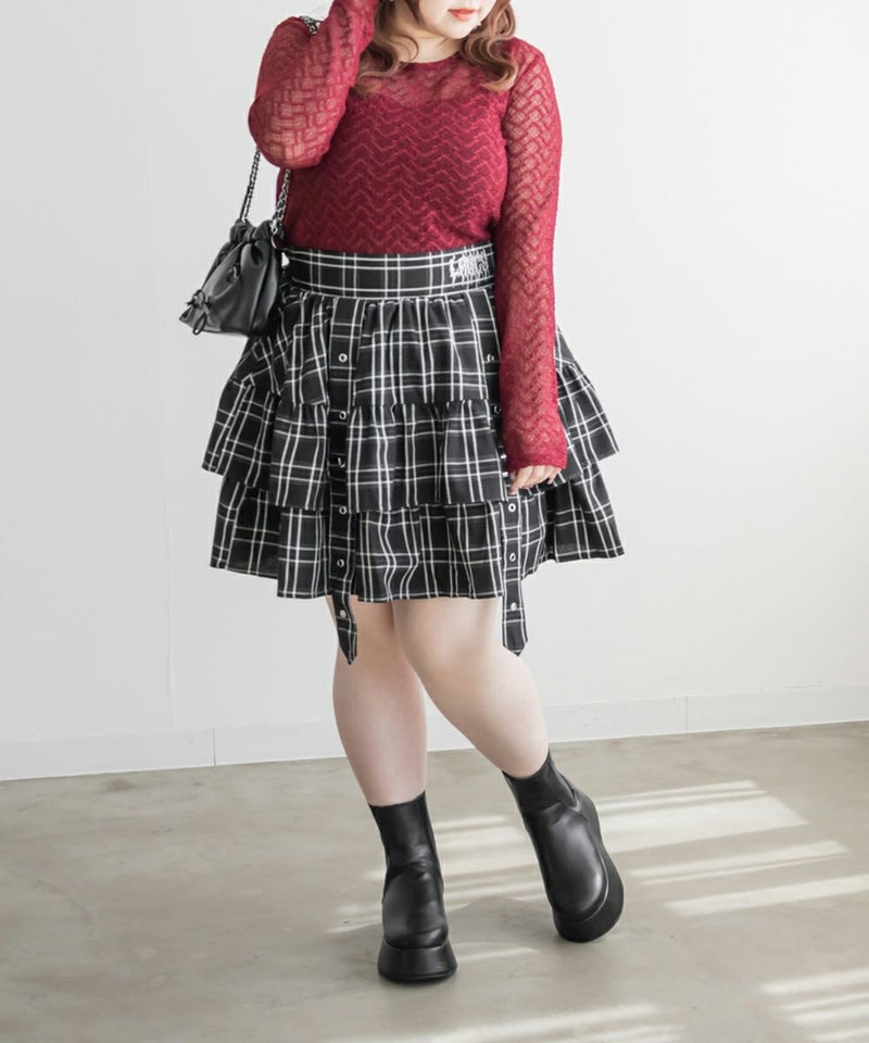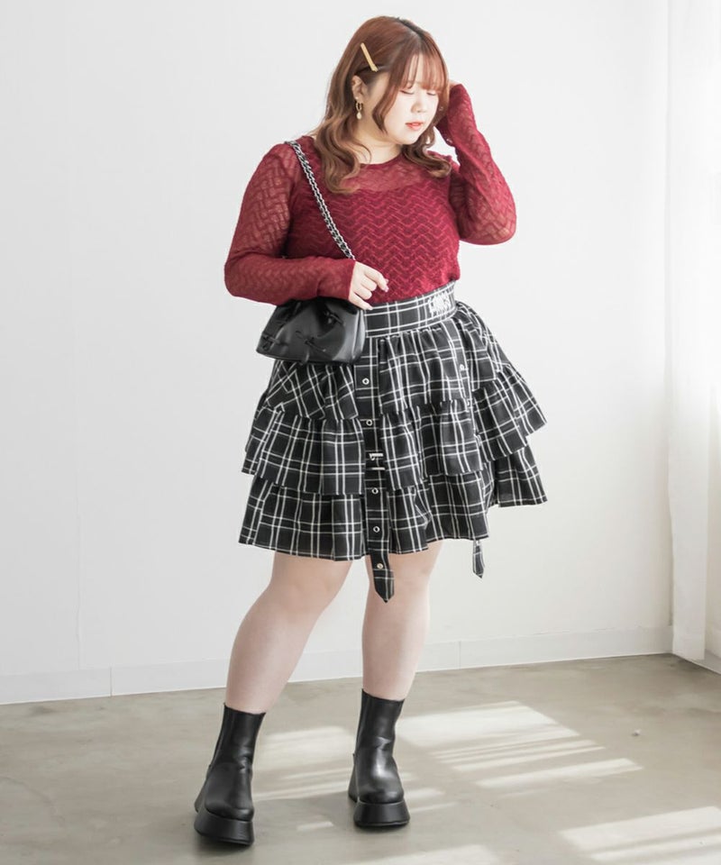 3Lサイズを着て、ちょうどよいサイズ感で着用出来ました◎後ろはゴムになっているので着脱もらくちんに出来ました!ティアードになっているので腰回りの肉感をすっきりカバーしてくれるのが嬉しい♪甘い雰囲気のミニスカートですが、ベルトデザインなど少し辛めの要素もあるので、ガーリー過ぎずに着こなせます!ブラウスやレーストップスと合わせて、ガーリーに仕上げたり、ギャルっぽいスタイリングもお勧めです!オールシーズン着まわせるスカートなので、たくさん着回ししたい1枚です!