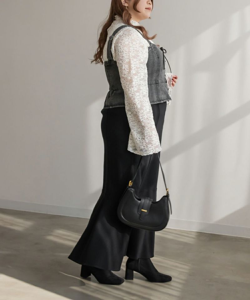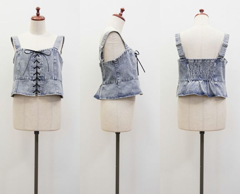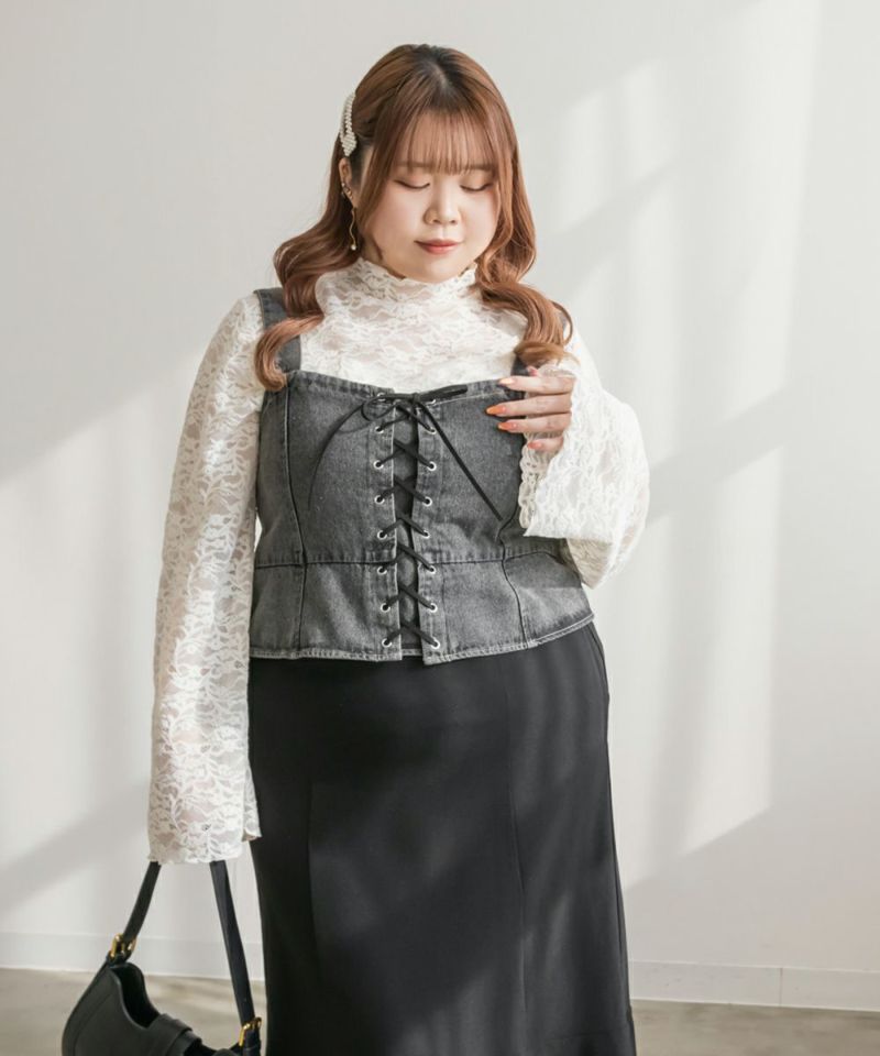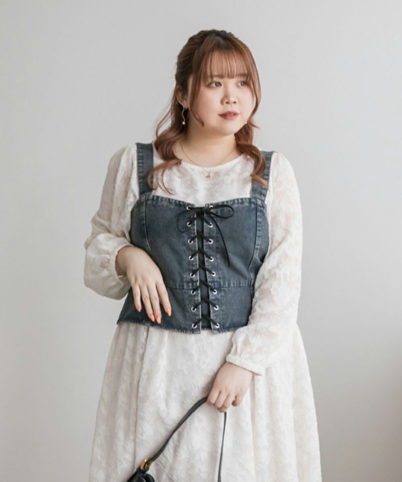 3Lを着てちょうどいいサイズでした!大きいサイズでこういったデザインのデニムビスチェはなかなかないので嬉しい1枚です!ボディラインを拾わないしっかりとしたデニム素材でフロントのレースアップリボンがメリハリがある印象で華奢見えします♪すっきりして見えるよう考えられたデザインなのが嬉しい◎後ゴムになっているからサイズの心配も少なく、楽ちんに来ることができます。心配な方はバストサイズの確認をお勧めします。ぽっこりおなかも気になりづらいペプラムっぽい切替が入っていて、おしゃれだけじゃない考えられた1枚です!オールシーズン着回しできて、ワンピにもスカートにもパンツにも、たくさんファッションを楽しめます!パンツとスカートはセットアップでも着られるので今っぽいスタイリングが楽しめます!