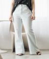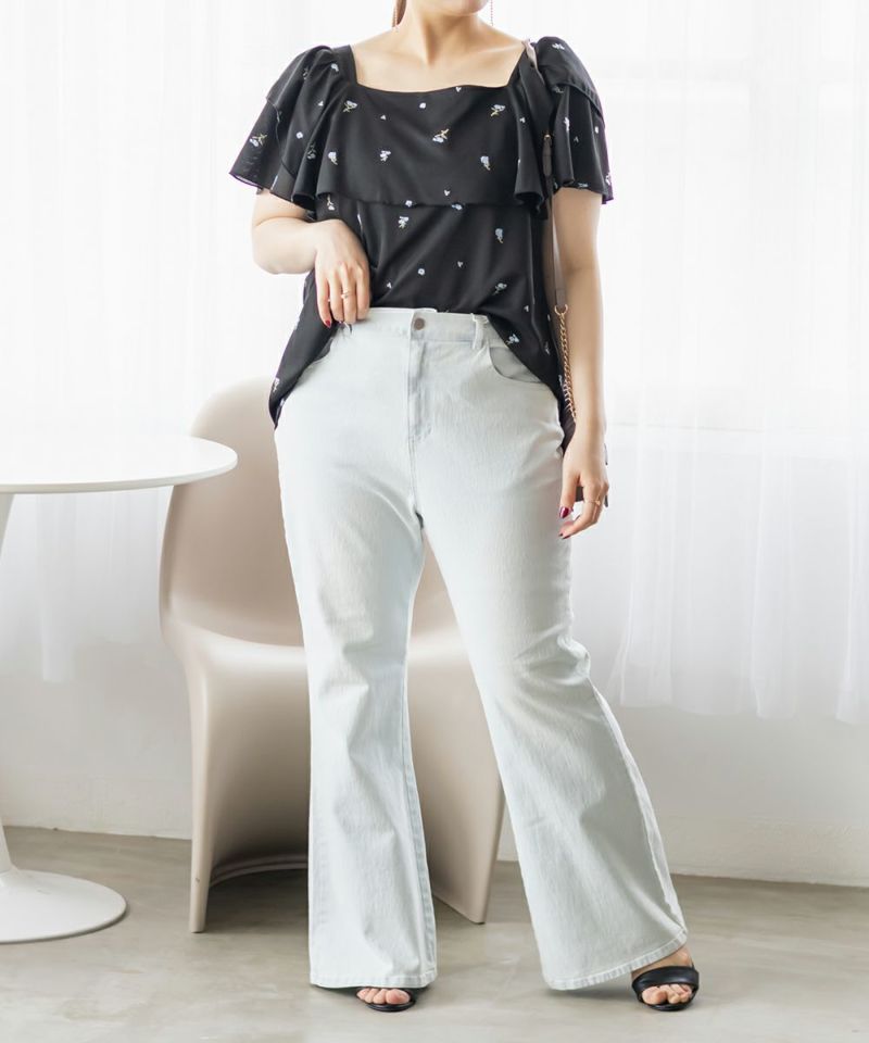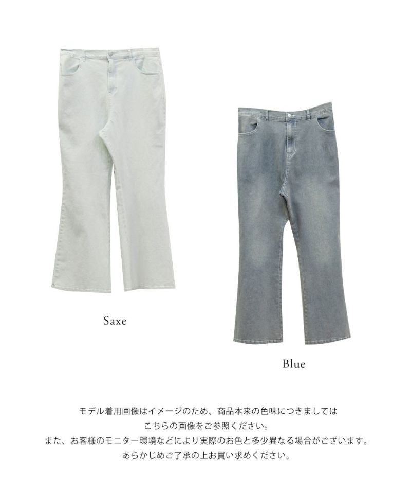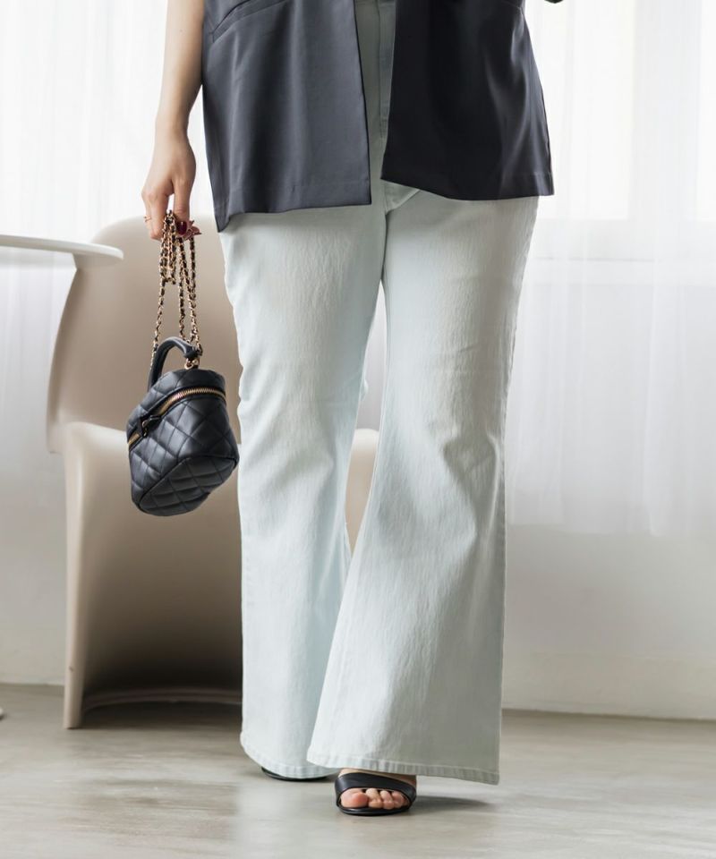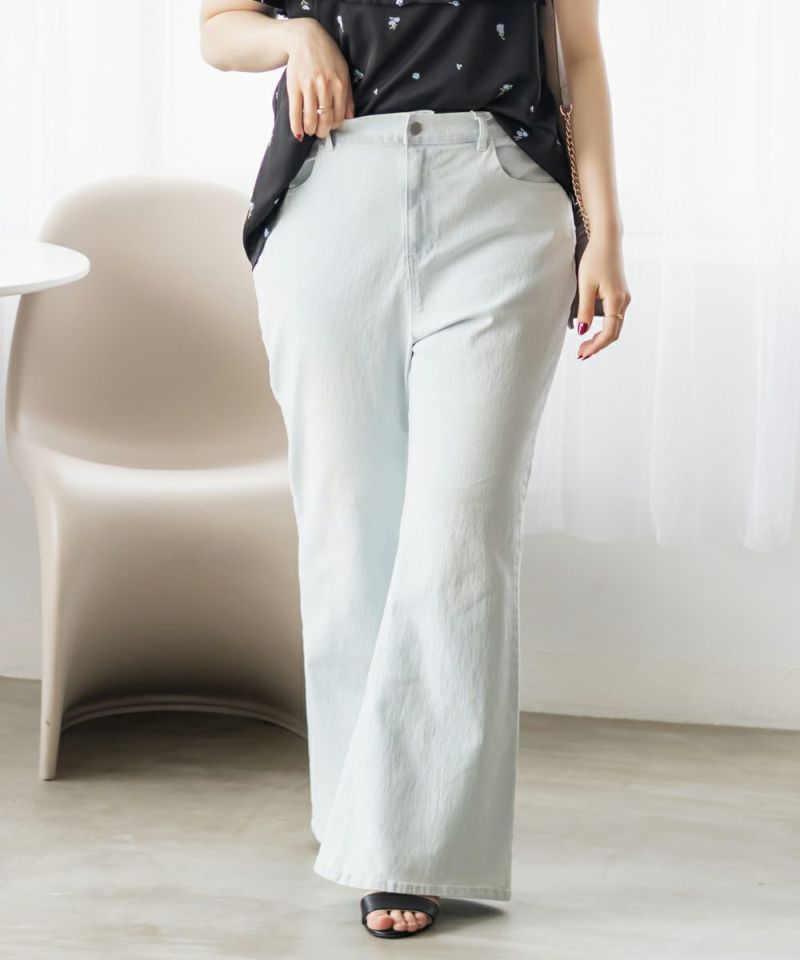 3Lサイズを着用してぴったりのサイズ感でした。ストレッチが効いていて窮屈感のない着心地です!デニムでもカジュアルになりすぎずに女性らしい印象になれるフレアシルエットで、美脚に見えるのでどんなトップスでも合わせやすい形なのが嬉しいです♪定番のデニムカラーでオールシーズン使えて1本あると便利なデニムパンツです。