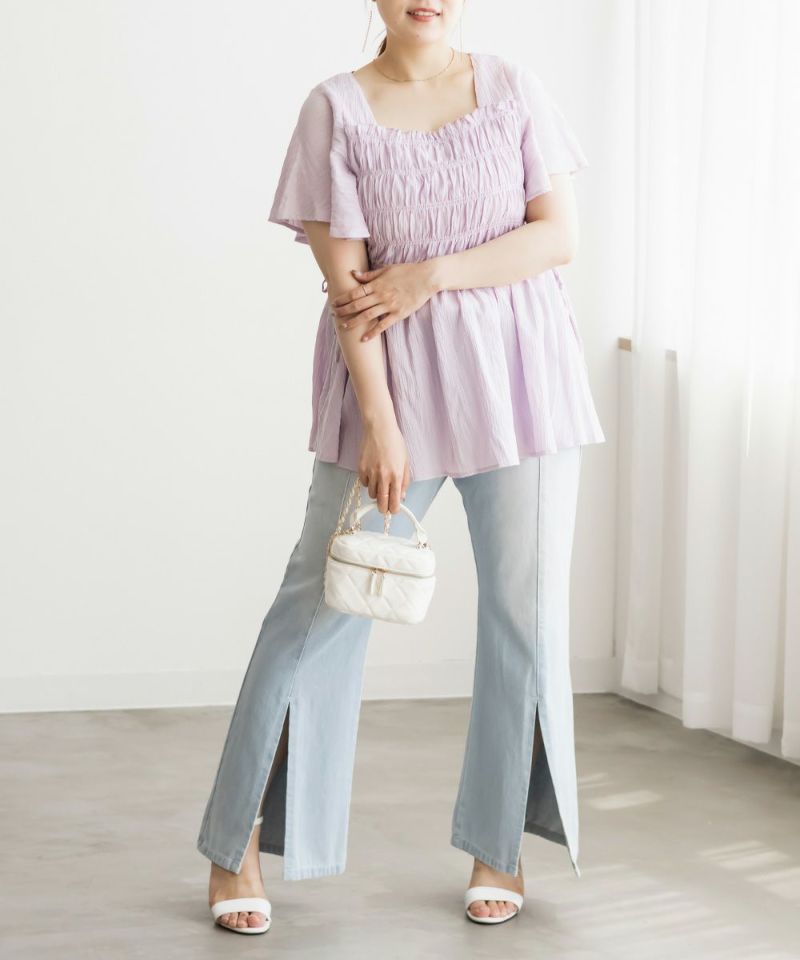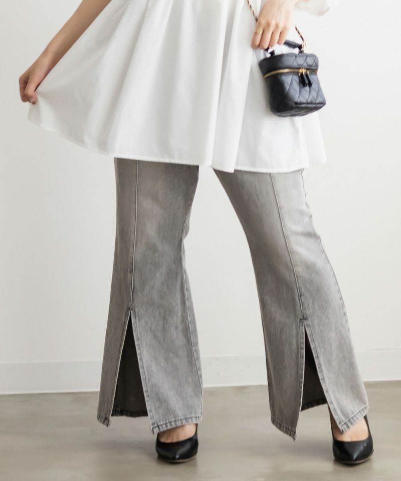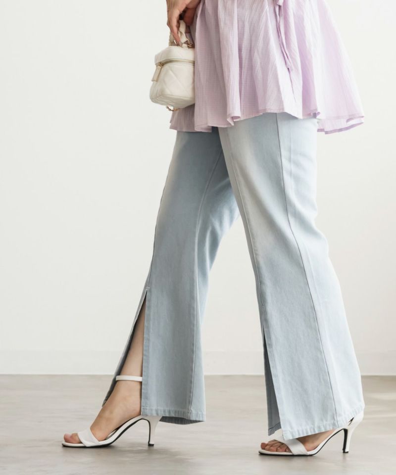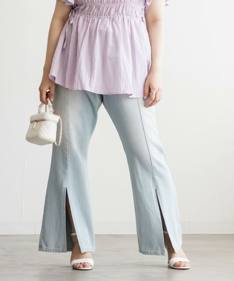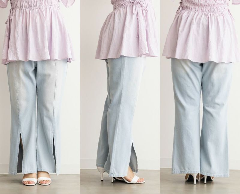 3Lサイズでジャストな着心地で、後ろゴムもありラクに過ごせました◎安定感もあり、トップスインもしやすいデザインです。フレアシルエットとフロントスリットの効果で、脚がすっきり見えてスタイルアップして見えました!少し薄手のデニム素材で、フィット感がありながらも窮屈さはなく、快適な穿き心地です。シンプルながらトレンド感のある1本で、カジュアルコーデにも大人きれいめコーデにも合わせやすい万能パンツです♪