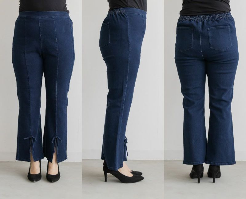 LLを着てちょうどいいサイズでした。股上が浅くなくしっかりとあって、ウエストゴムで生地自体の伸縮性もあるので安心感のある履き心地◎足部分もしっかりストレッチがあるので動きやすいです◎リボンとスリットがポイントのデザインで、デニムでもカジュアルになりすぎずに女性らしい印象になれます。太もも周りすっきりで裾がフレアになっていて、穿くだけで美脚になれちゃいます!オールシーズン使えるので、1本あると便利なデニムパンツです。