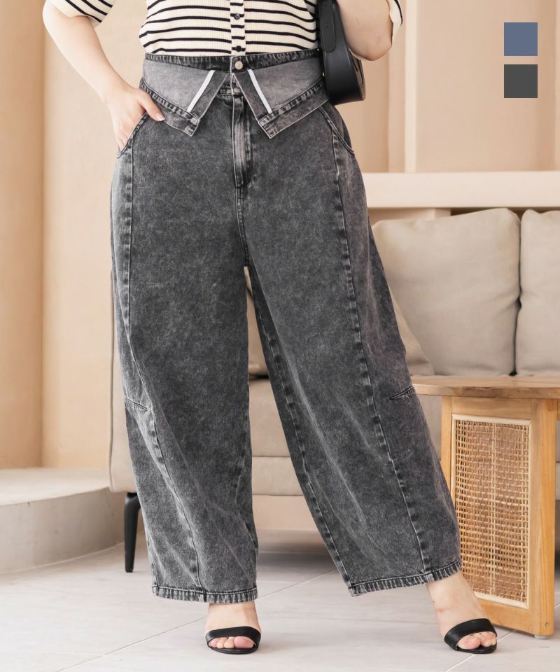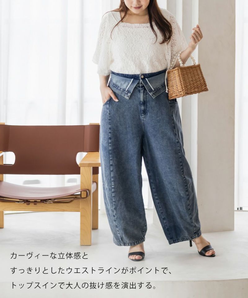 3Lサイズを着用して、ラクに動けました!ダブルウエストデザインが程よくお腹まわりをカバーしてくれて、インスタイルでおしゃれ見えします♪ハイウエストでかなりスタイルアップして見えて、トップスインとの相性も抜群です!もちろんインせずに着ても可愛いデニムシルエット・カラーなので着回し力も高いです。脚のラインを拾わないカーブ感で、簡単に今っぽい雰囲気になれる1本です!