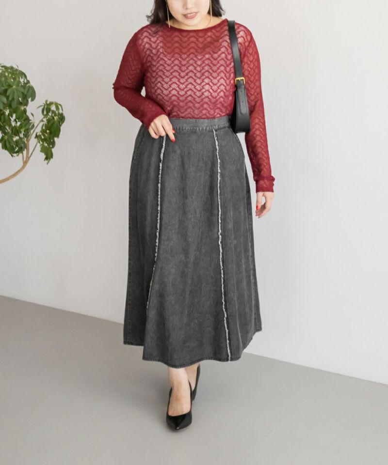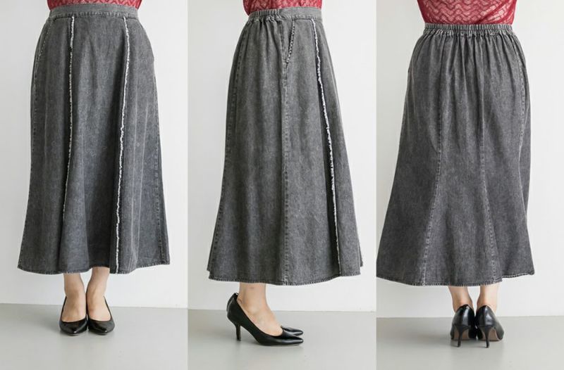 3Lサイズを着用てちょうどよいサイズ感でした!後ろゴムで窮屈感無く着脱も問題なくできました。縦に入ったフリンジが、すっきりと華奢に見せてくれます。カジュアルなデニム素材ながら、女性らしいマーメイドラインのスカートにデザインされていて、幅広いイメージで着こなせます!軽いデニム生地なのでごわつきにくいのも嬉しい!カジュアルコーデからキレイめまで合わせられるのでトップスを選ばず着用していただけます!