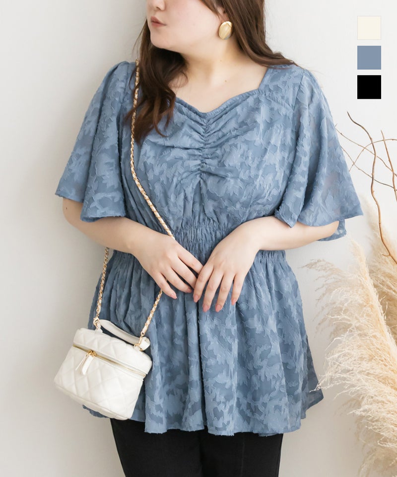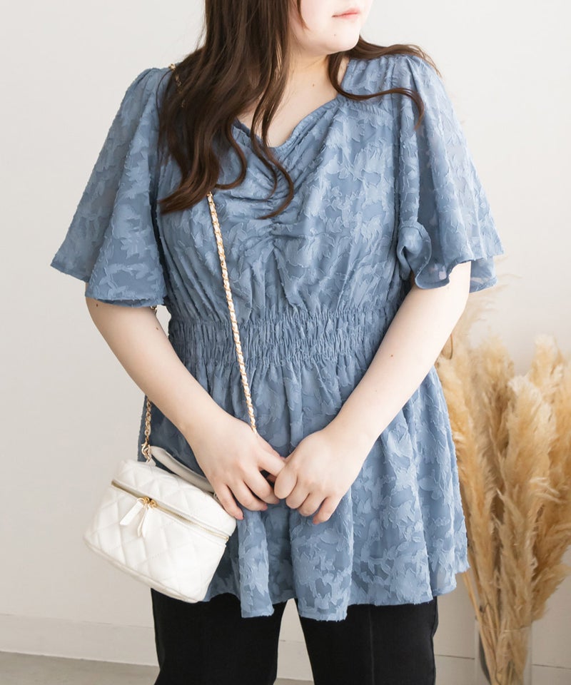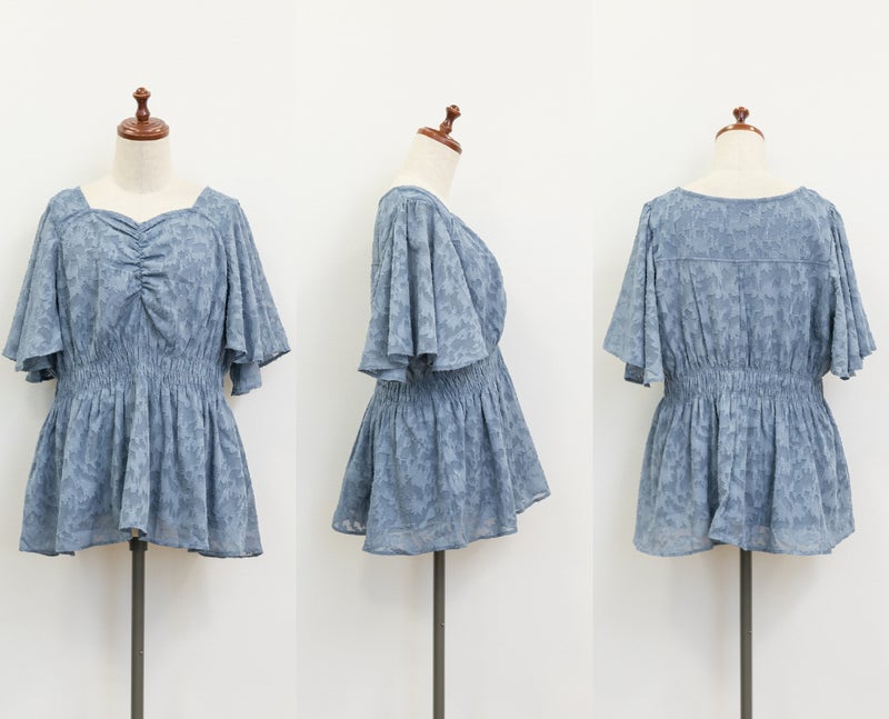 ブルーの3Lを購入しました。いつも4Lにすることが多いので迷いましたが、仕上げ寸法からウエストゴムがしっかり伸びてくれそうと予想して、広がって見えにくいようにと3Lに決定。丁度良い着心地です。 シアーな花柄生地でペプラムのひらっとしたシルエットですが、可愛さに振り過ぎず、ブルーの色味もあって落ち着いた印象で着やすいです。 さすがCLETTEさんと思うデザインで、顔周りがすっきり見えるハートネックと、二の腕をしっかり隠してくれるフレア袖、更にウエストゴムでくびれが出現するので、着痩せ効果バッチリです!また、超肥満なのに胸カップが小さい少数派体型の私としては、くびれの出現と胸元ギャザーによってなんとなく胸もちょい盛れているように見えます。 重ね着億劫な夏に1枚でバッチリ決まるこのブラウスはとても心強いです。